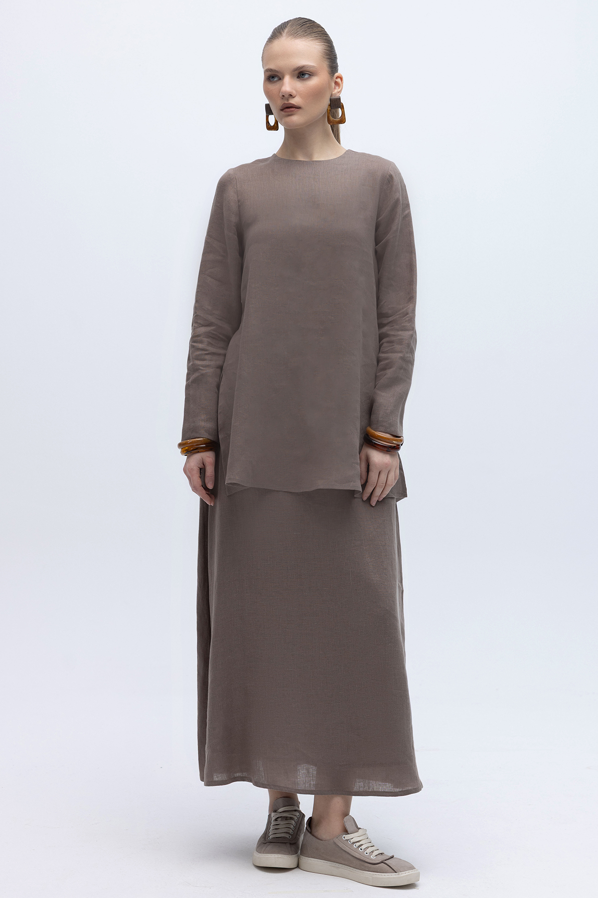 Uzun Kollu Düz Renk Keten Tunik Cherry