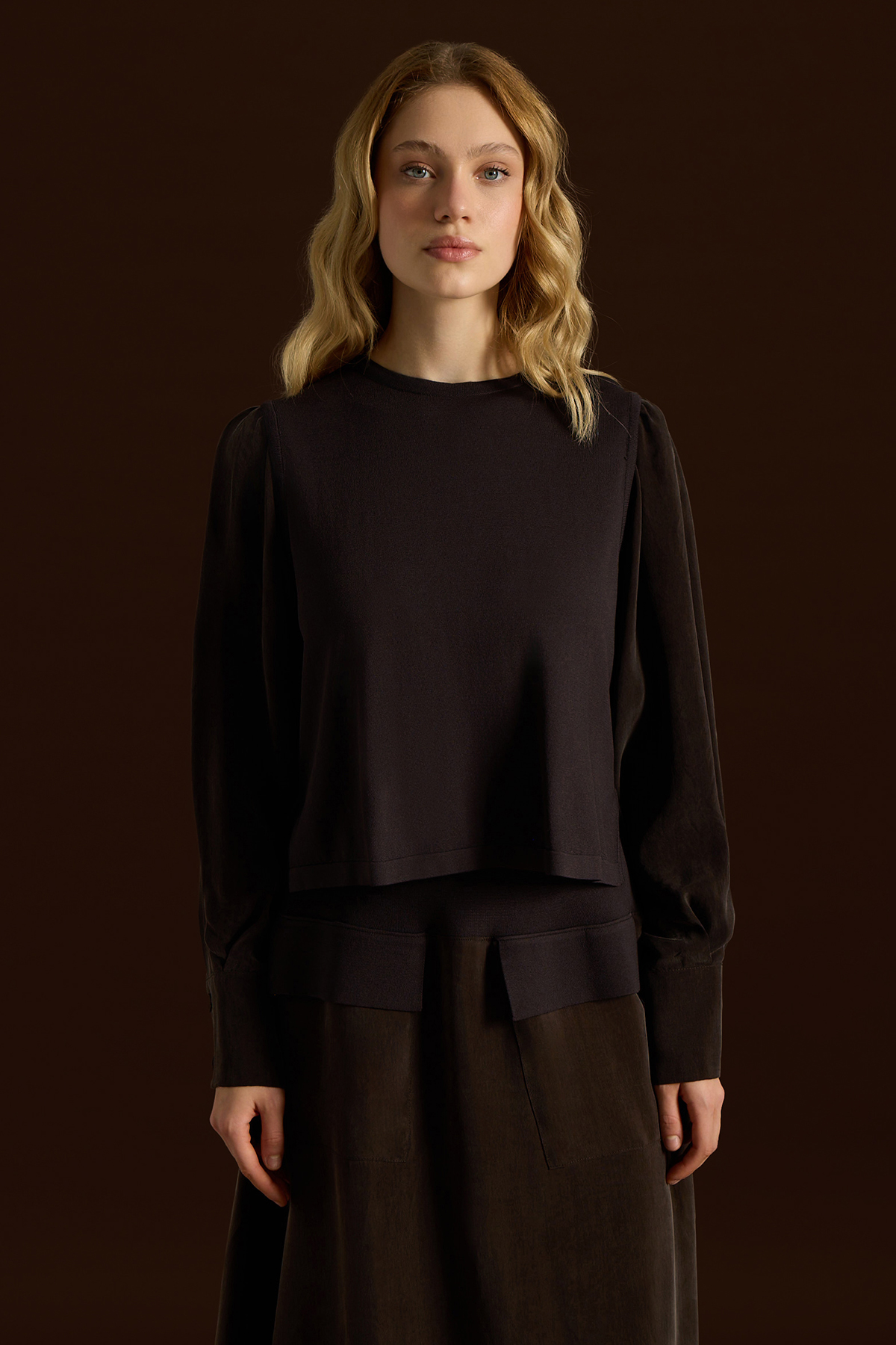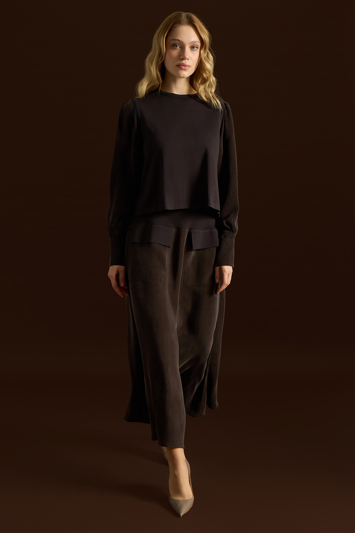 Balon Cupro Kollu Triko Tunik Kahverengi