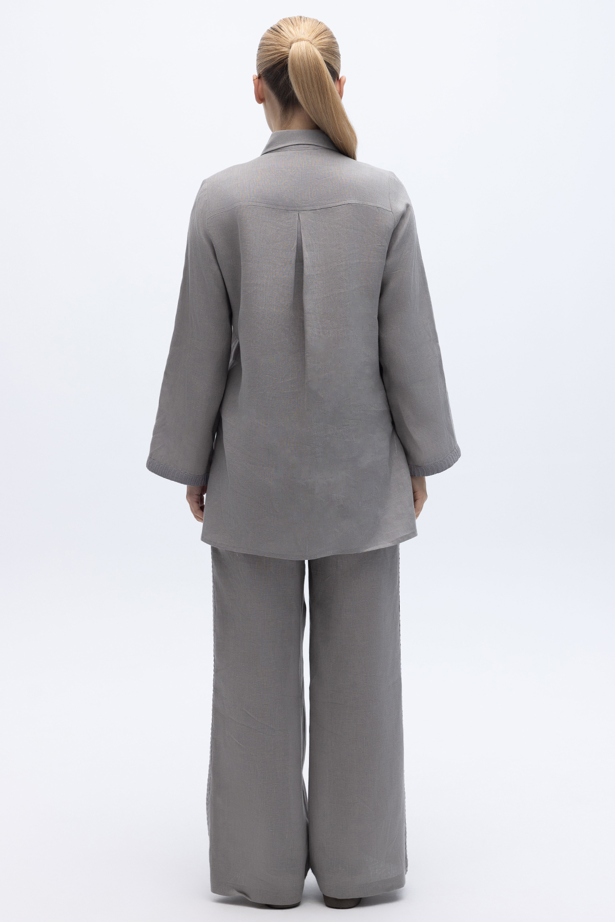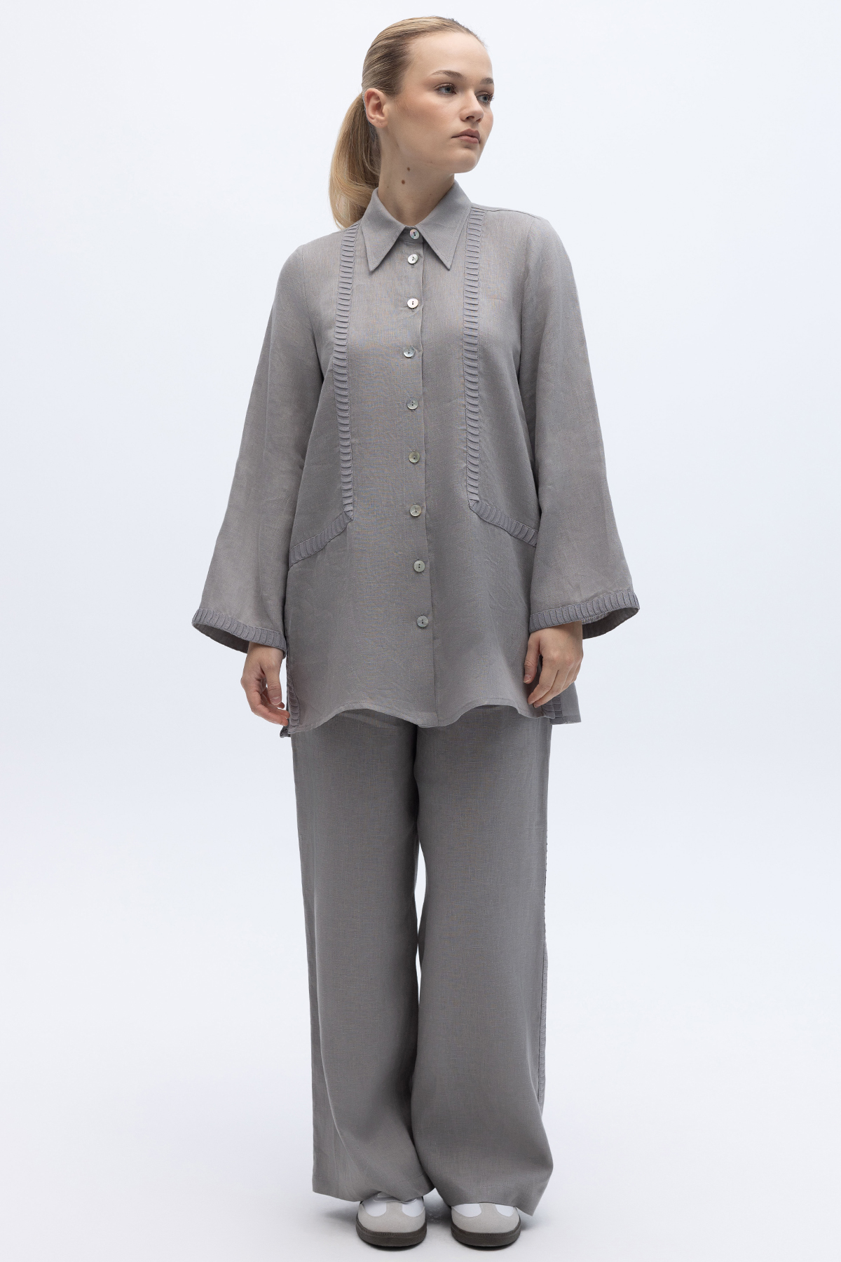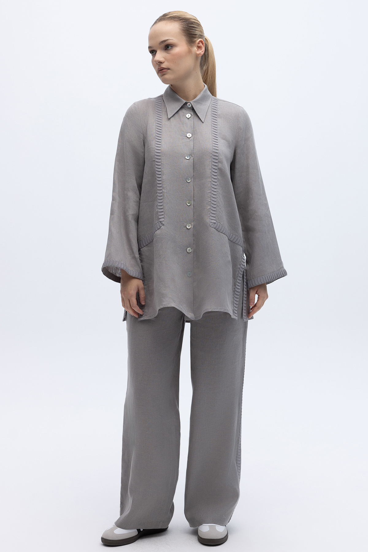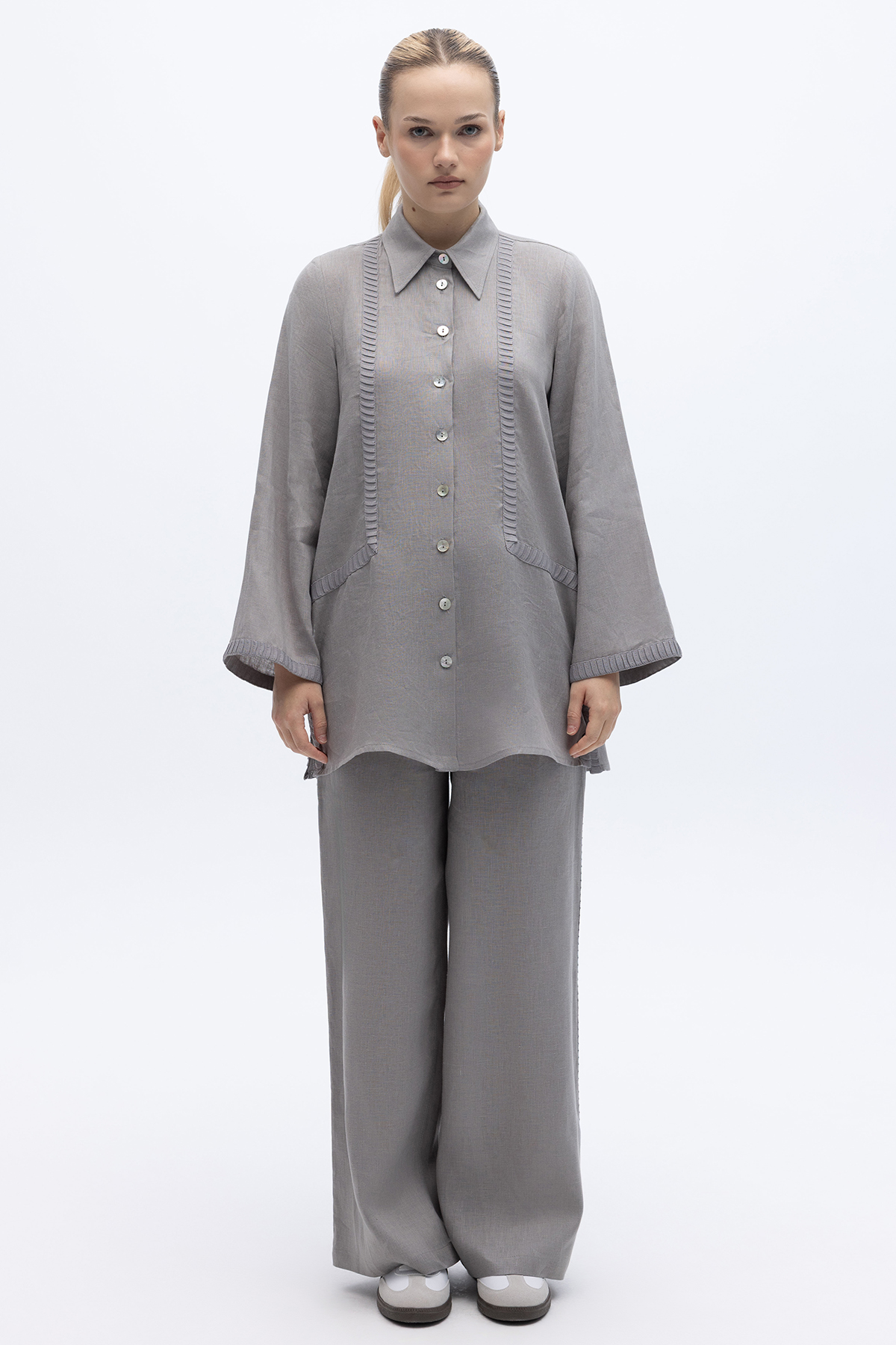 Bekletme Detaylı Bol Paça Keten Pantolon Gri