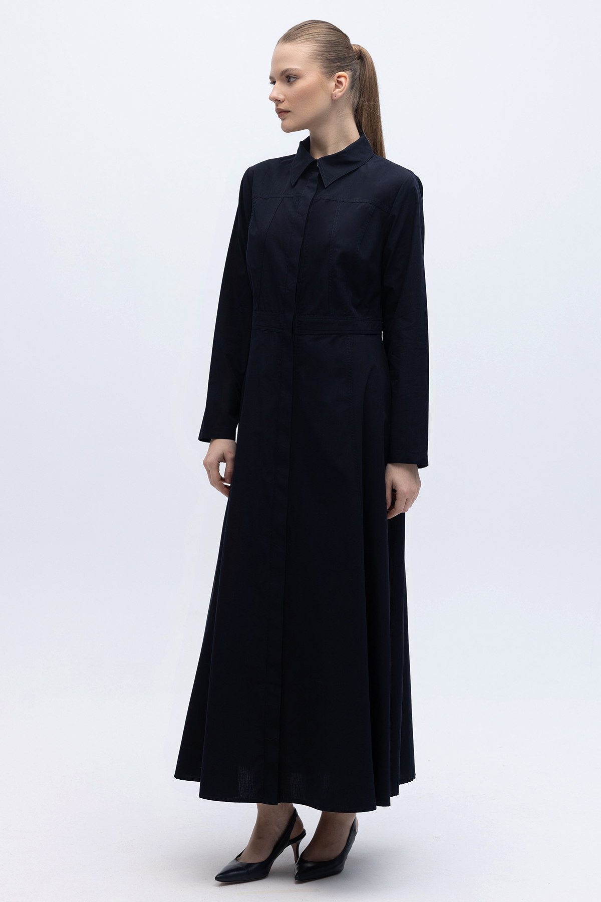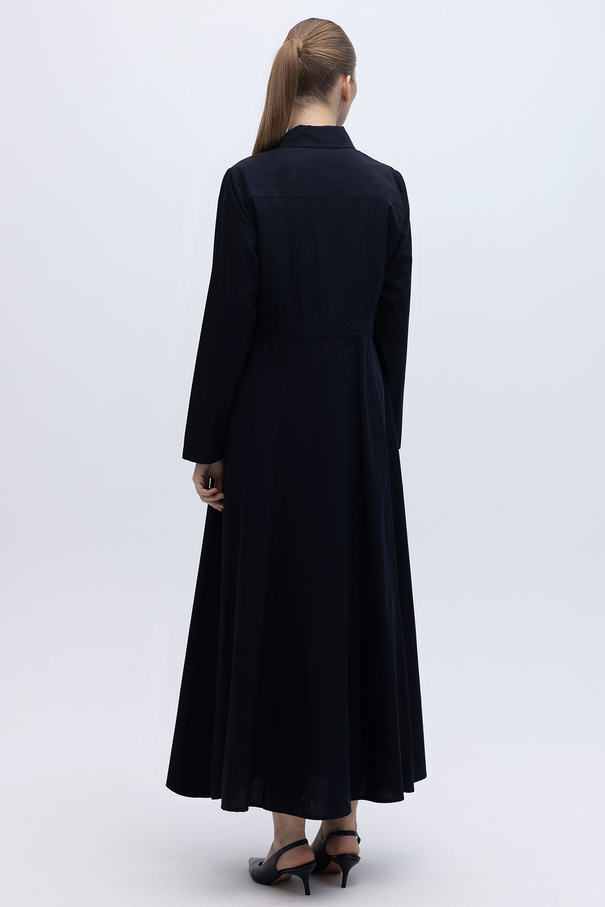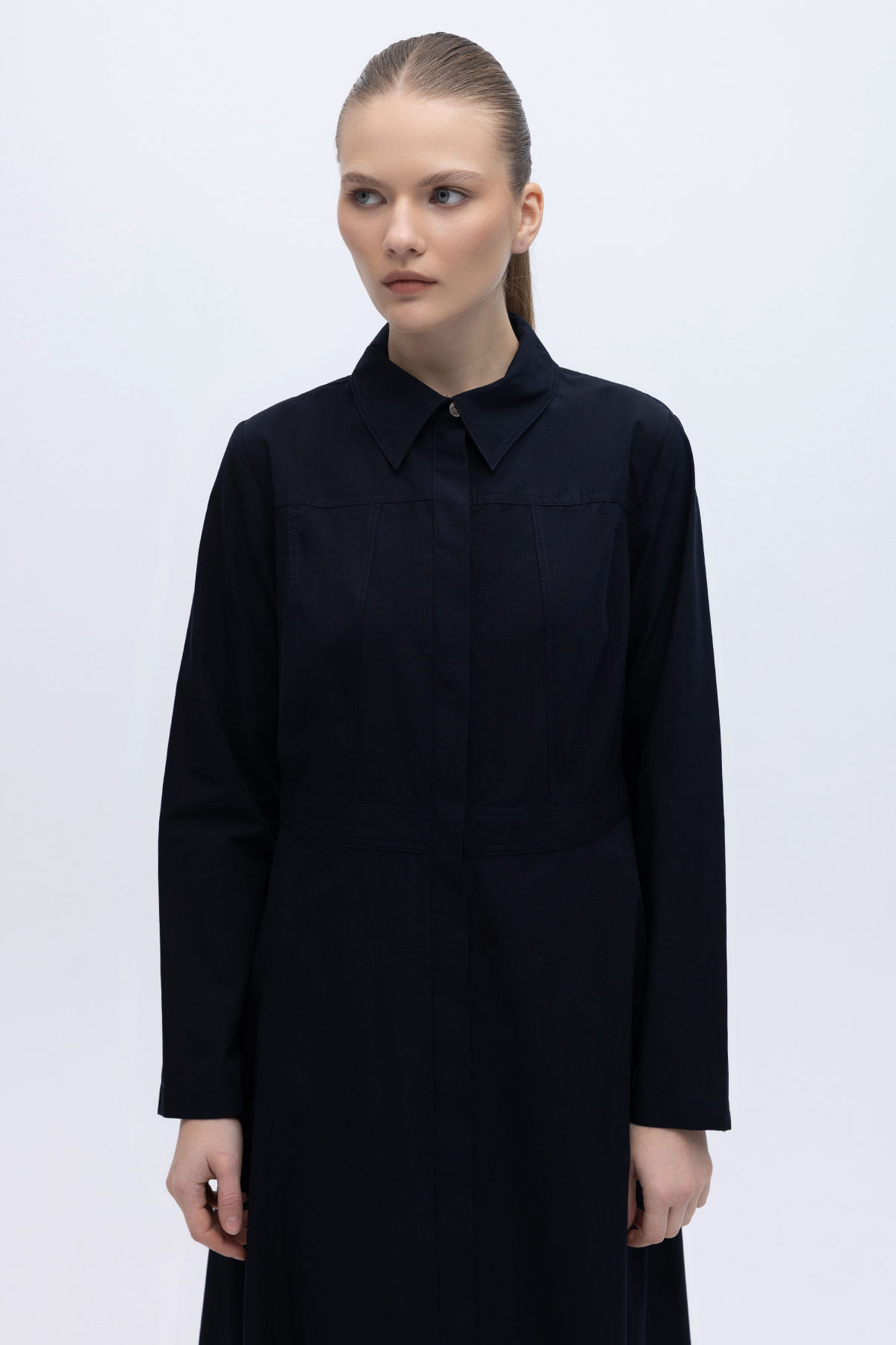 Belden Oturmalı Uzun Kollu Poplin Elbise Lacivert