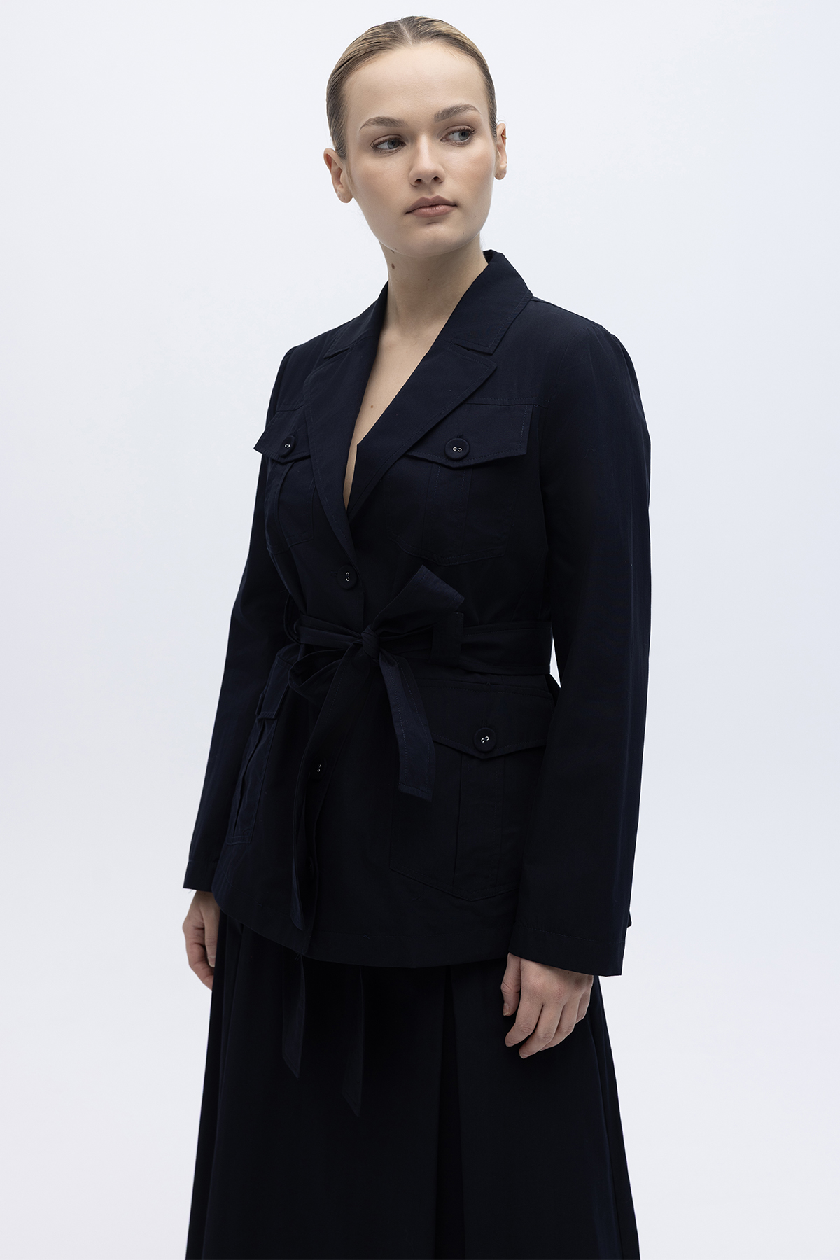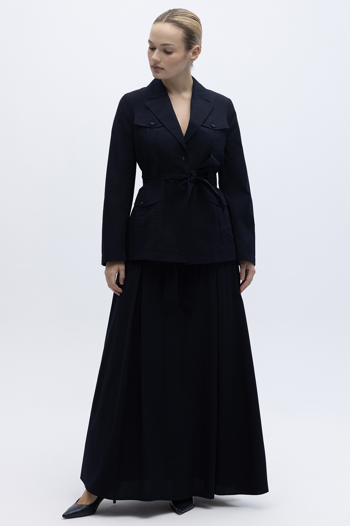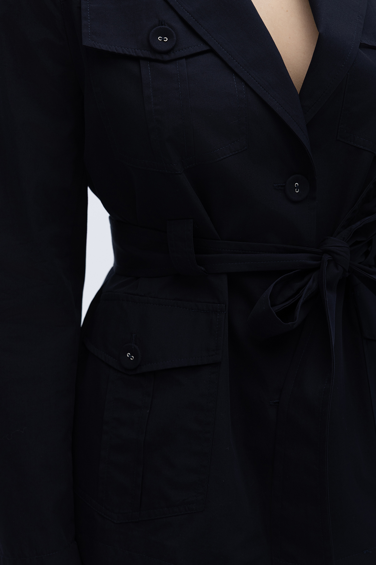 Beli Kuşaklı Cepli Poplin Ceket Siyah
