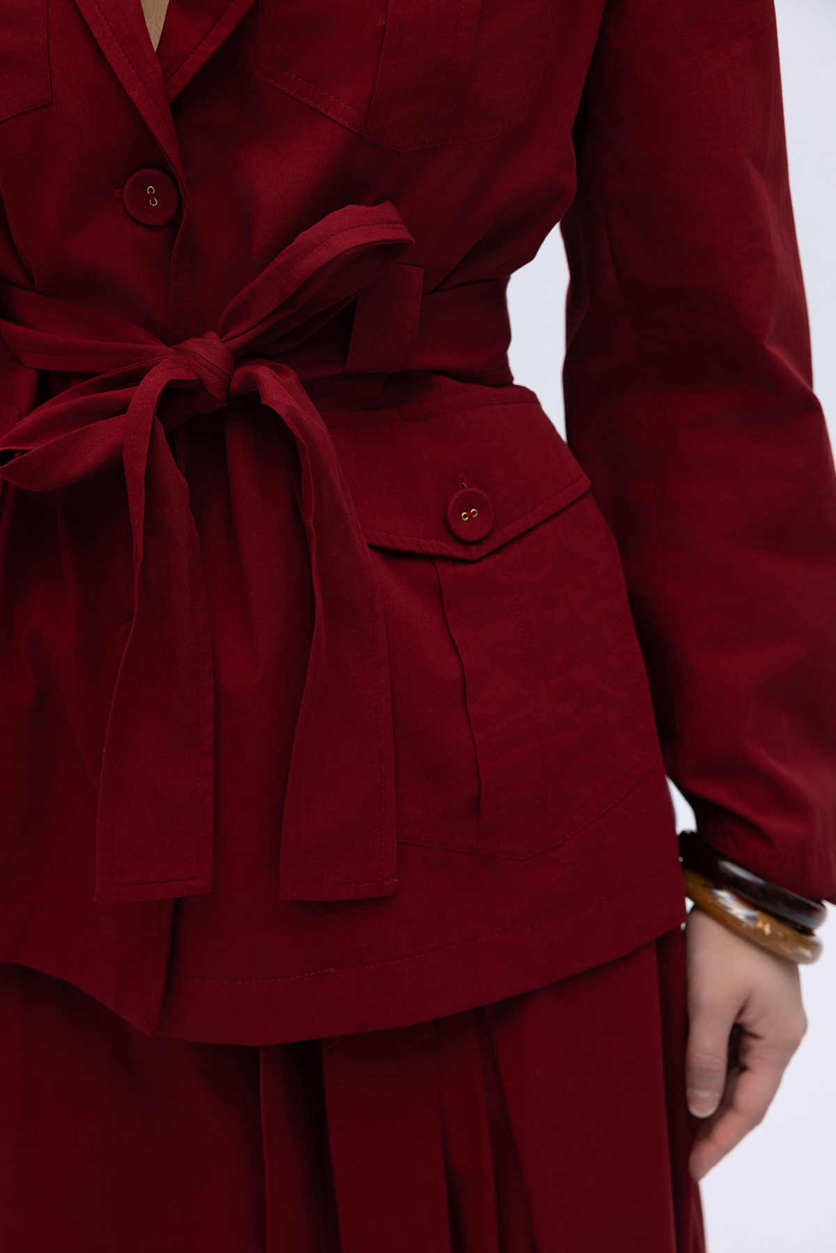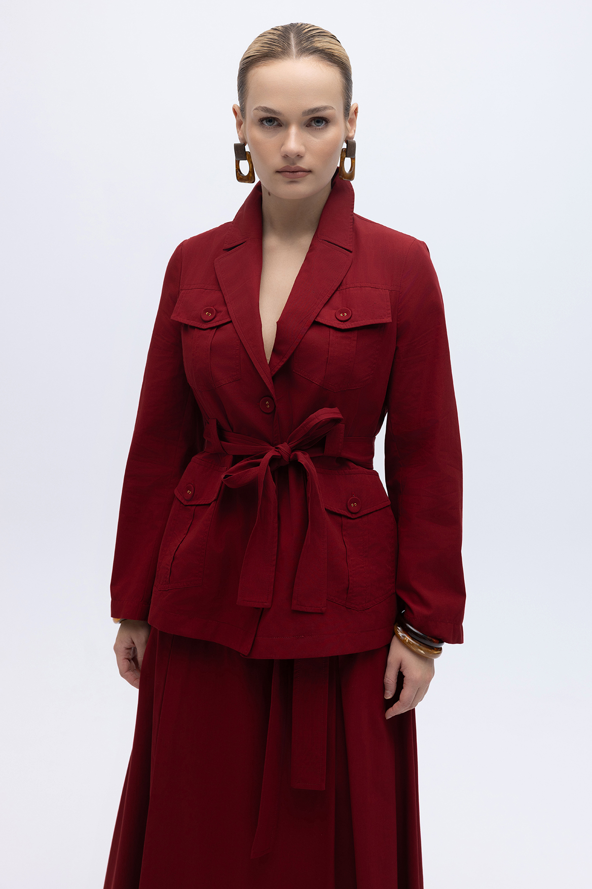 Beli Kuşaklı Cepli Poplin Ceket Cherry