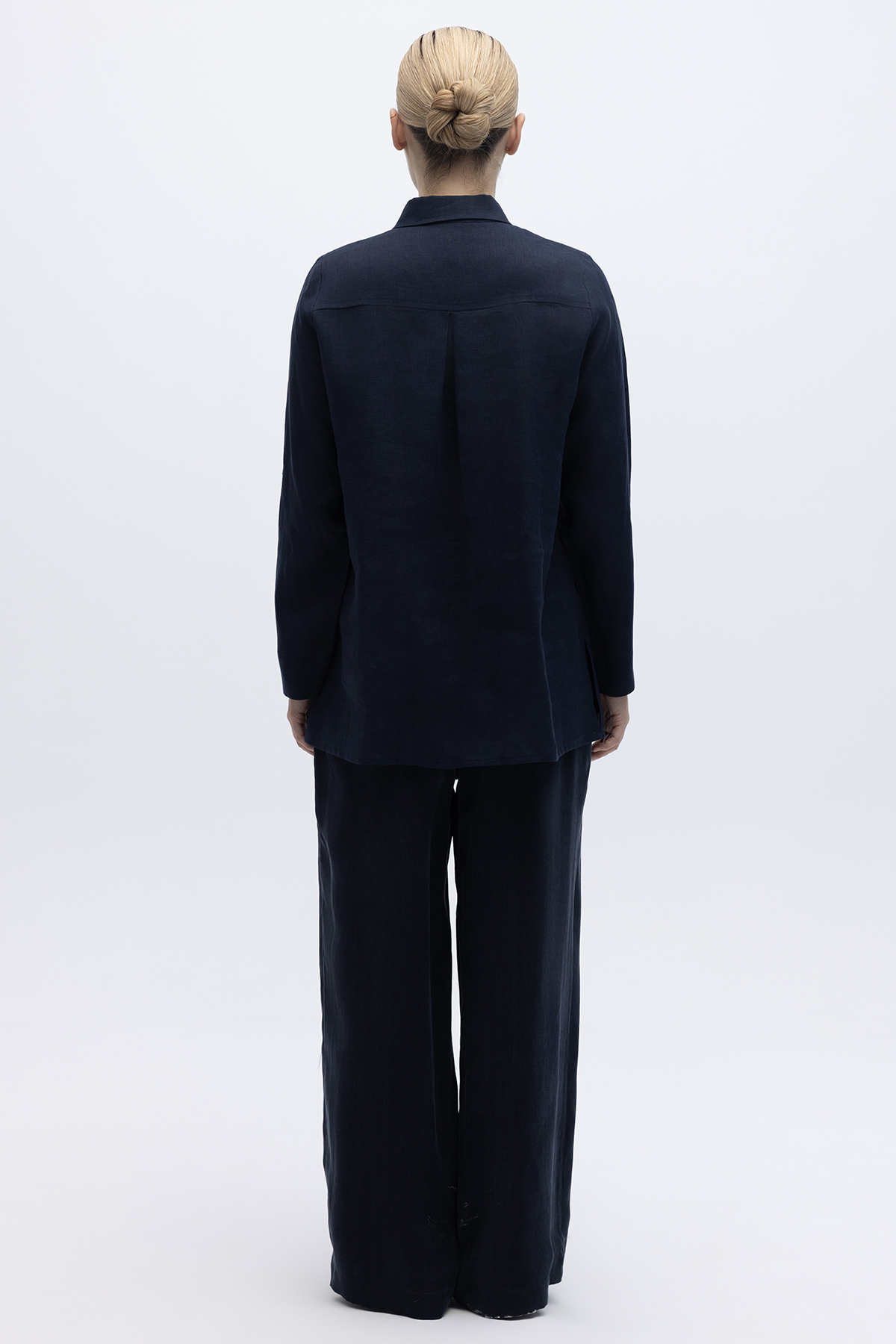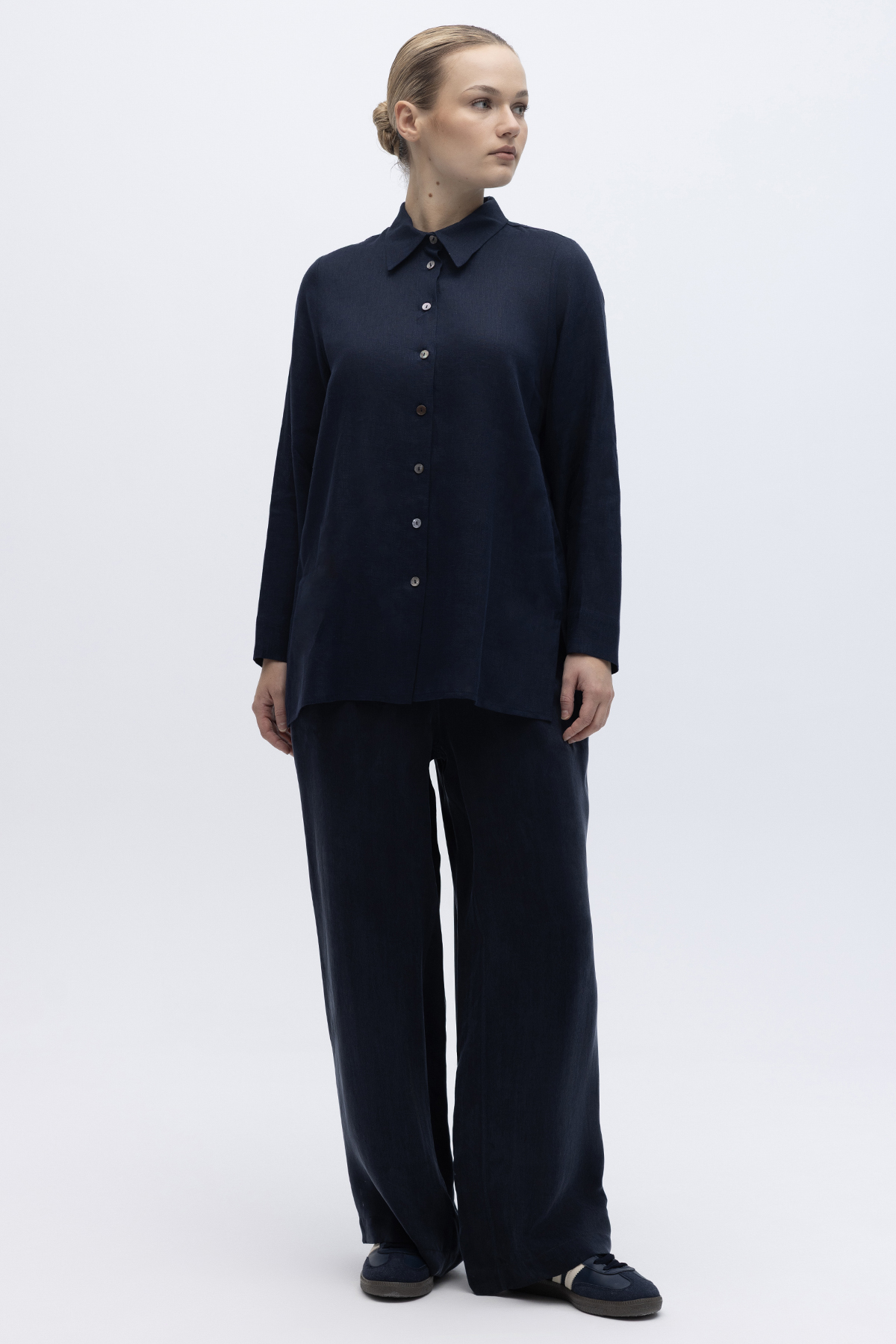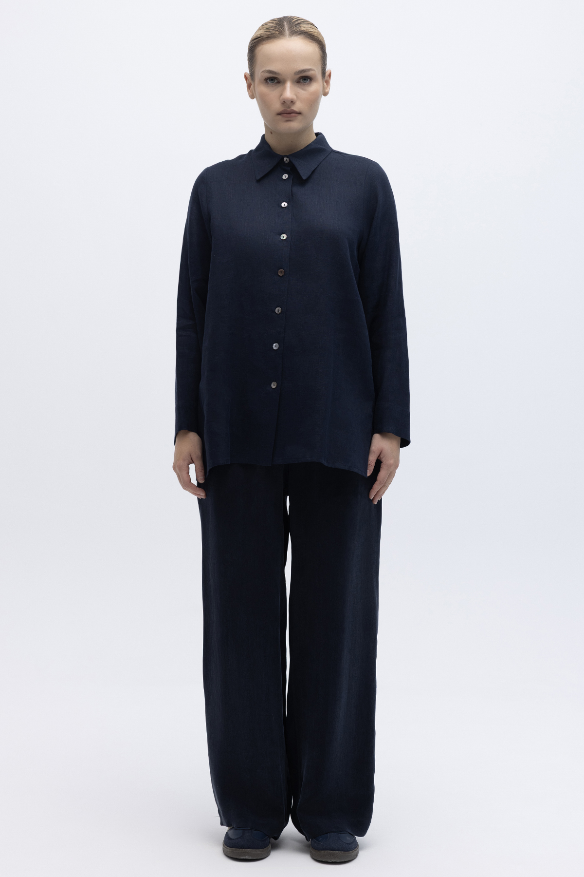 Beli Lastikli Bol Paça Keten Pantolon Lacivert