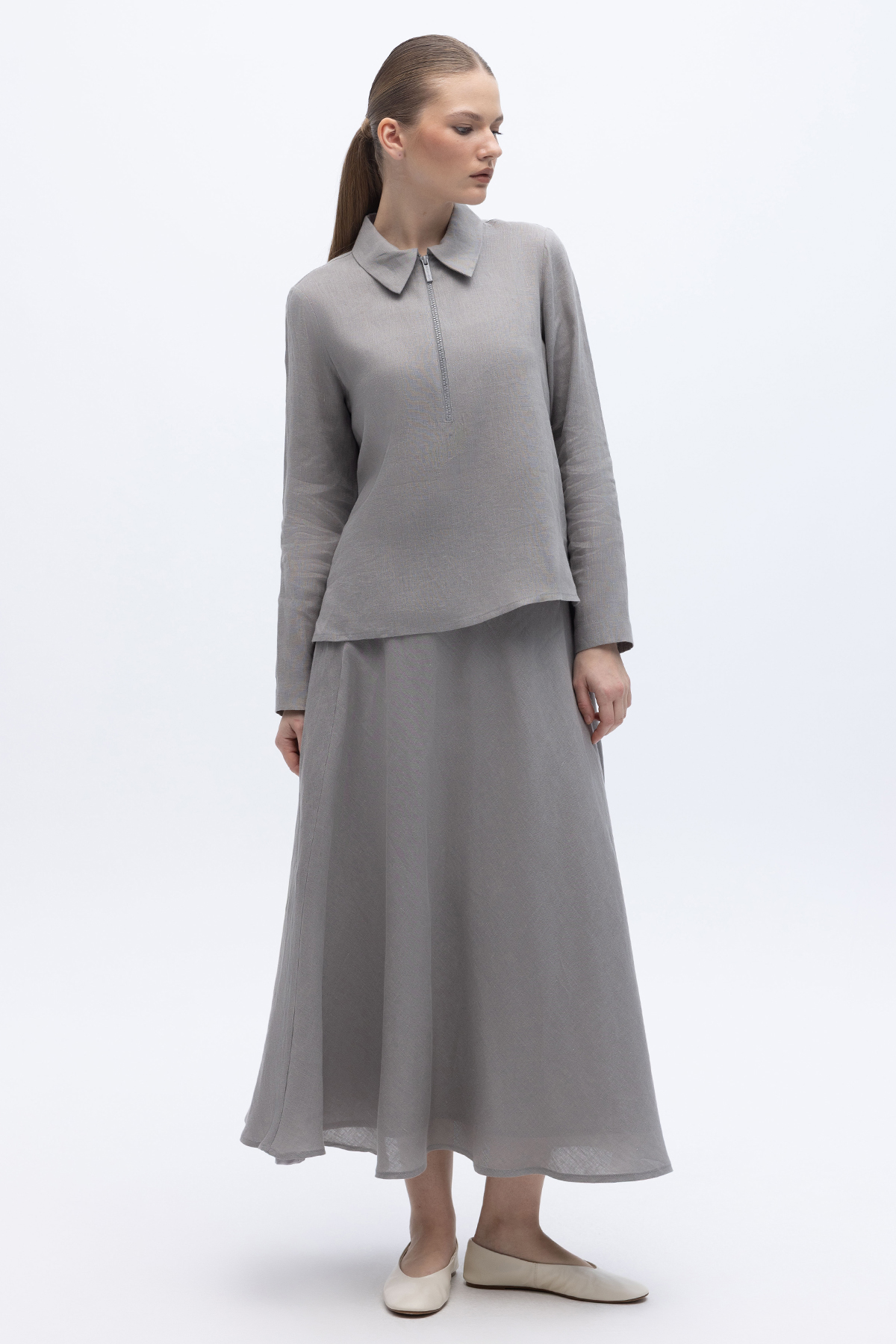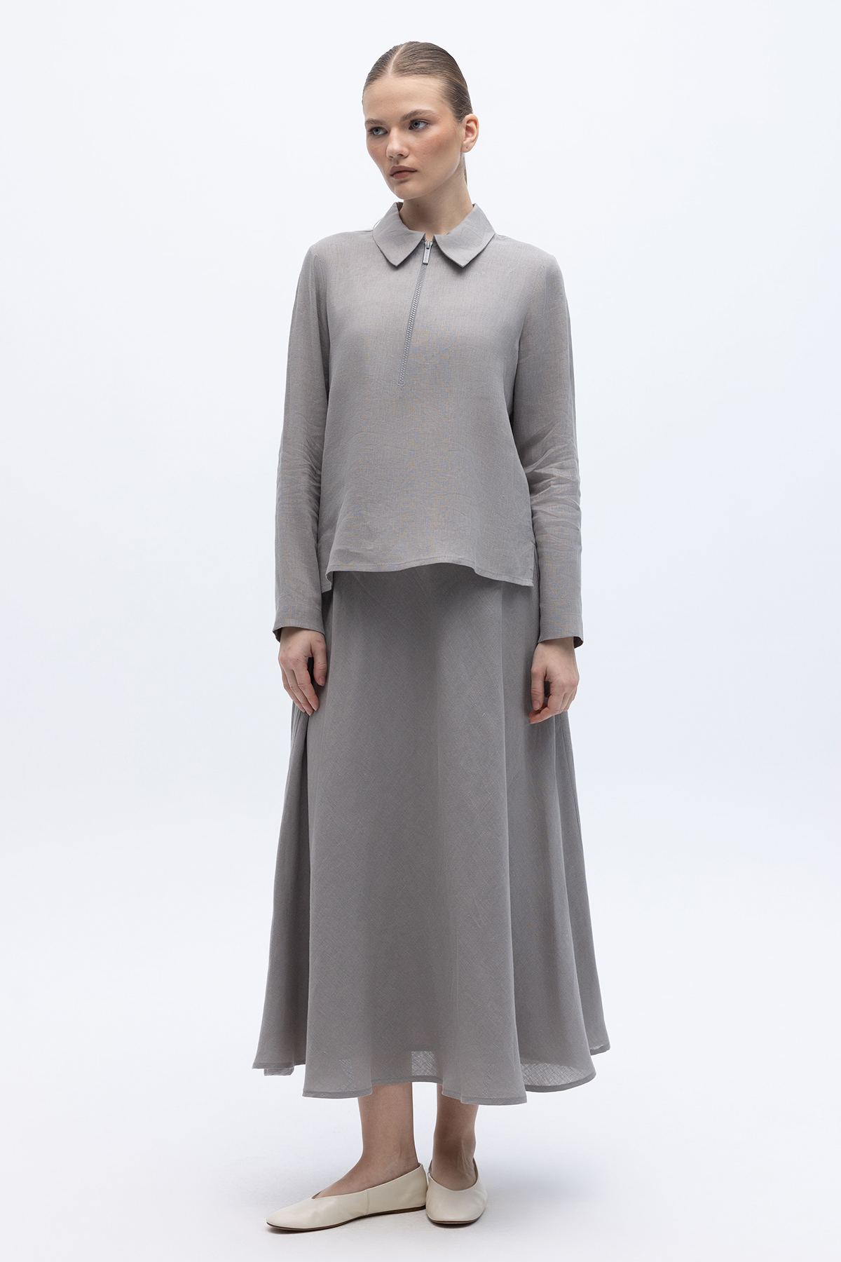 Triko Korsajlı Rahat Kesim Keten Etek Gri