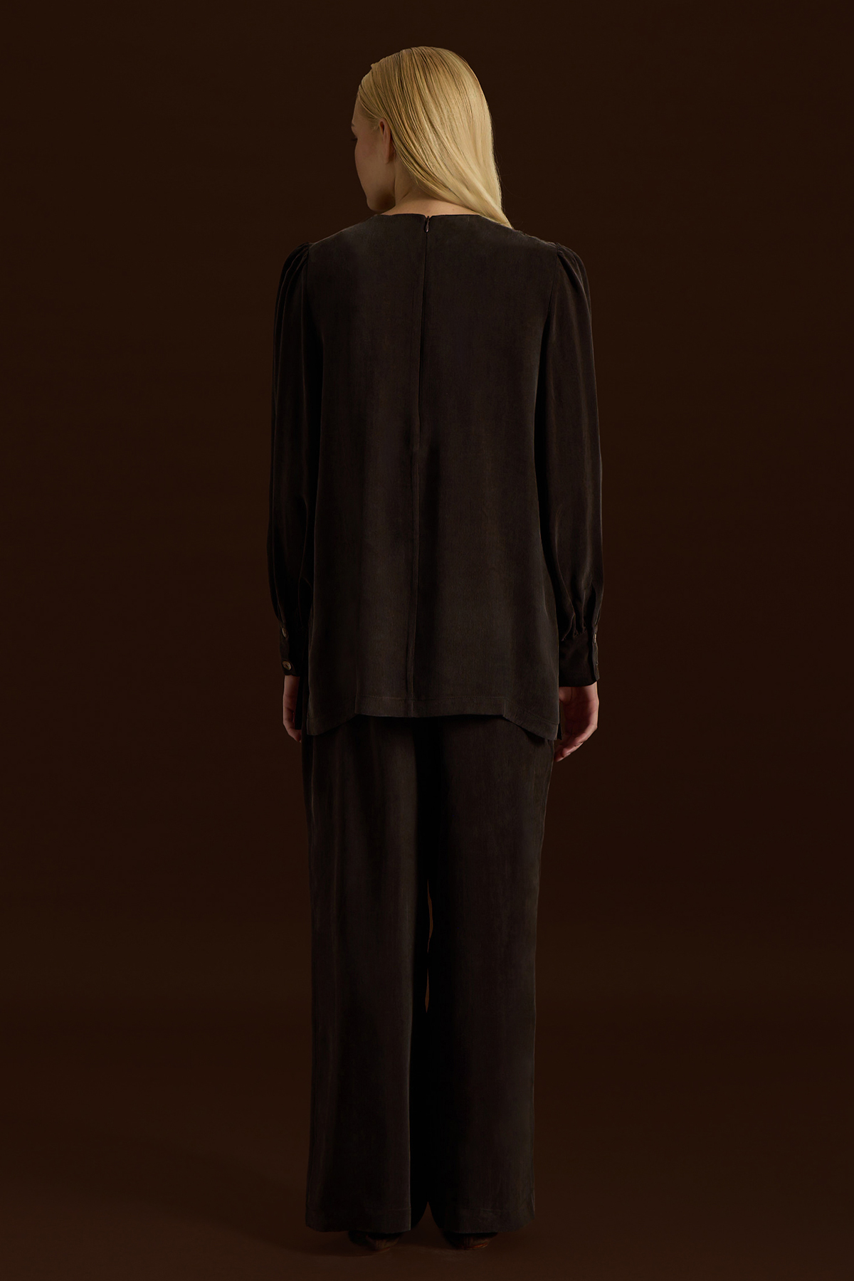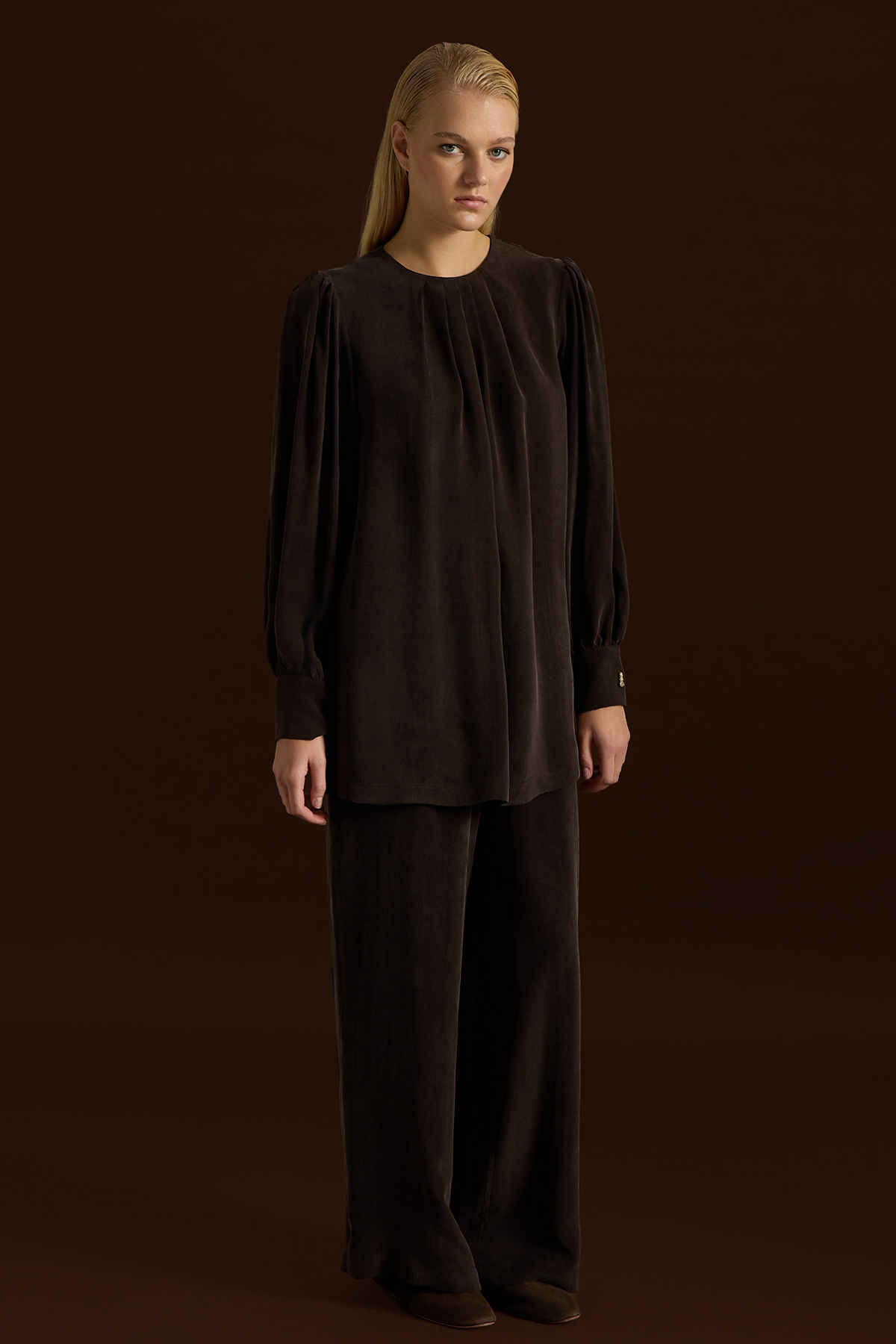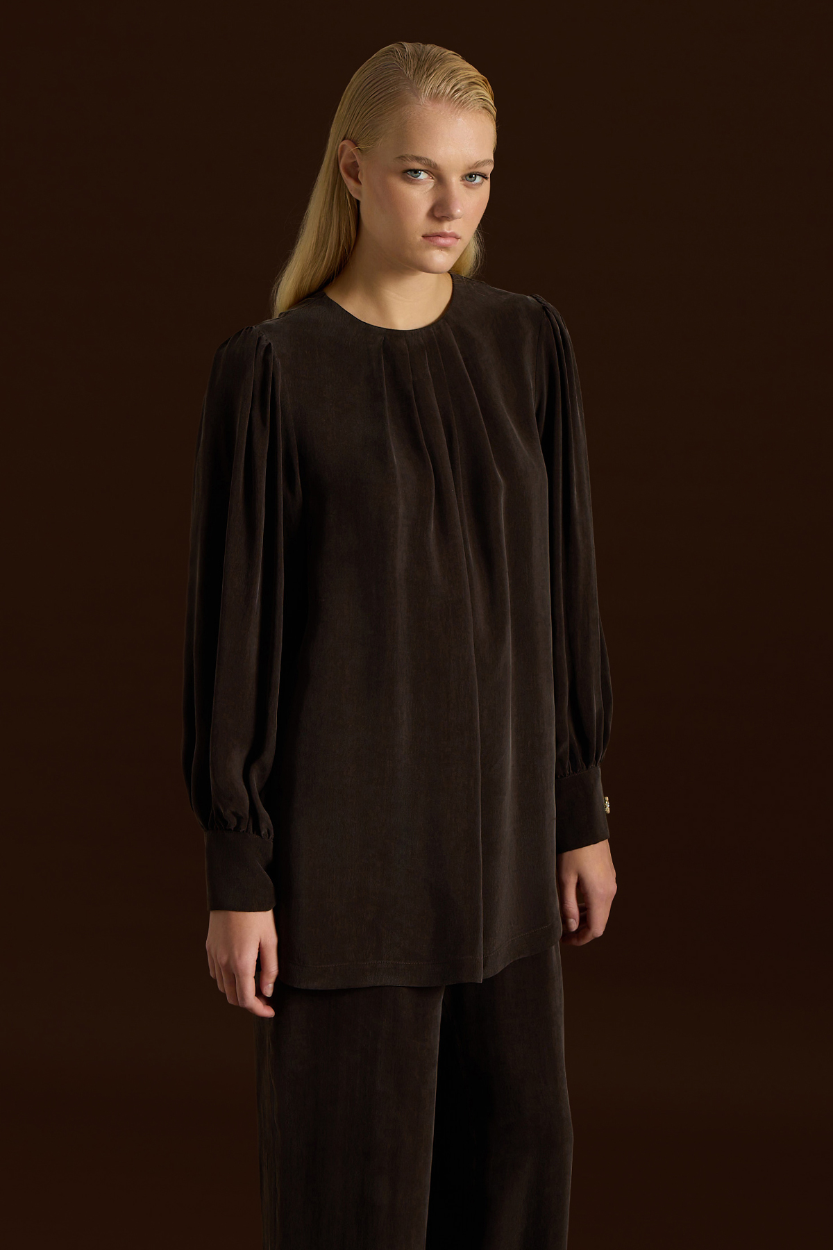Bileği Büzgülü Balon Kollu Cupro Tunik Kahverengi