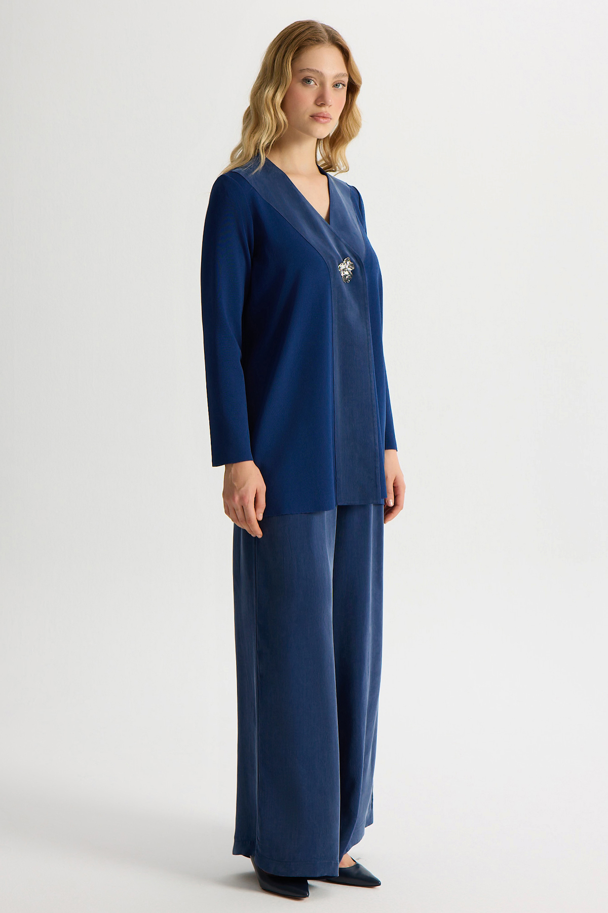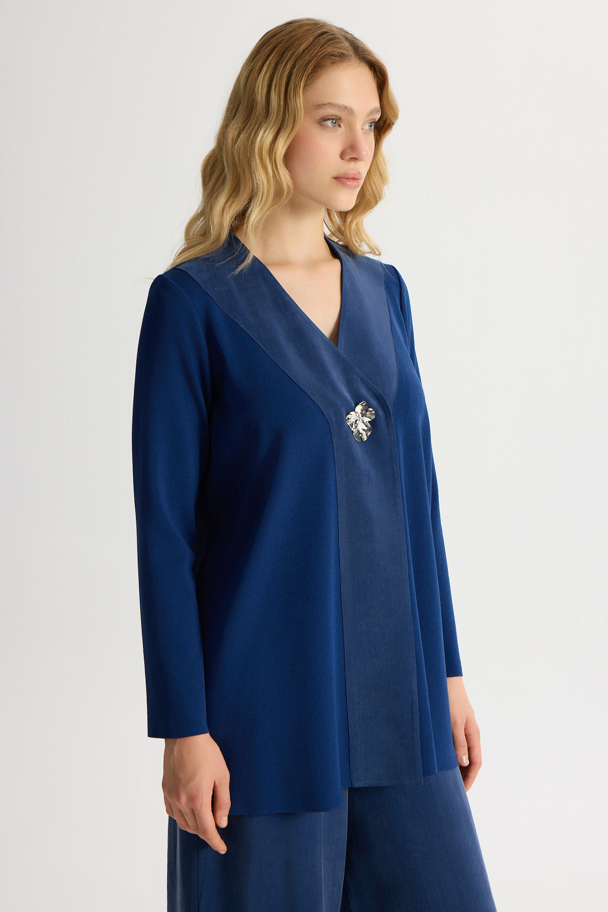 Broş Detaylı V Yaka Ceket Navy