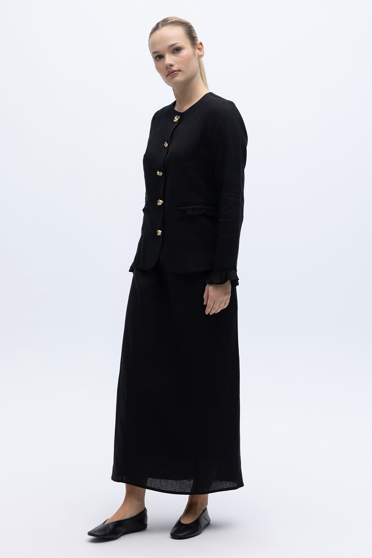 Cep Kapaklı Düğmeli A Kesim Keten Etek Siyah