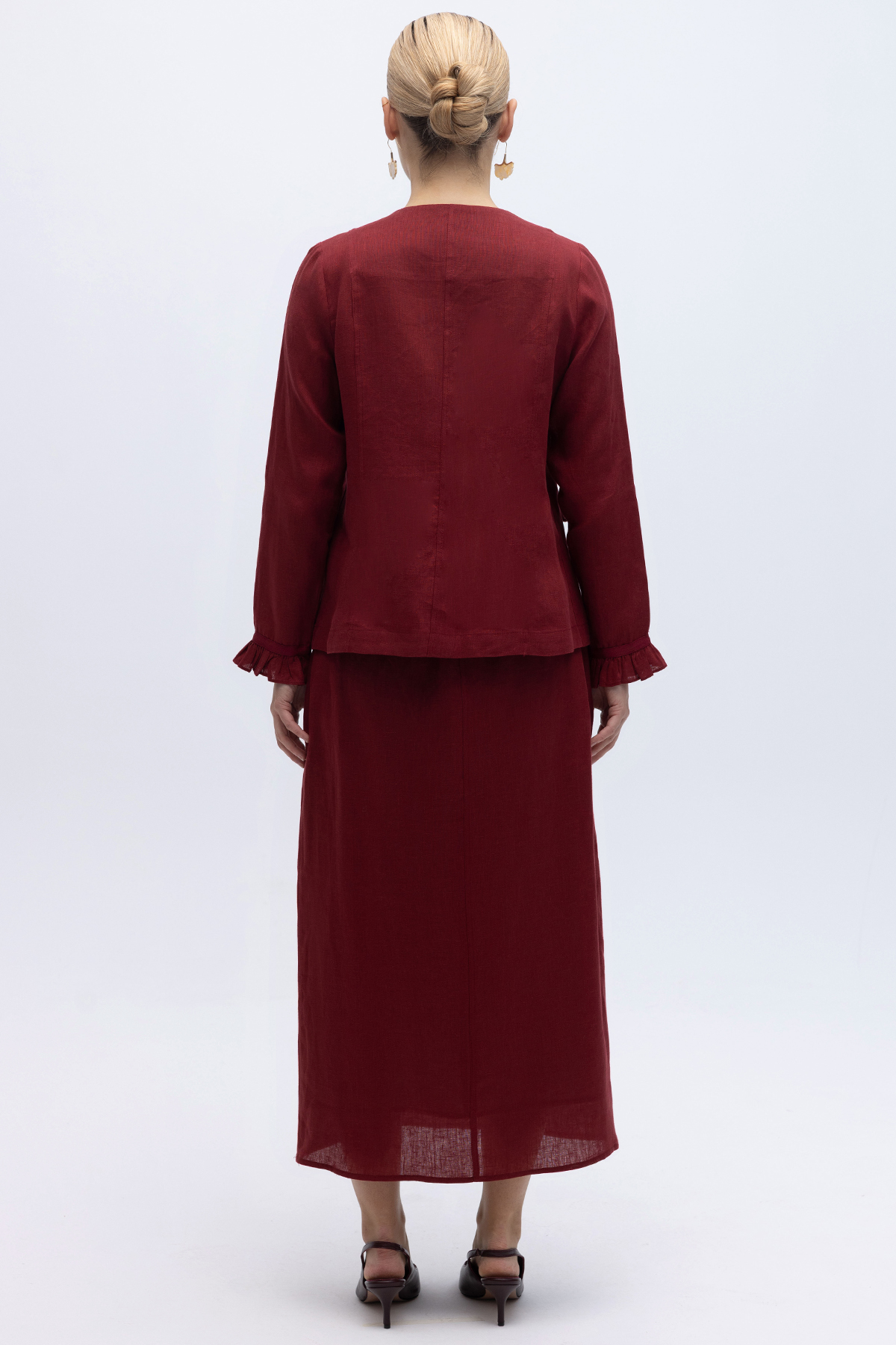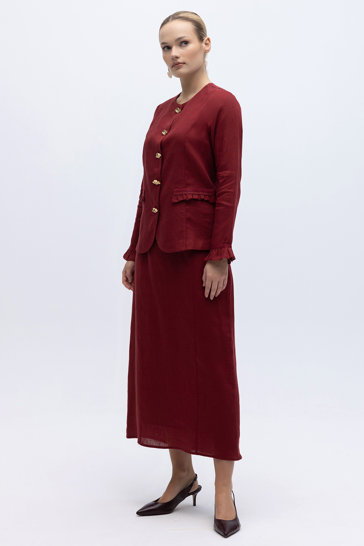Çan Kesim Düz Renk Keten Etek Cherry