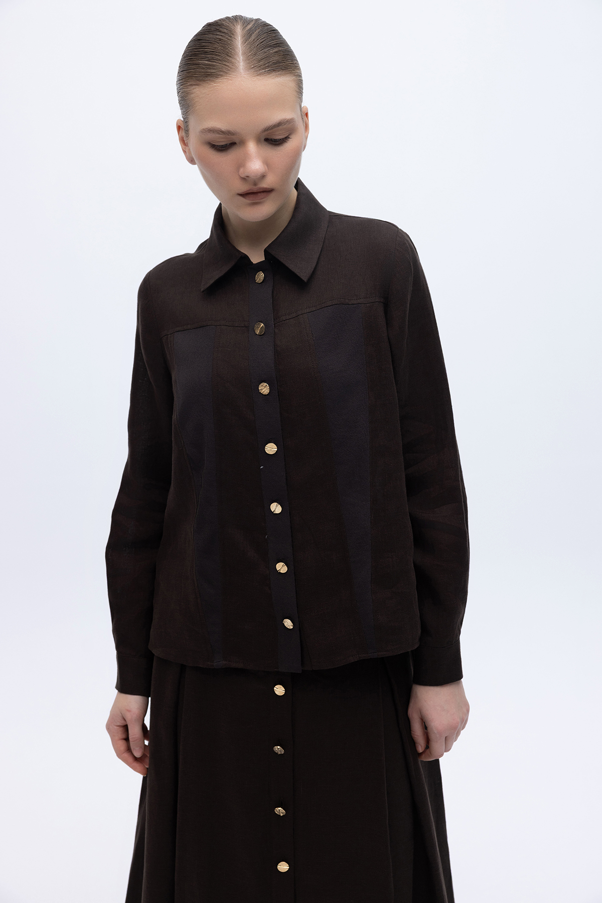 Cep Kapaklı Düğmeli A Kesim Keten Etek Kahverengi