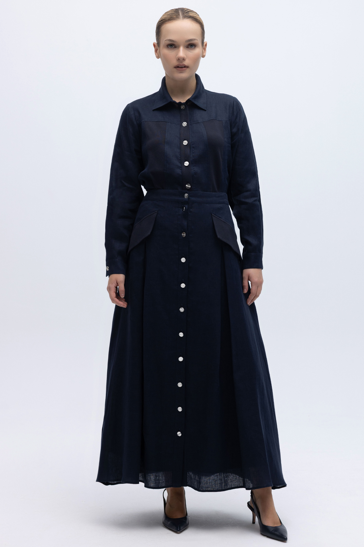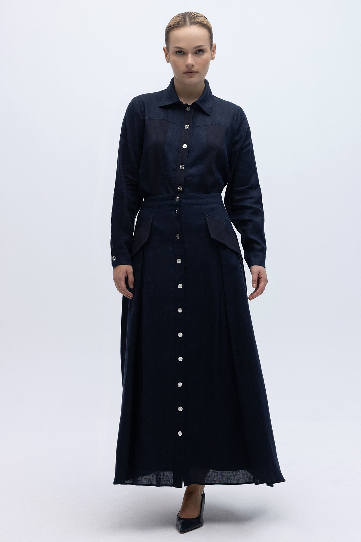 Cep Kapaklı Düğmeli A Kesim Keten Etek Lacivert