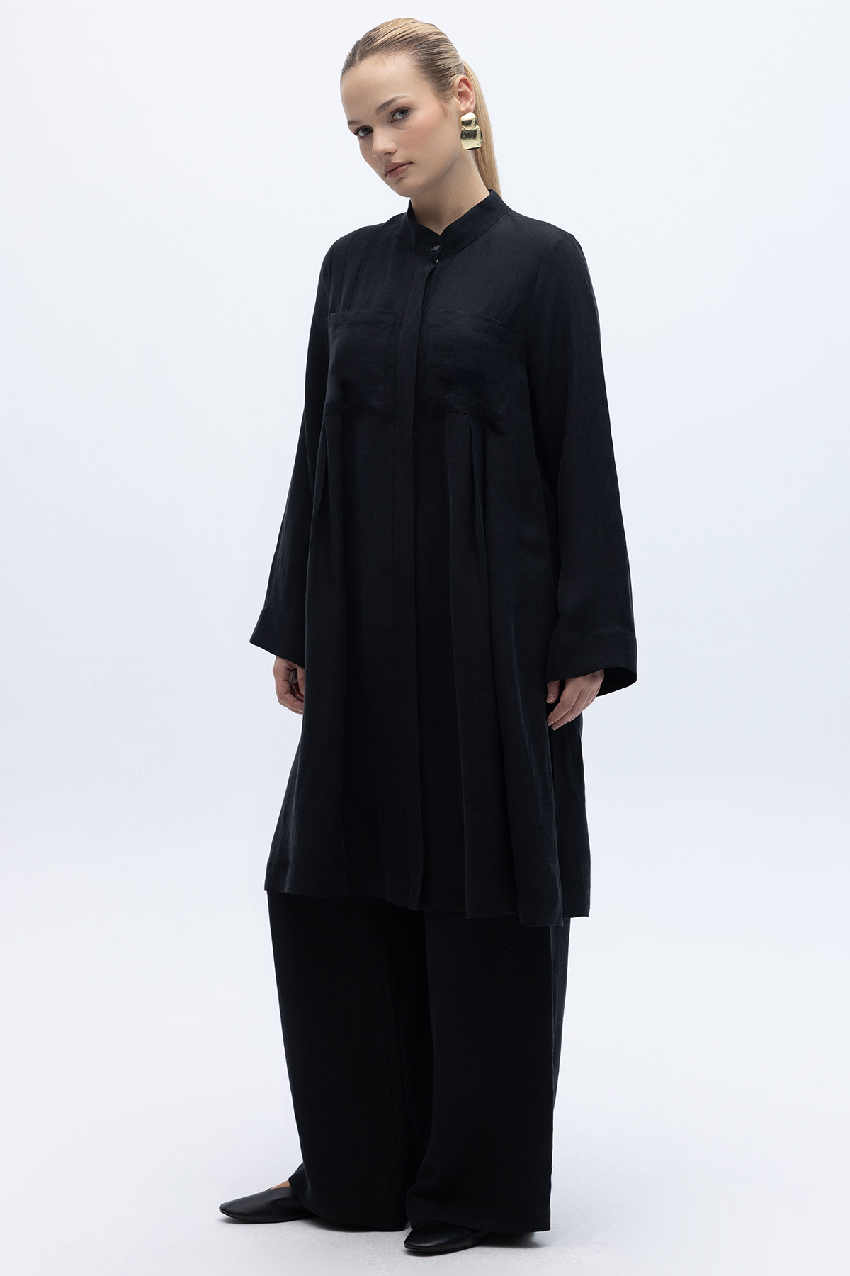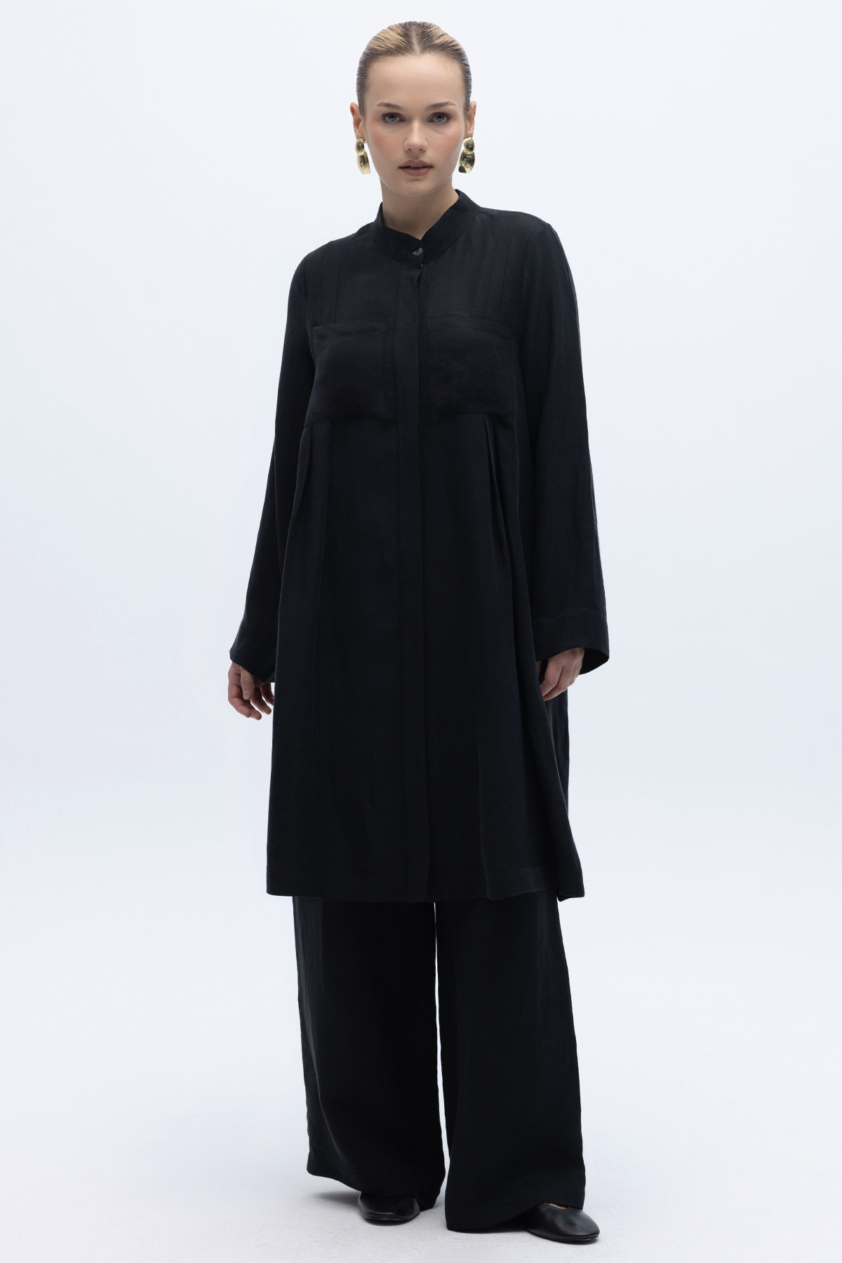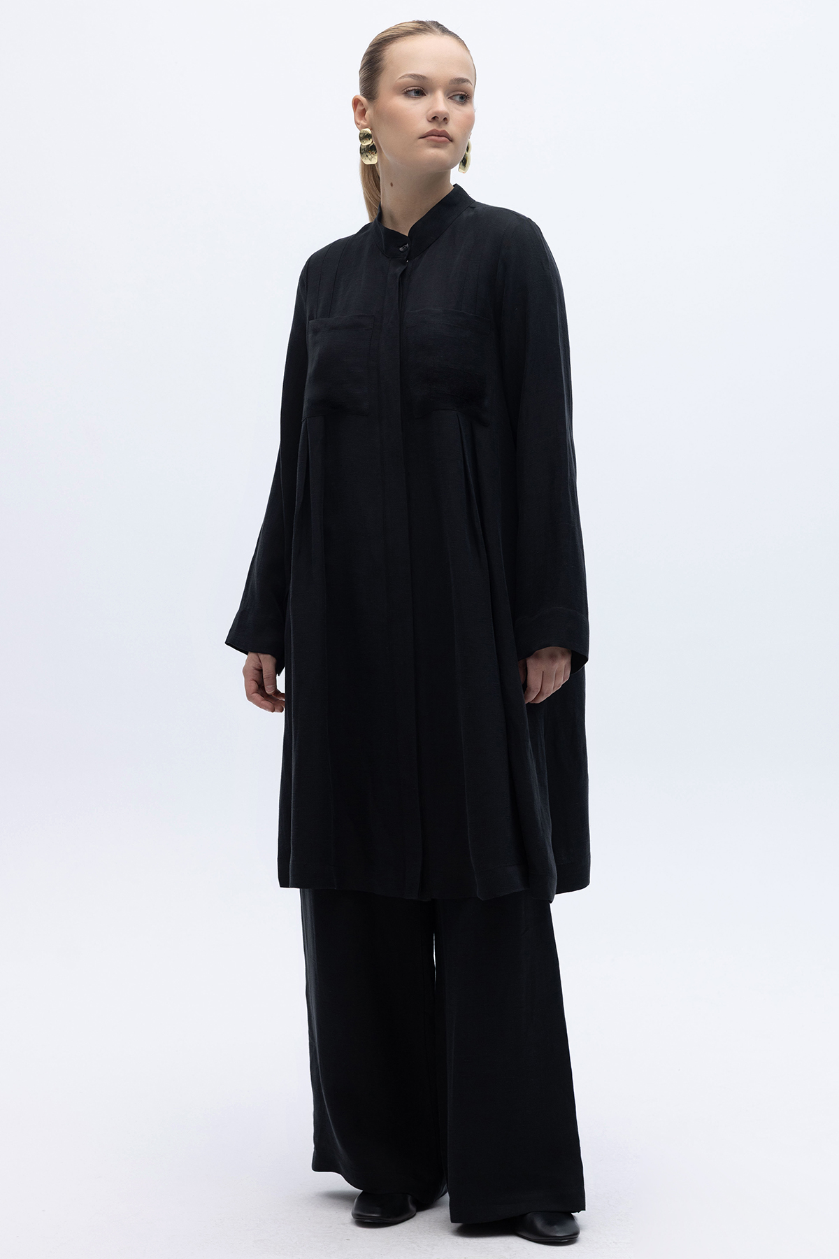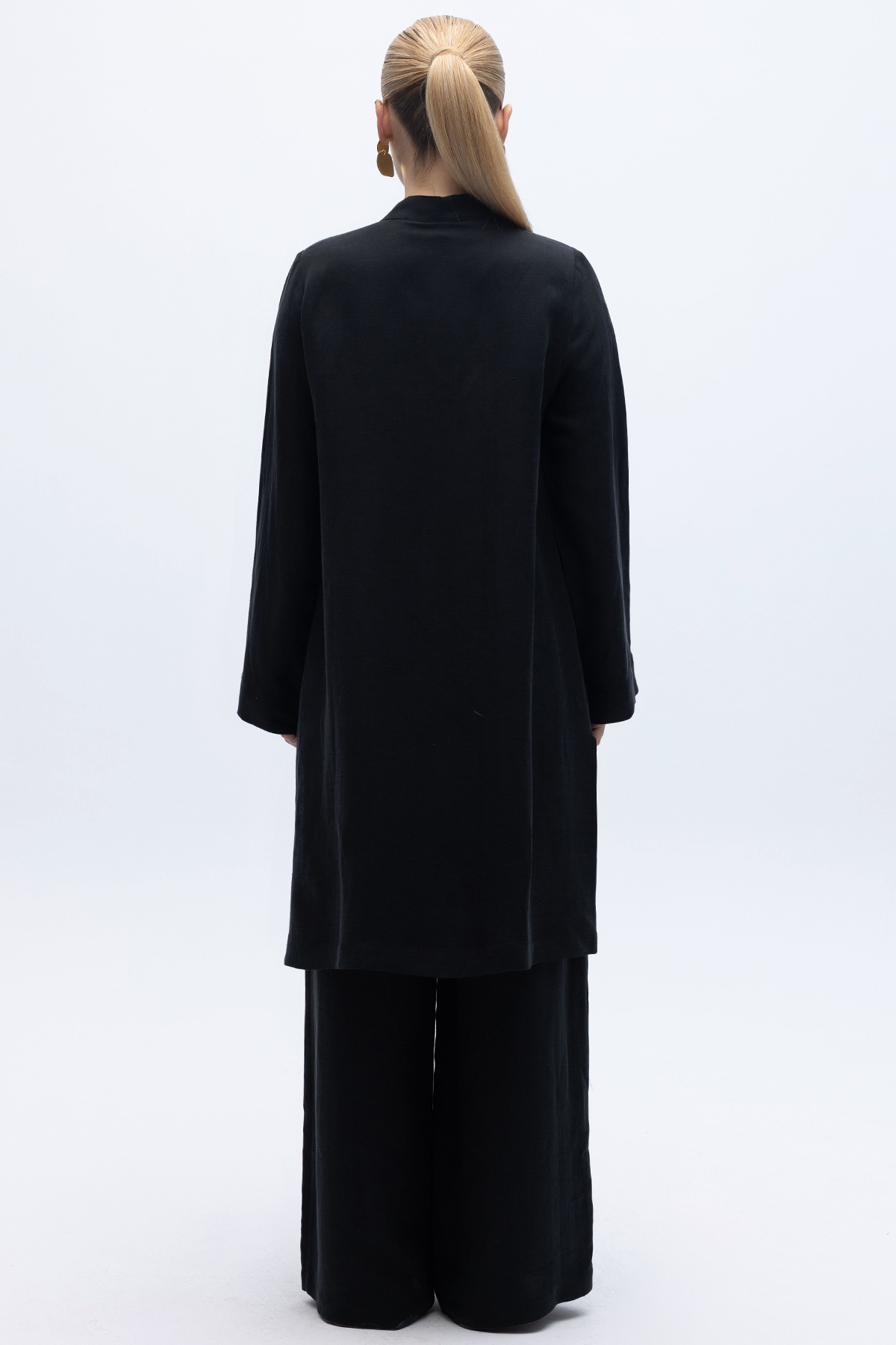 Cepli İpek Keten Bol Paça Pantolon Siyah