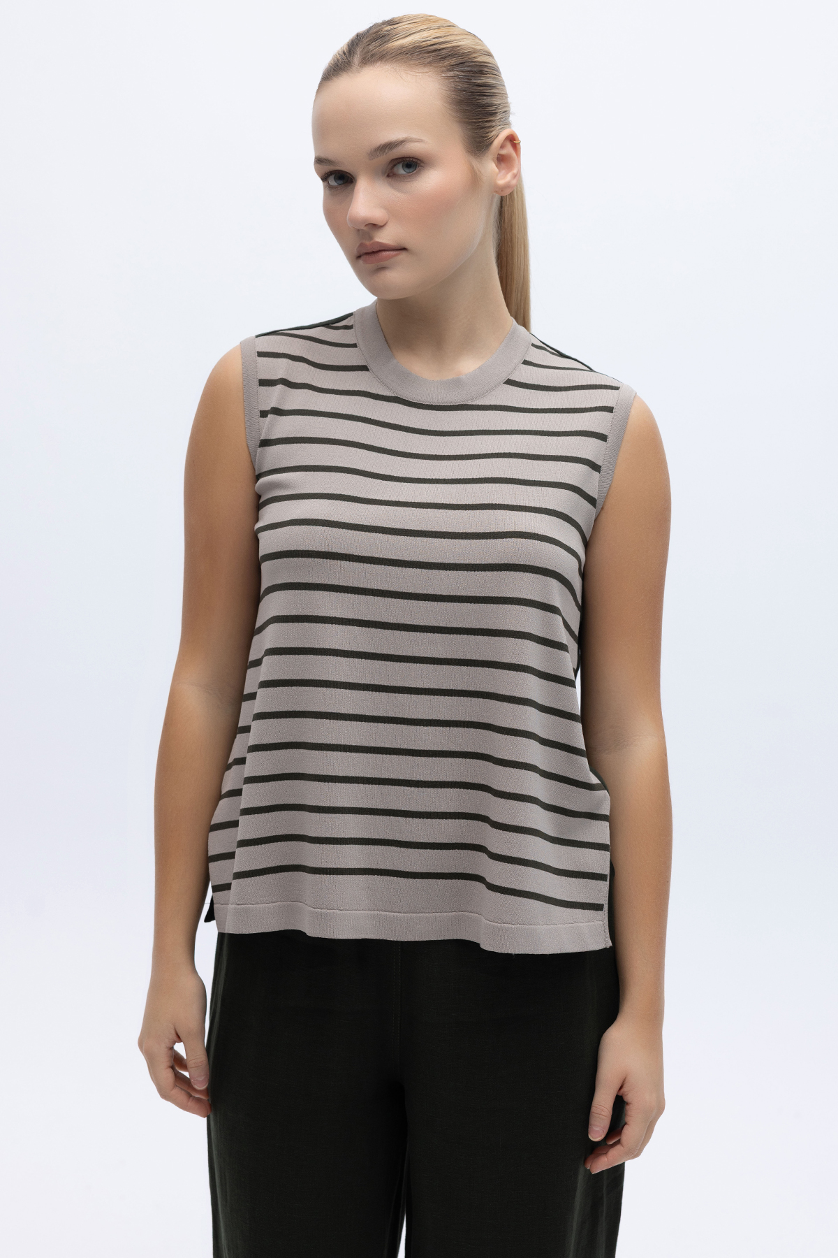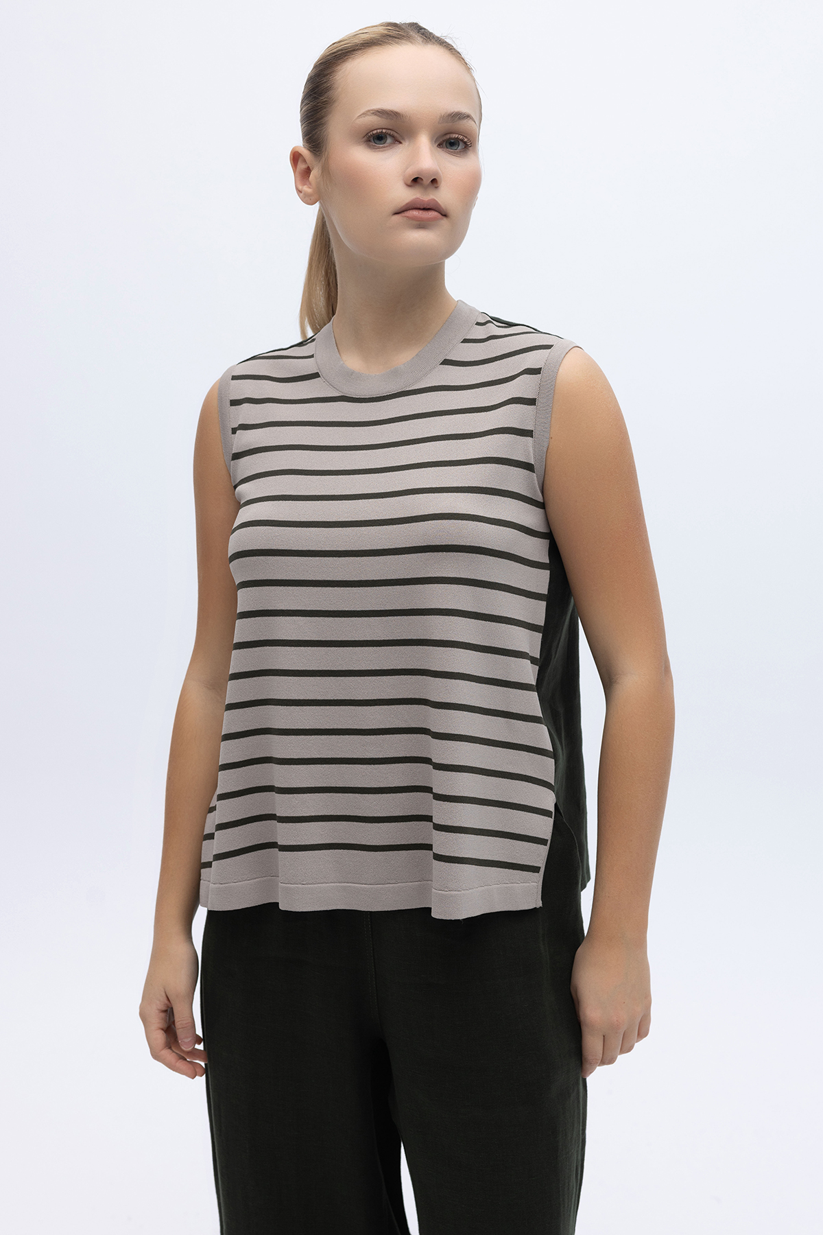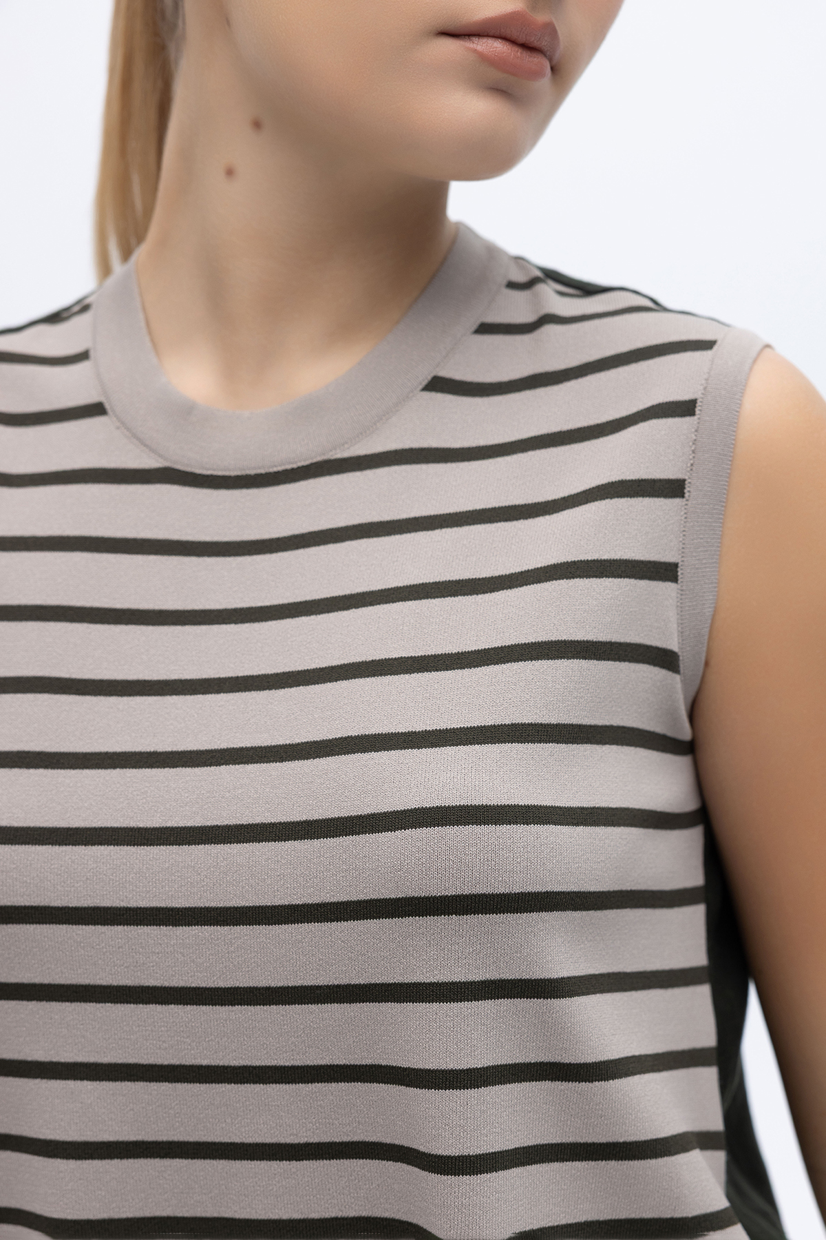 Çizgili Kolsuz Triko-Keten Tunik Haki