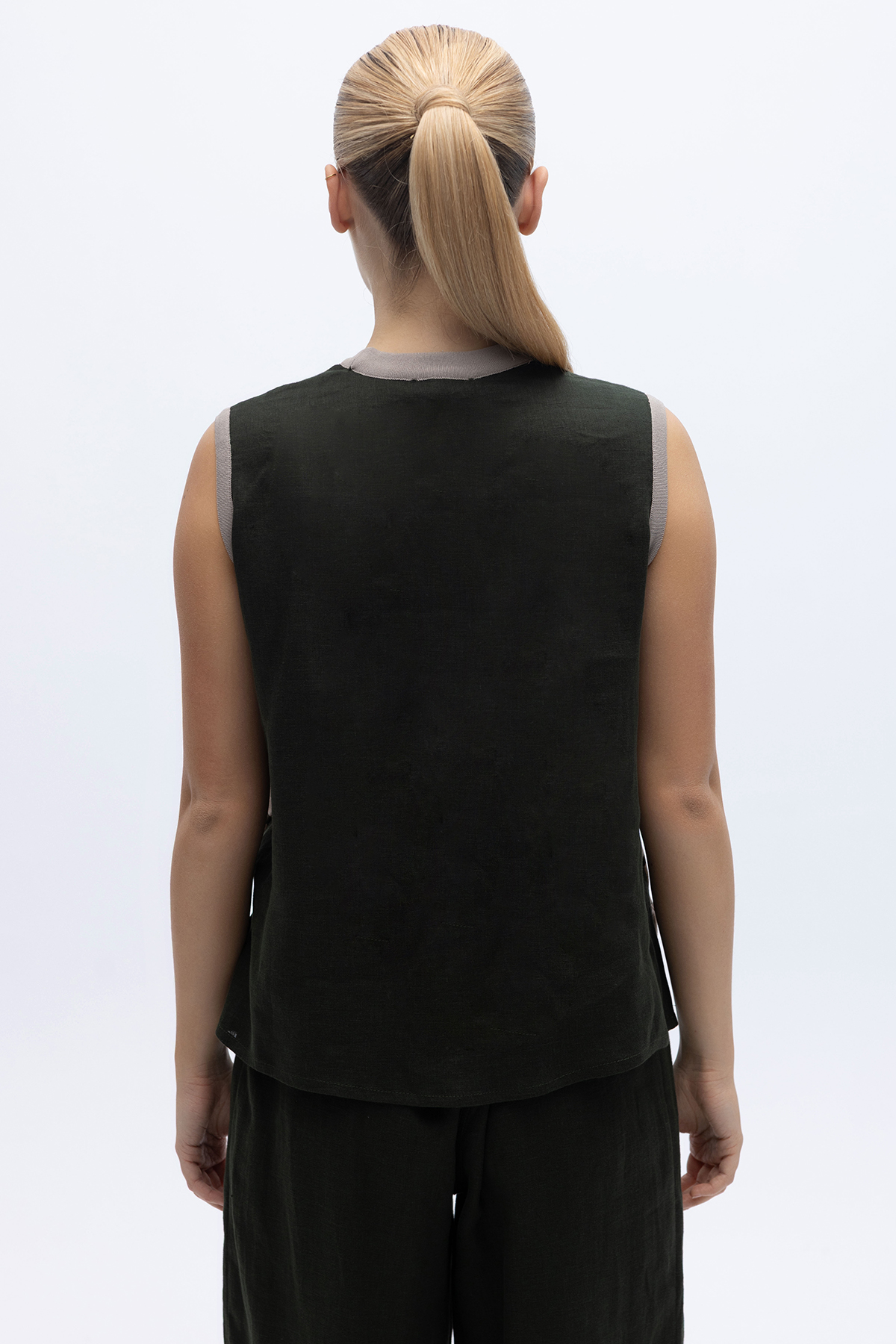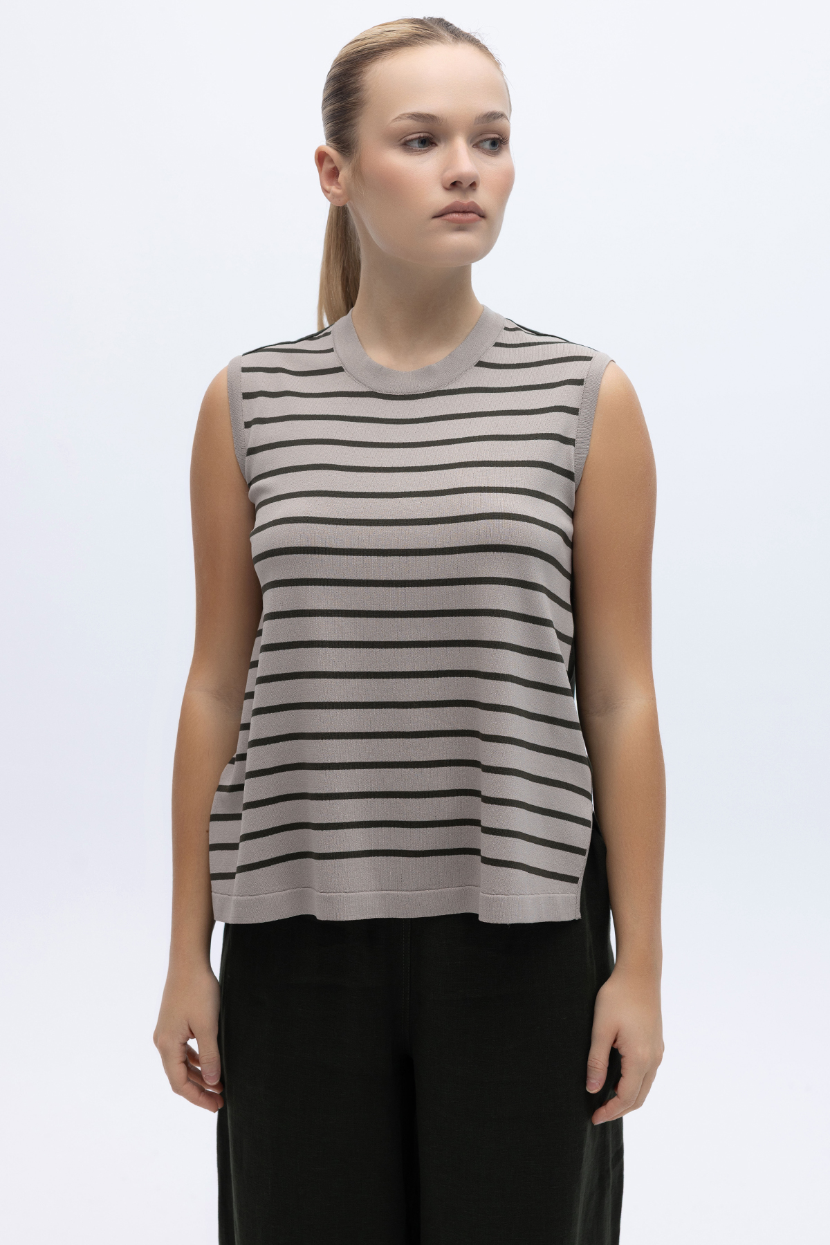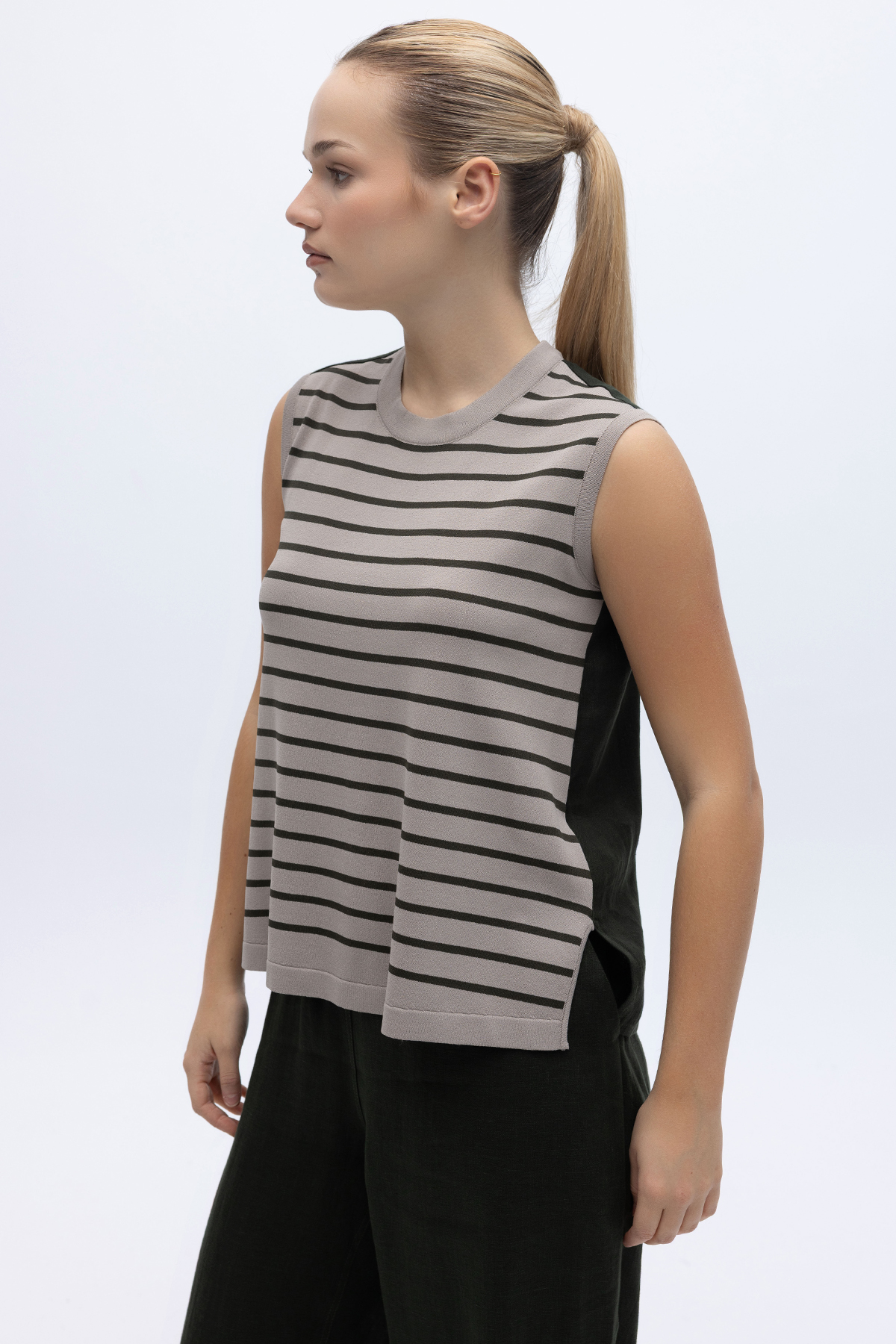 Çizgili Kolsuz Triko-Keten Tunik Haki