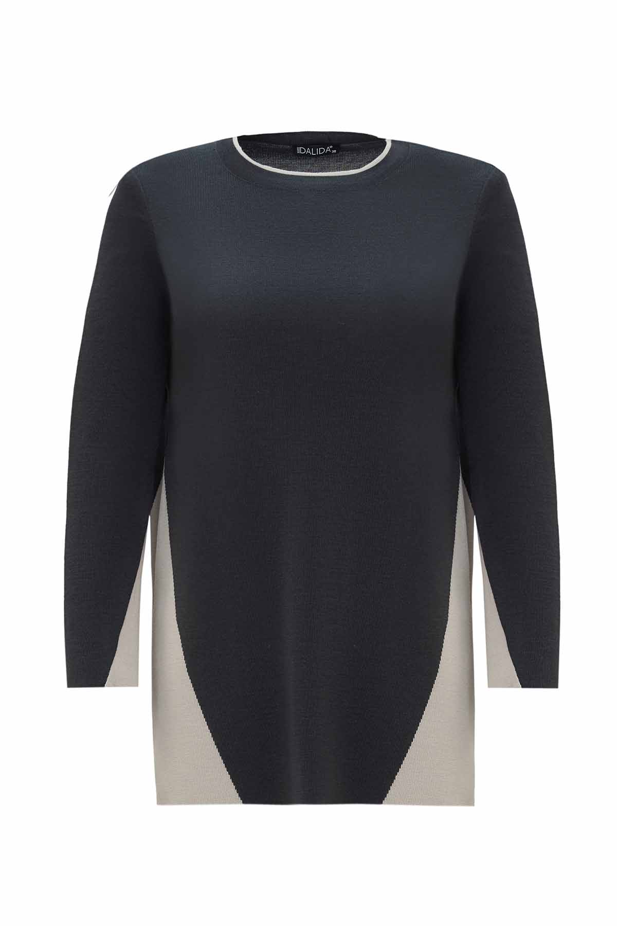 The Dark Grey Knit Tunic with Colorful Side Details features a modern knit texture enhanced by elegant side stripe accents. Its soft and flexible fabric ensures all-day comfort, while the dark grey base color paired with colorful sides adds a dynamic touch to any outfit. The relaxed fit makes it perfect for both casual and chic styling.
