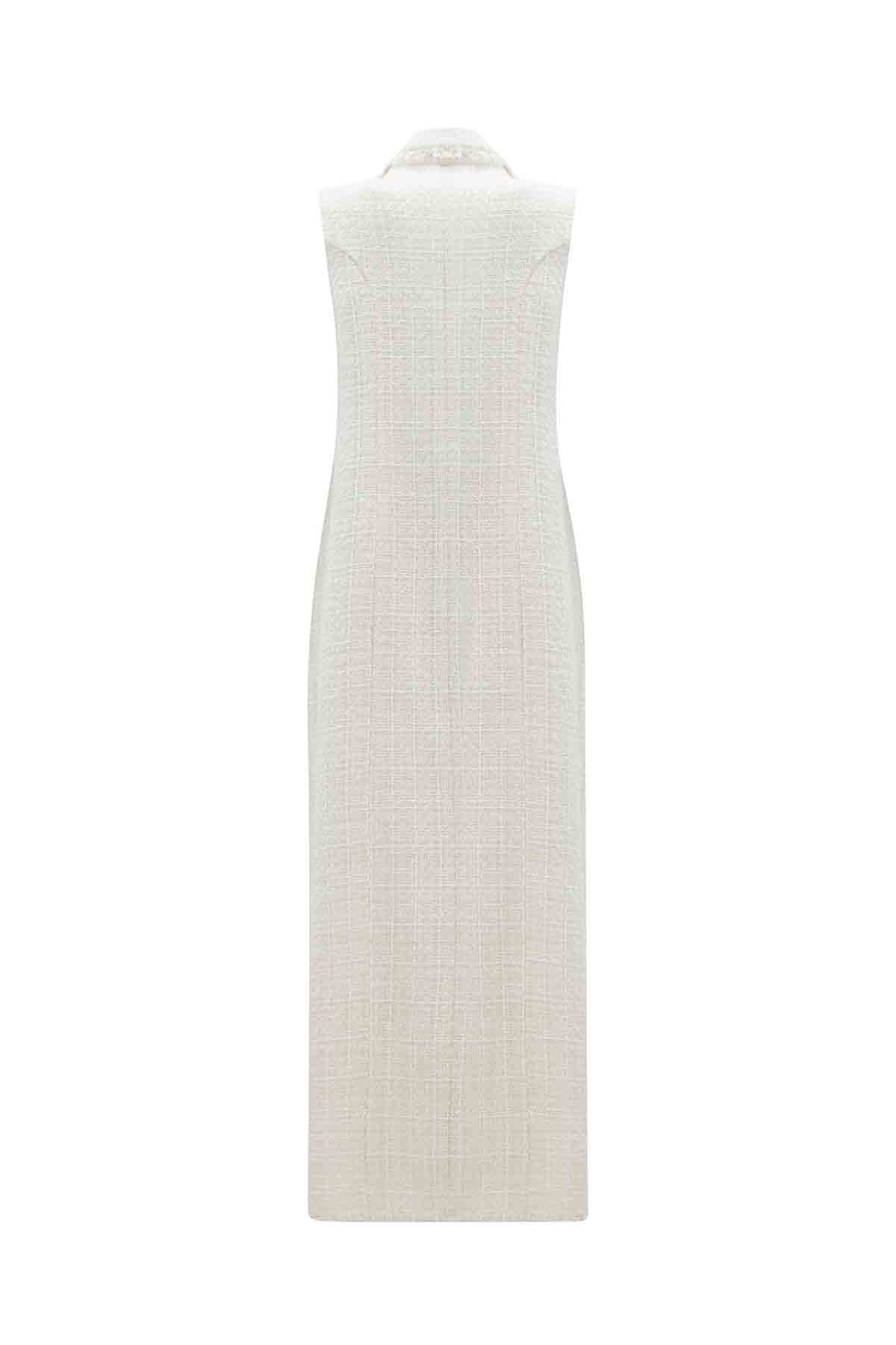 The Double-Breasted Tweed Ecru Jacket combines classic tailoring with a modern twist. Its soft tweed fabric and elegant ecru tone make it a perfect choice for both casual chic and formal occasions.