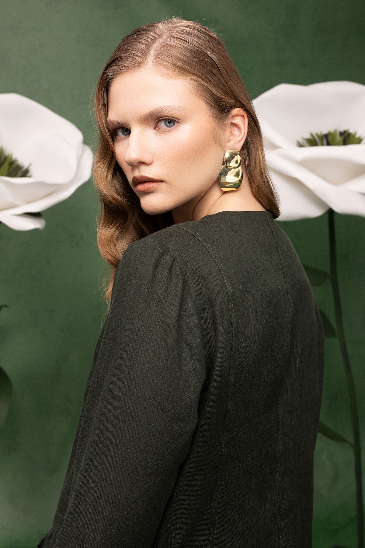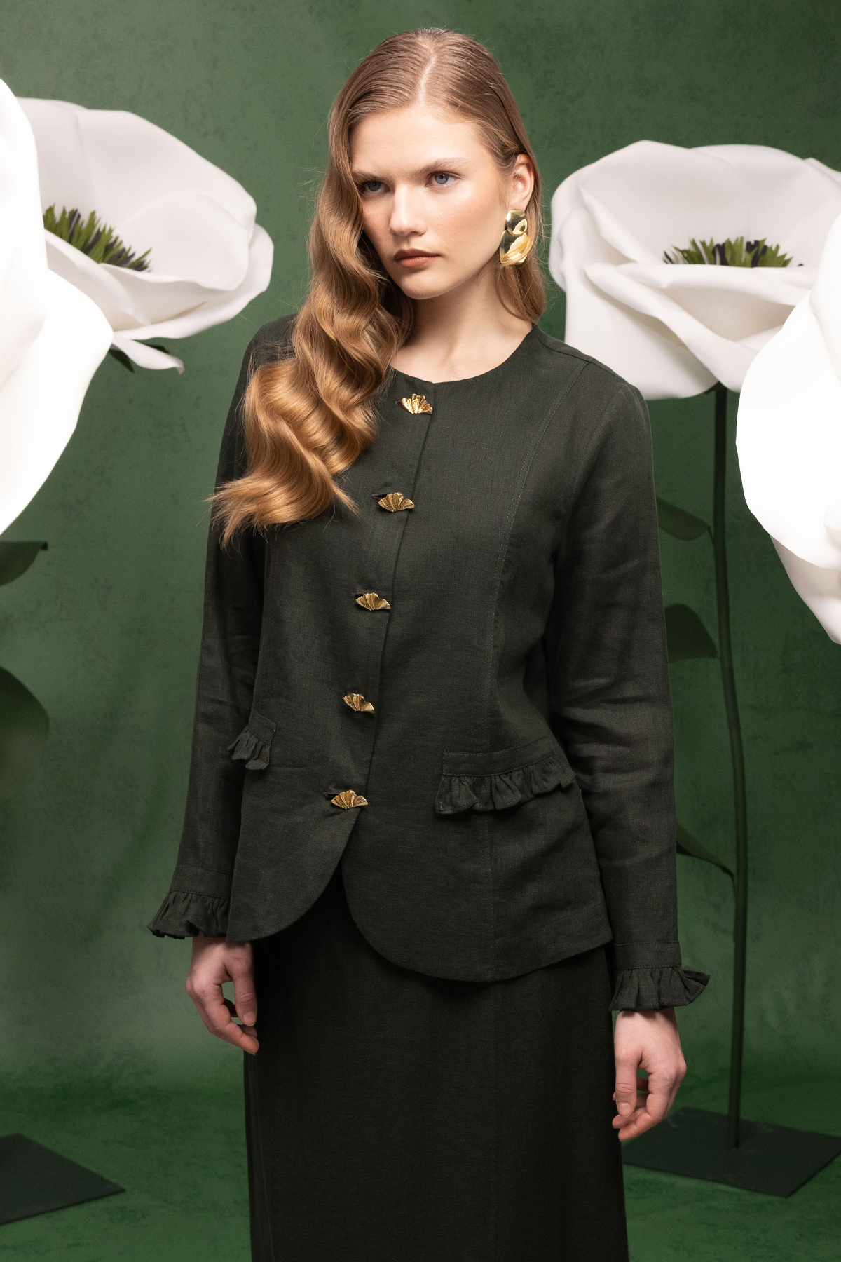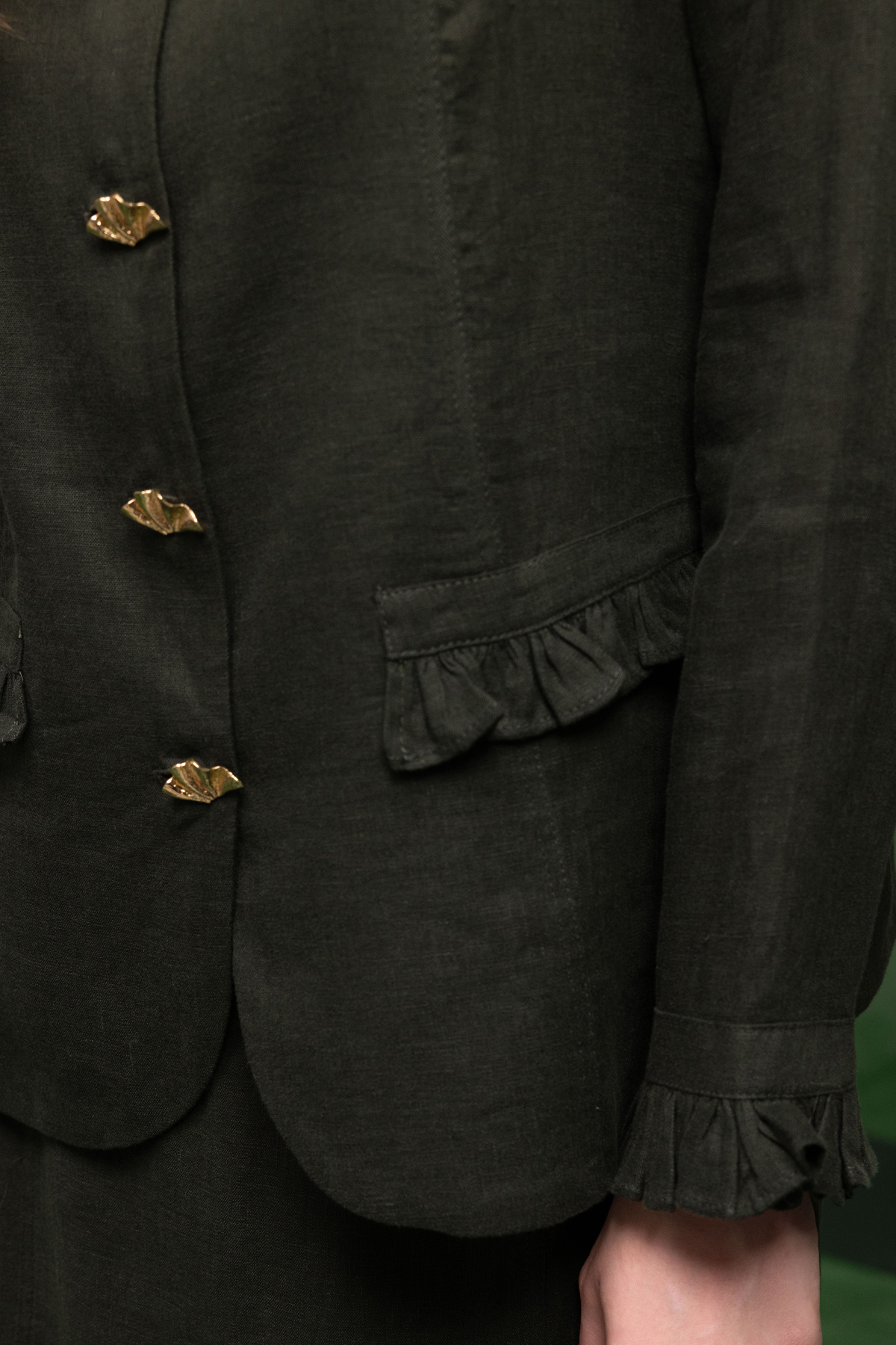 Düğme ve Fırfır Detaylı Detaylı Keten Ceket Haki