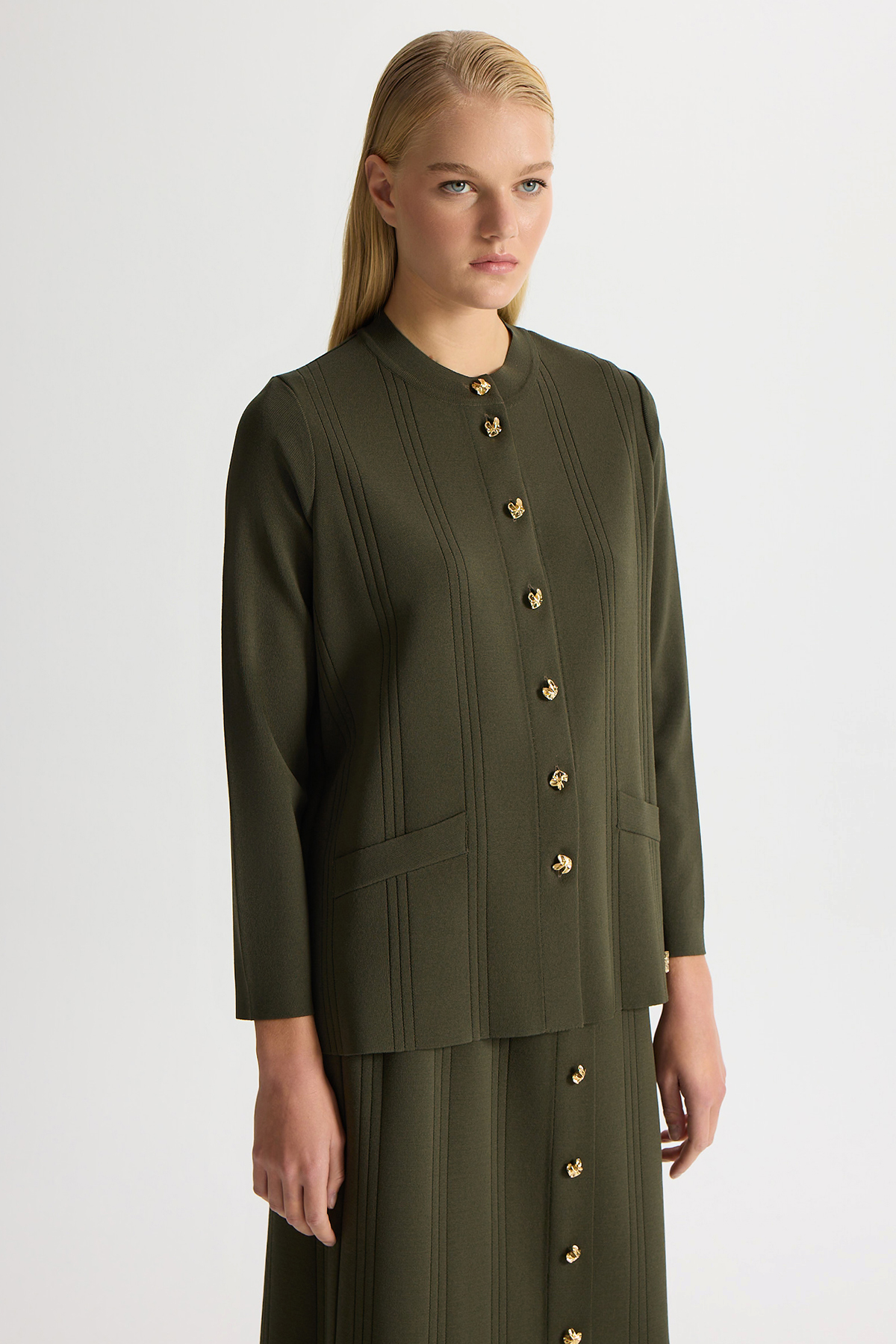 Düğmeli Klasik Triko Ceket Haki