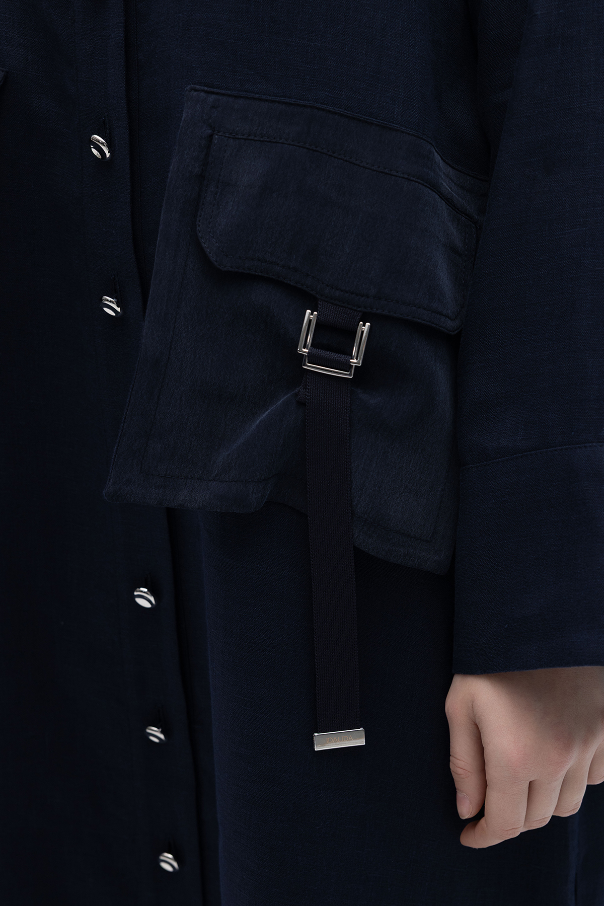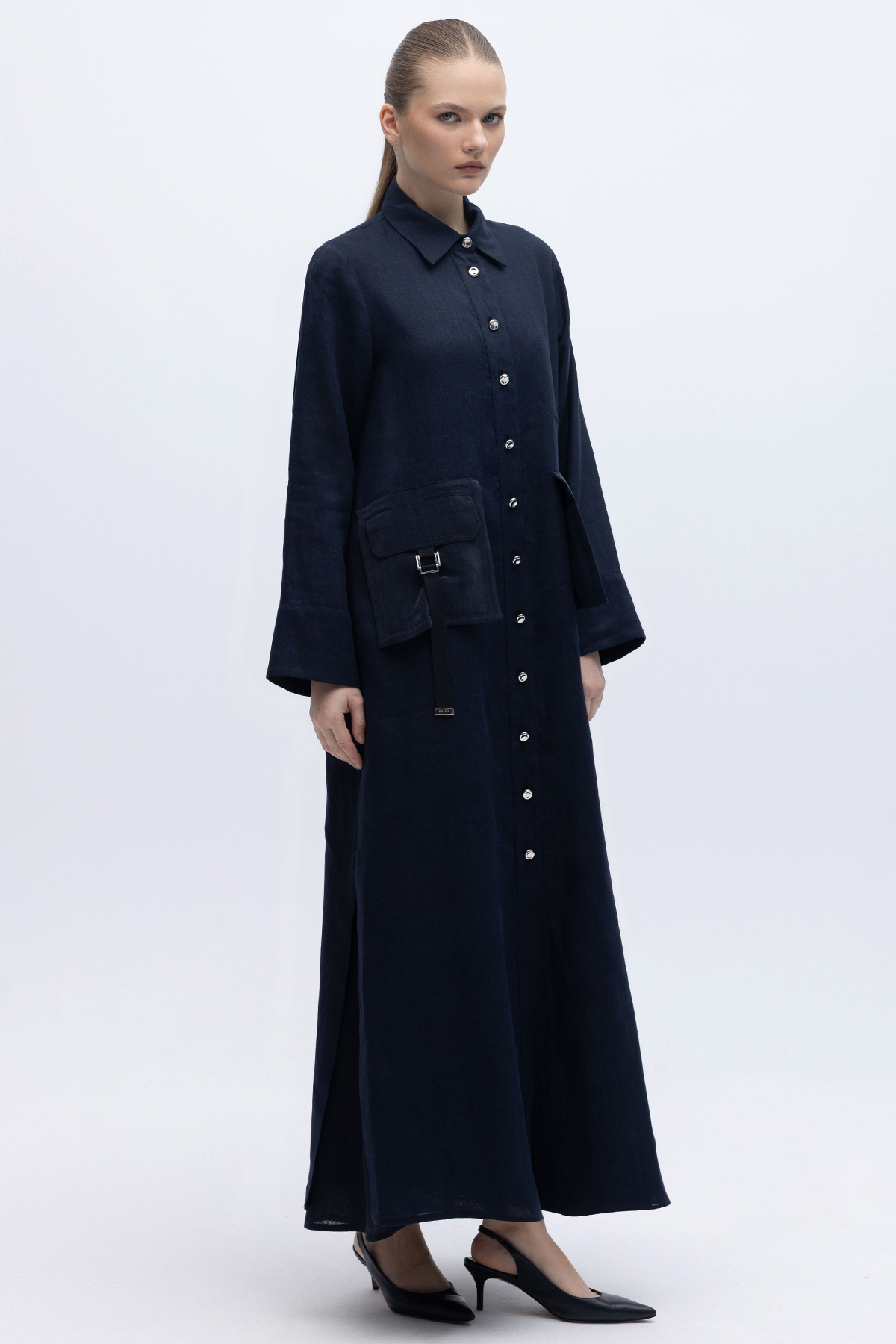 Düğmeli Uzun Keten Kap Siyah