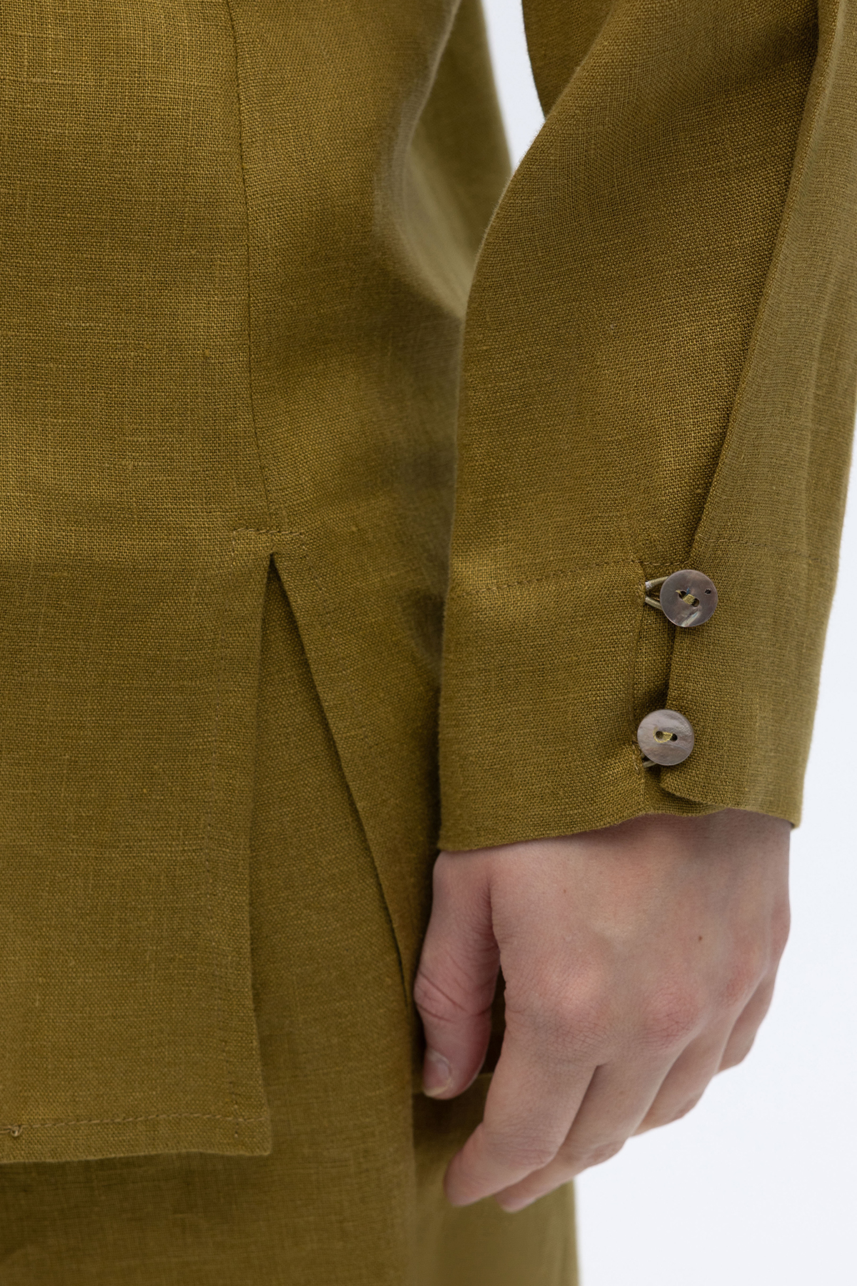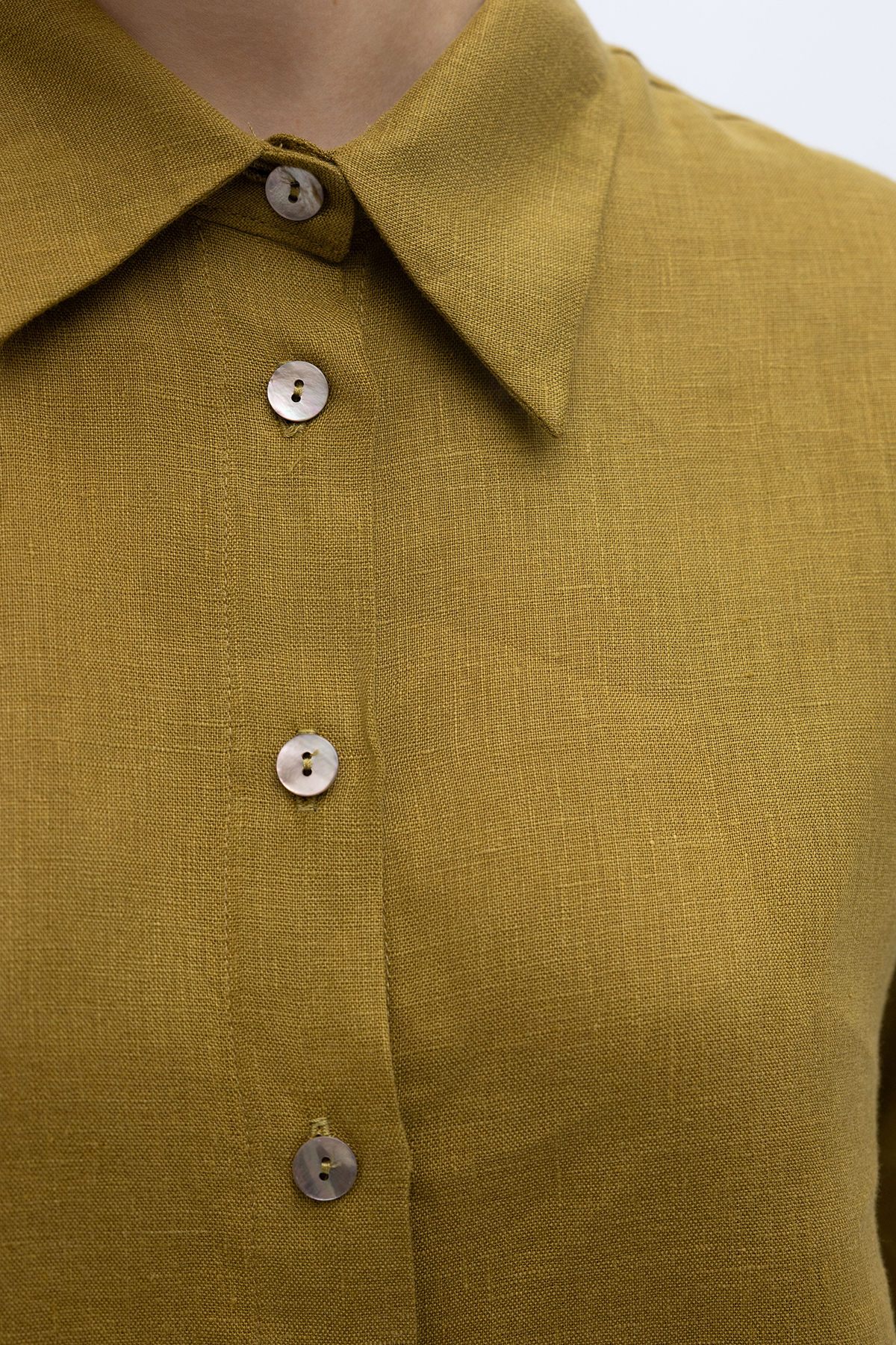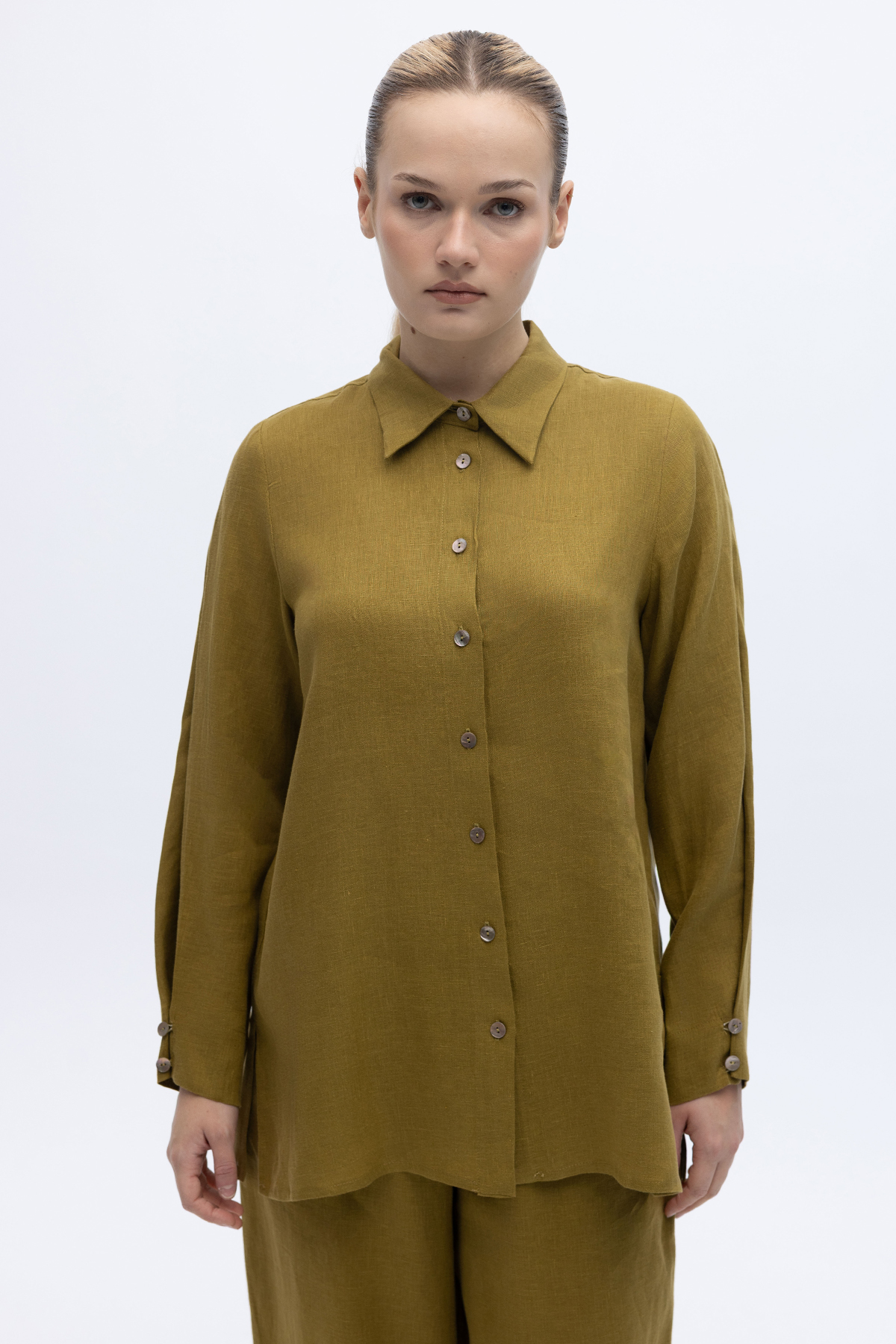 Erkek Yaka Düz Renk Keten Gömlek Amber