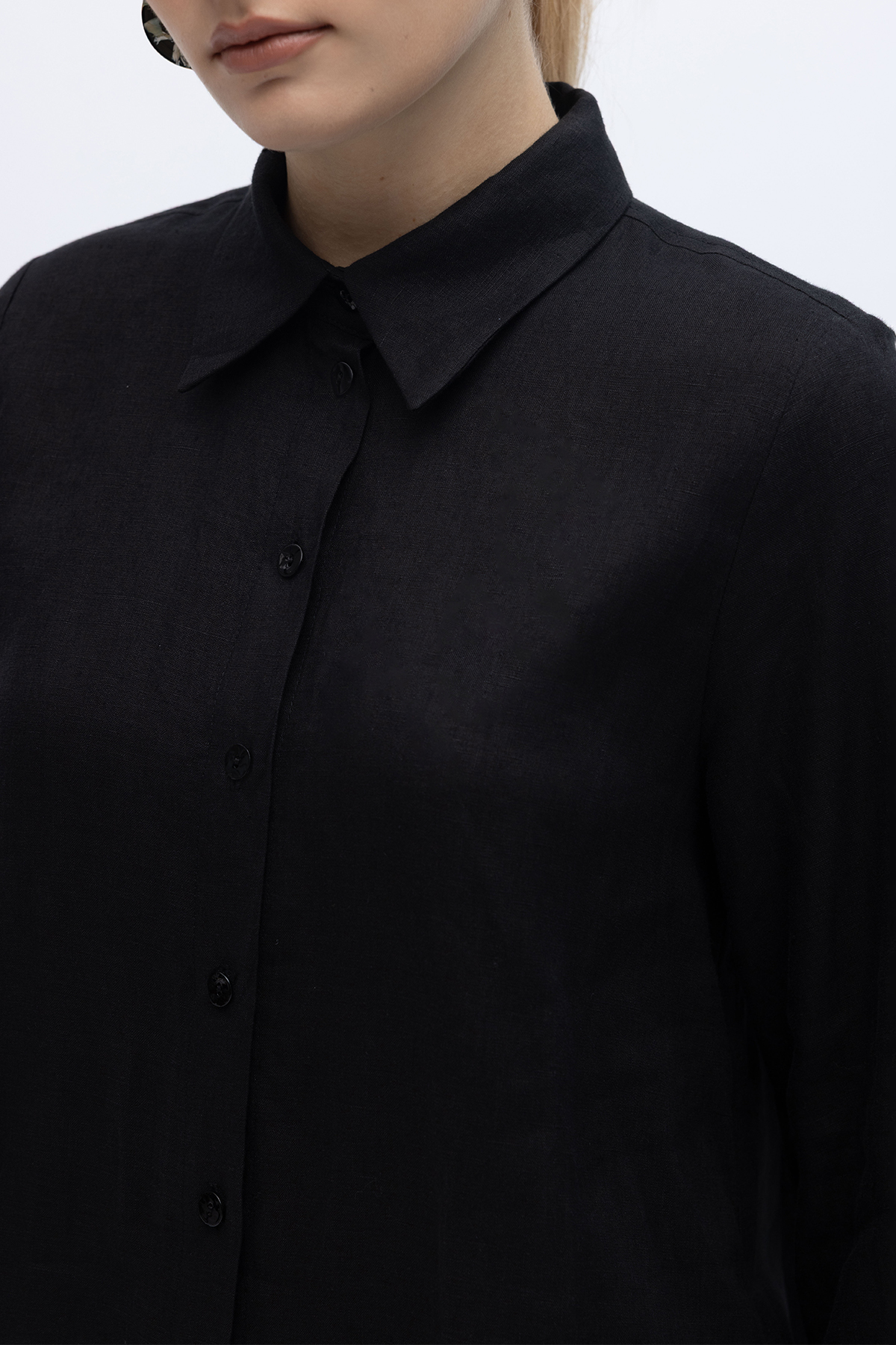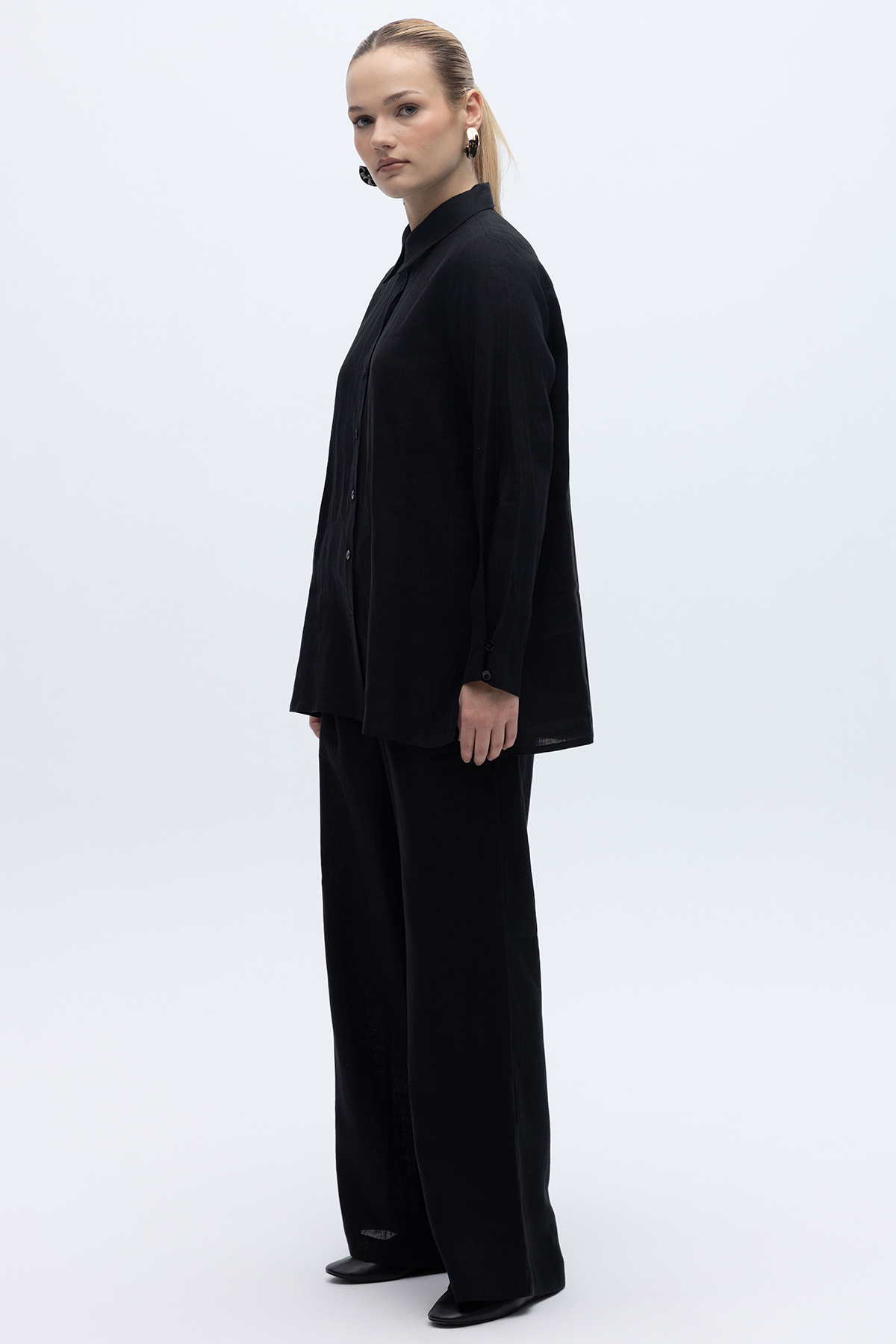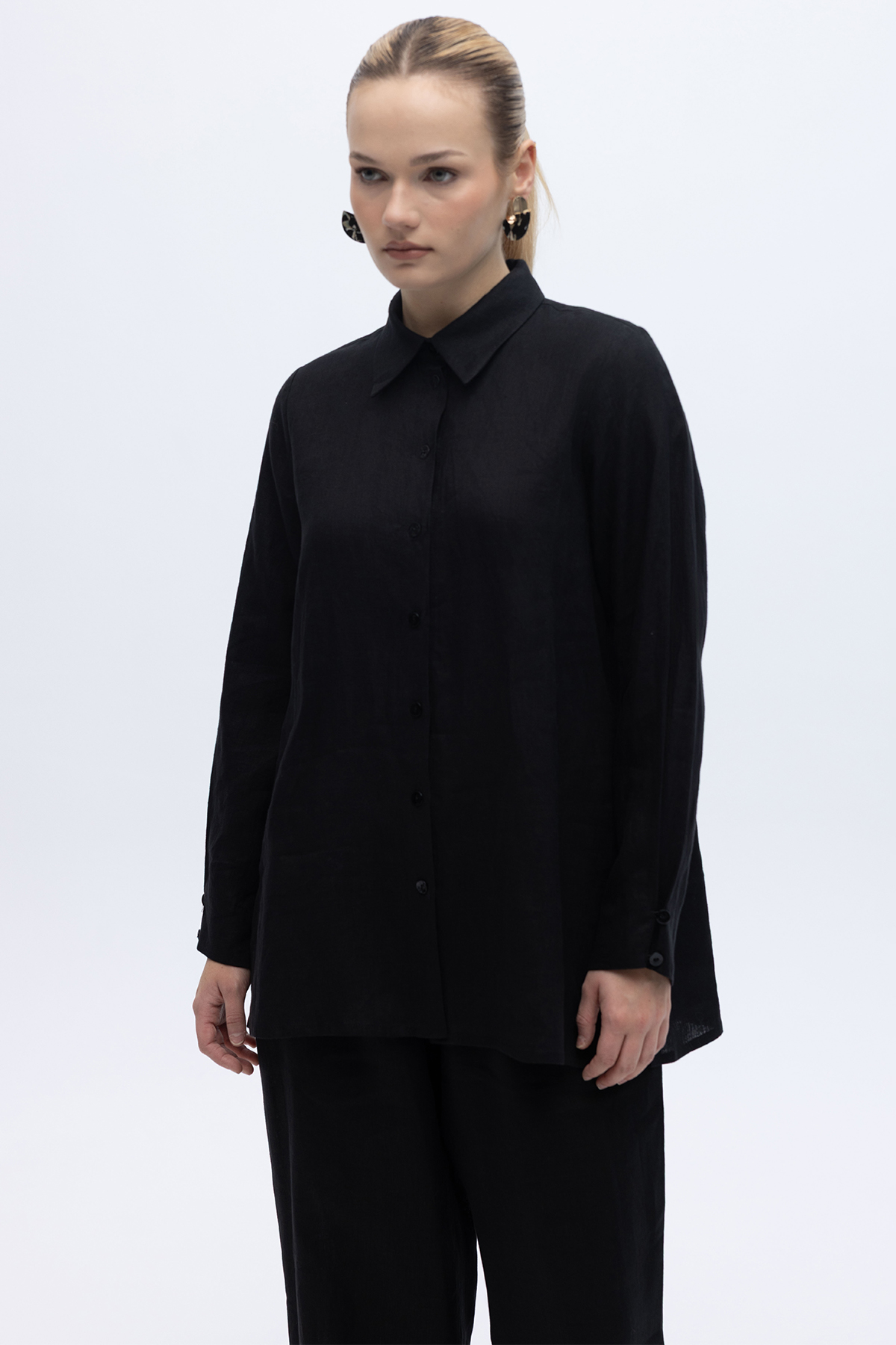 Erkek Yaka Düz Renk Keten Gömlek Siyah