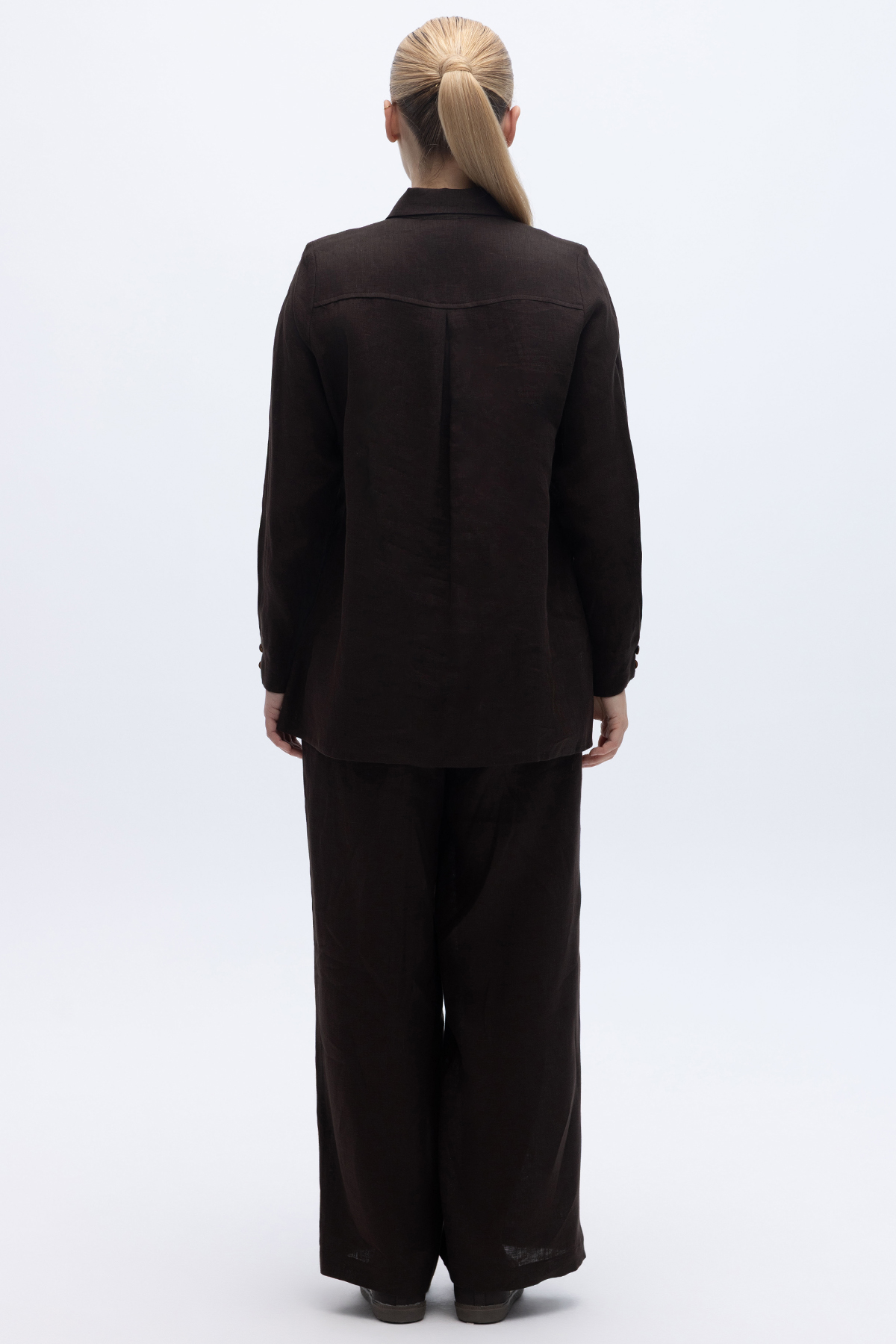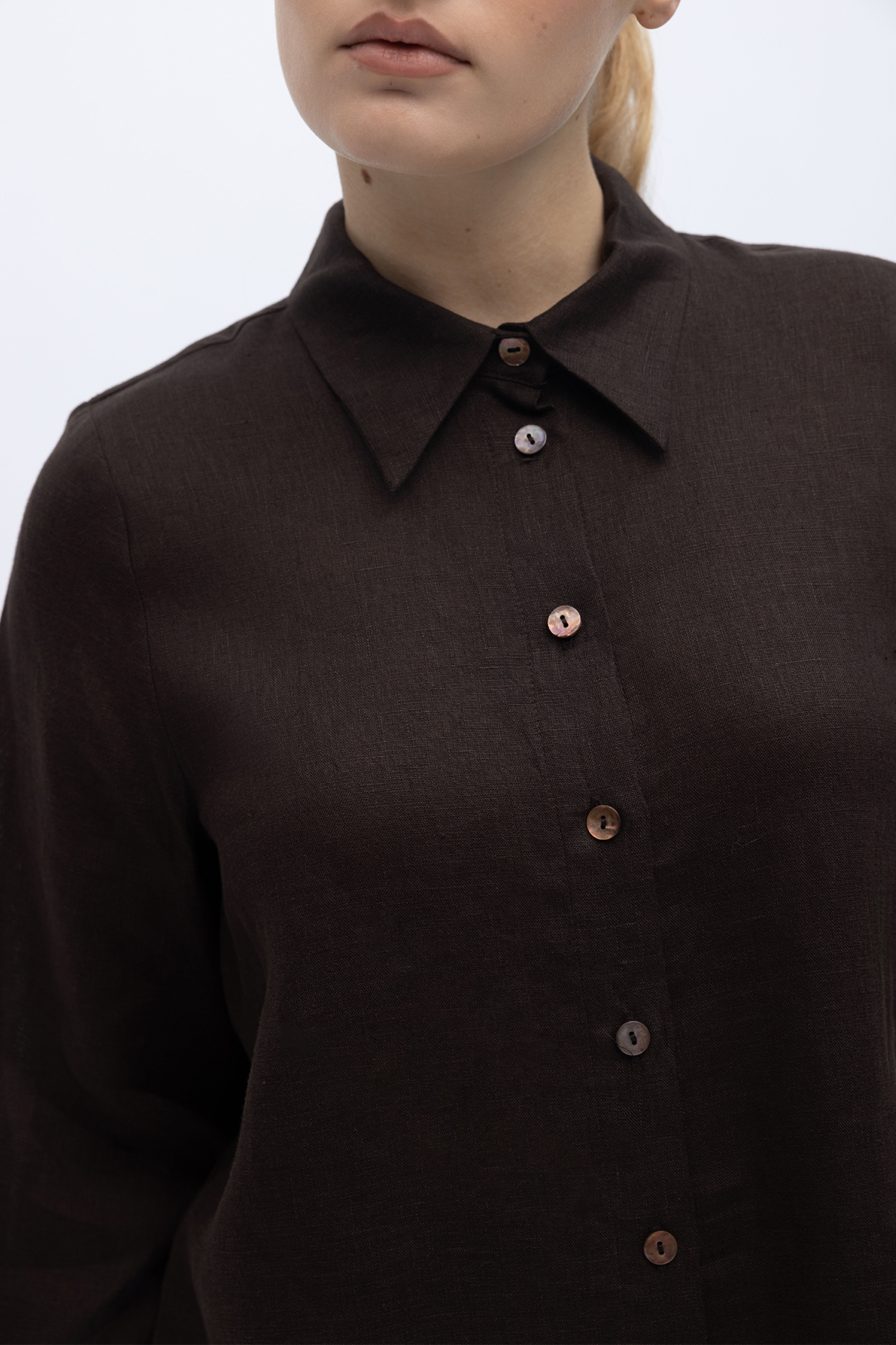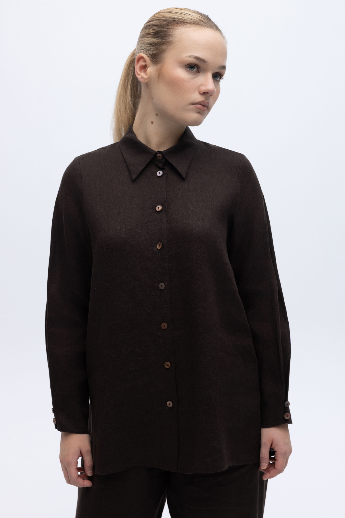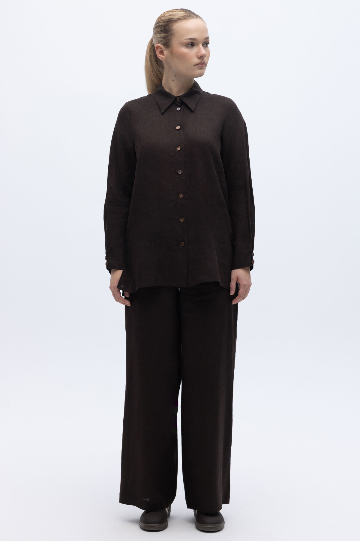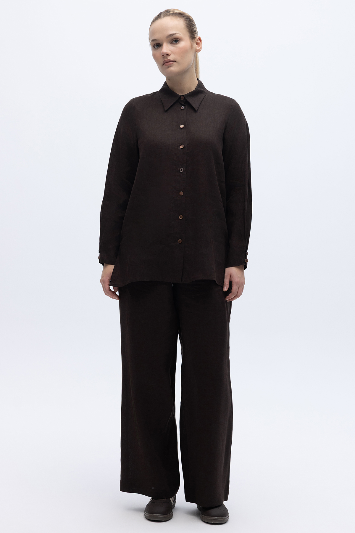 Erkek Yaka Düz Renk Keten Gömlek Kahverengi