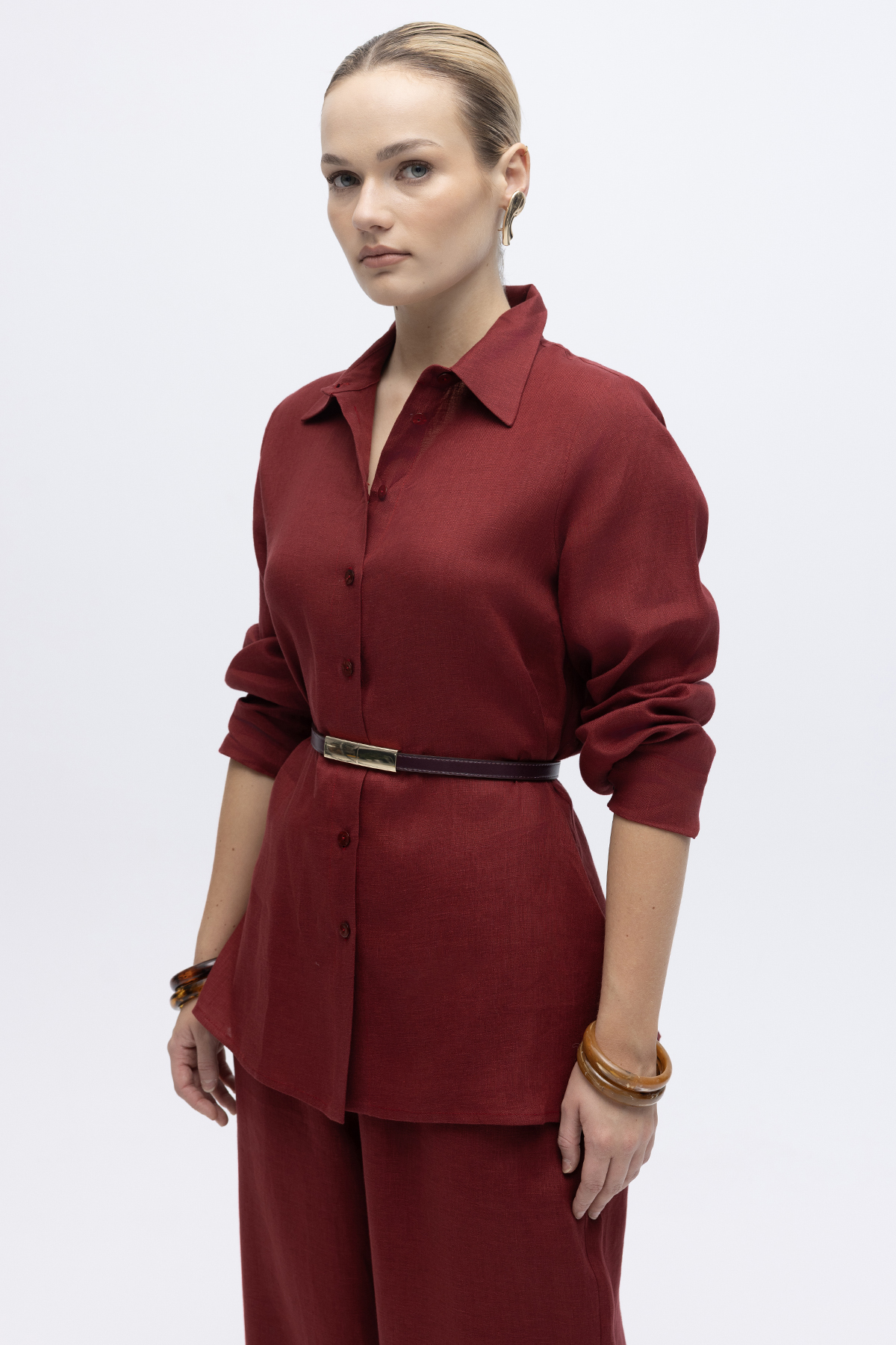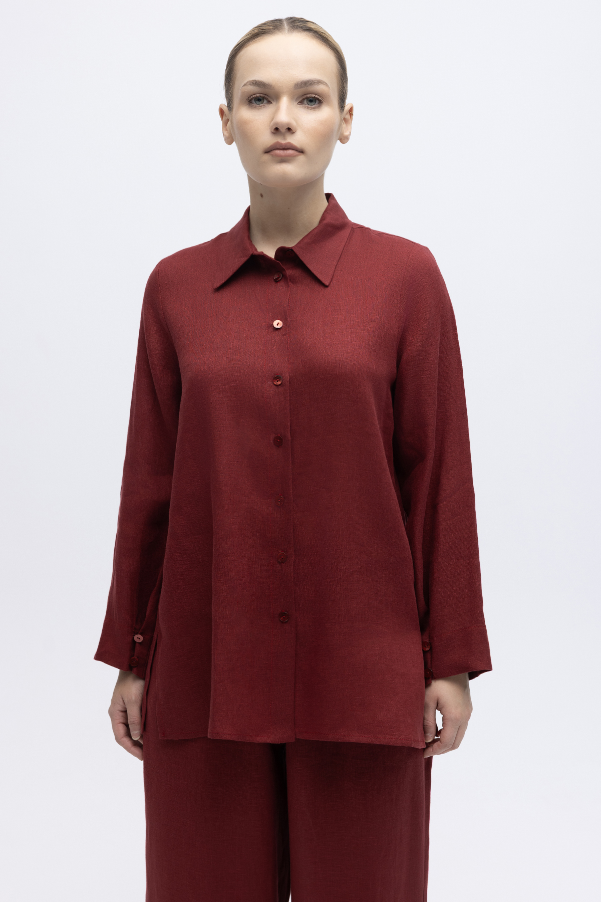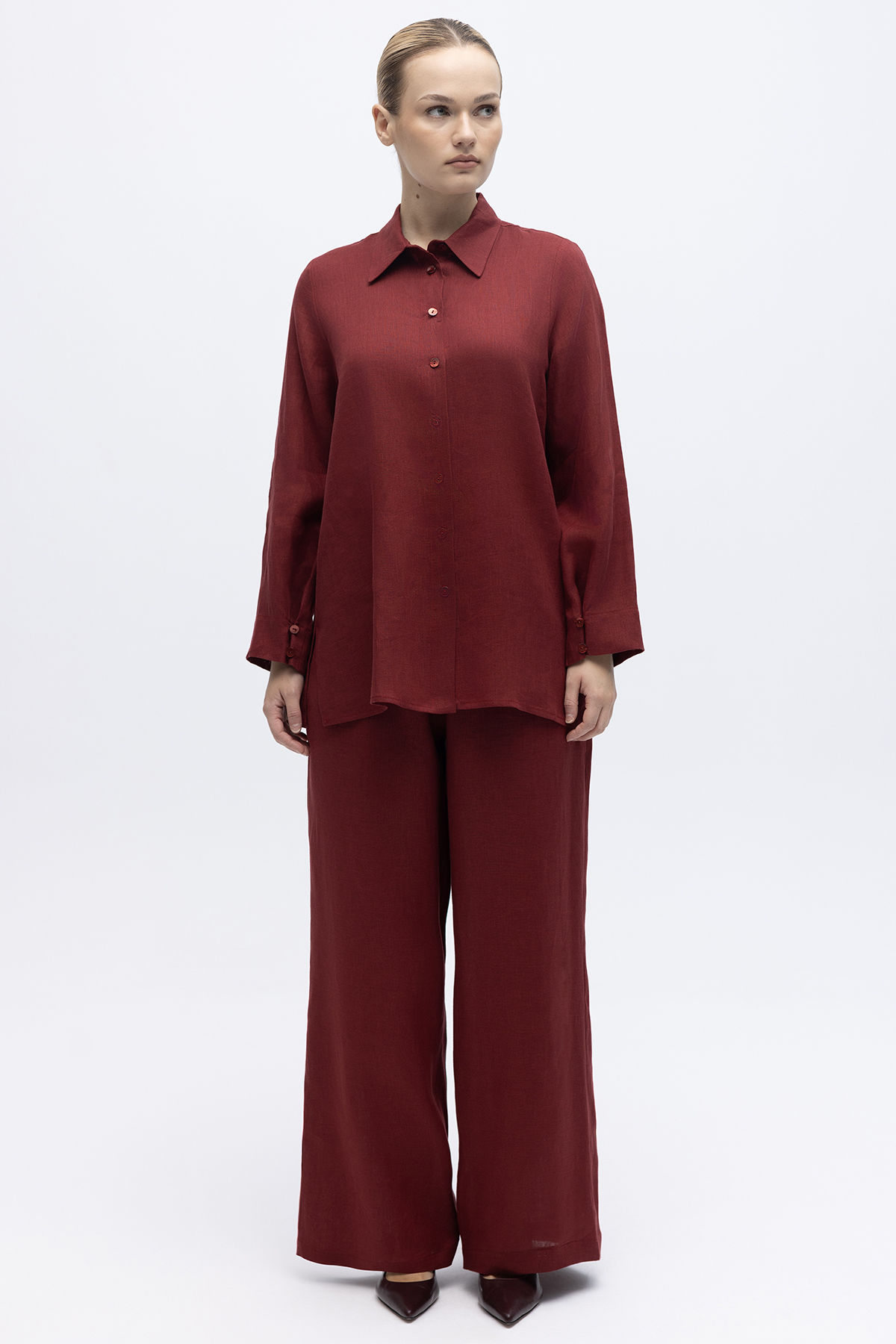 Erkek Yaka Düz Renk Keten Gömlek Cherry