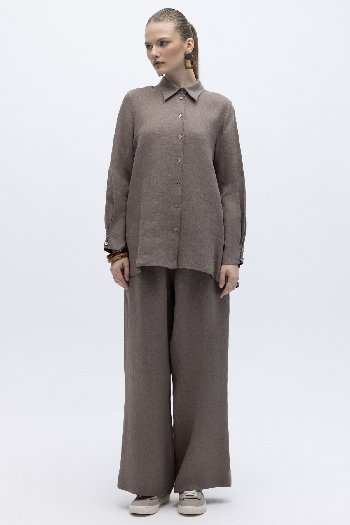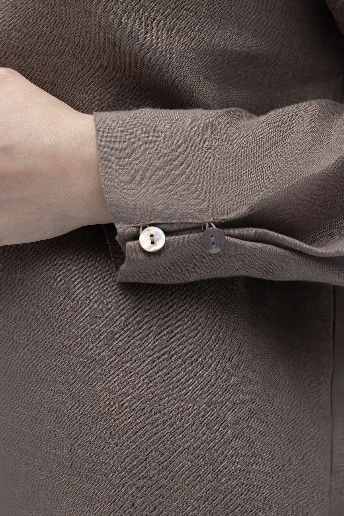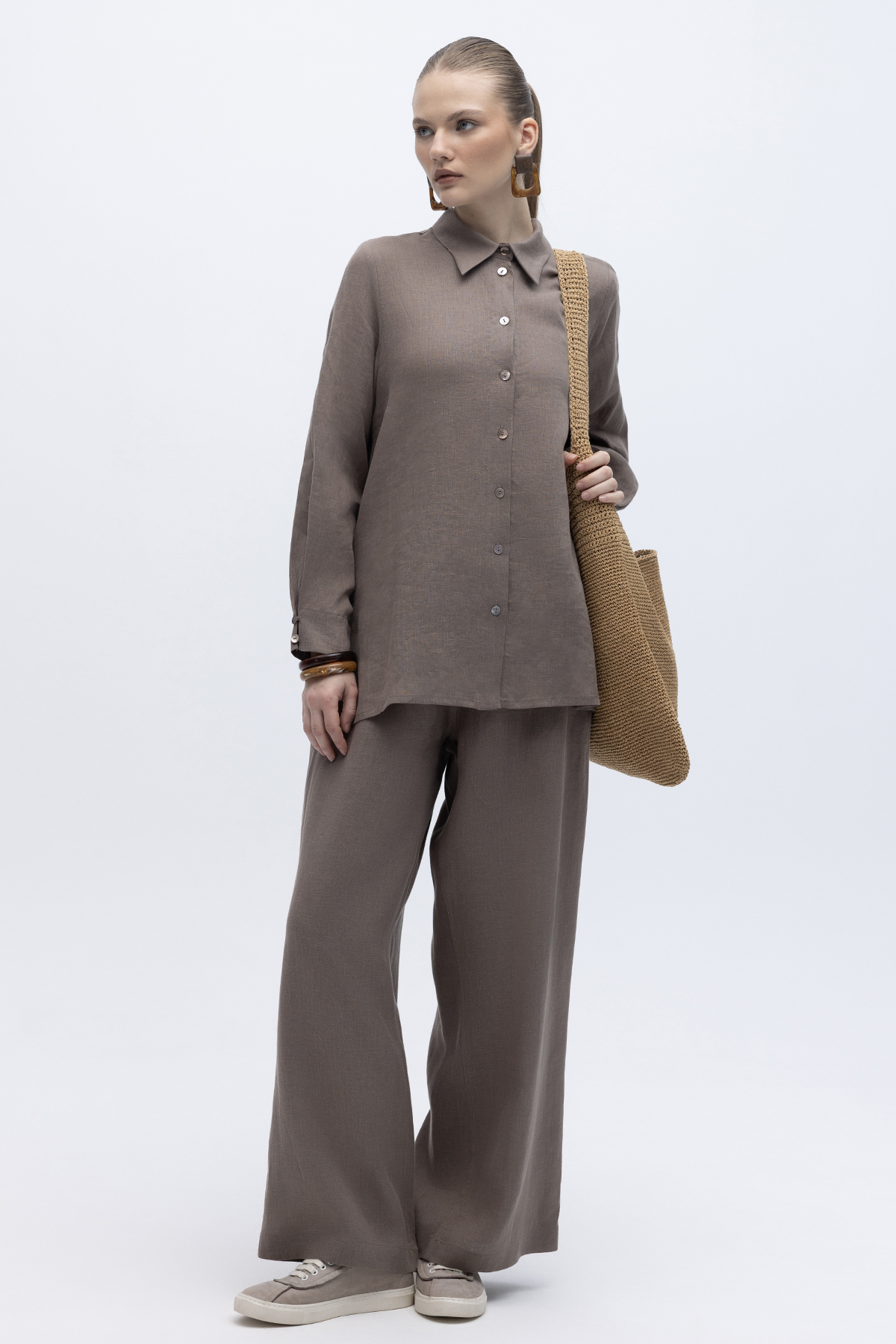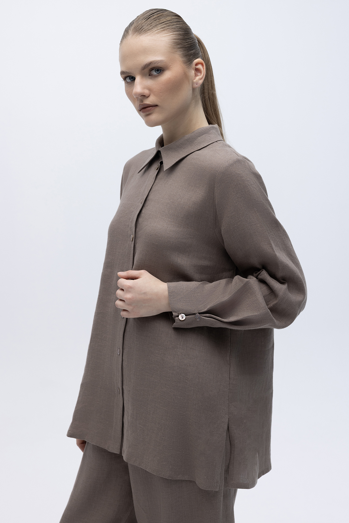 Erkek Yaka Düz Renk Keten Gömlek Mink