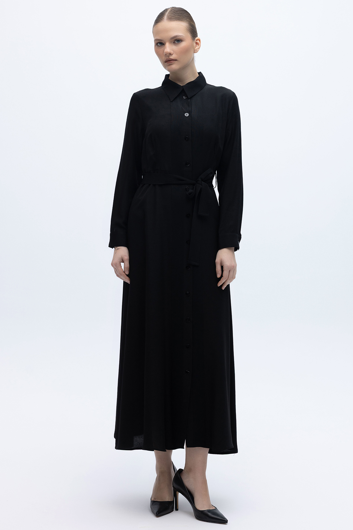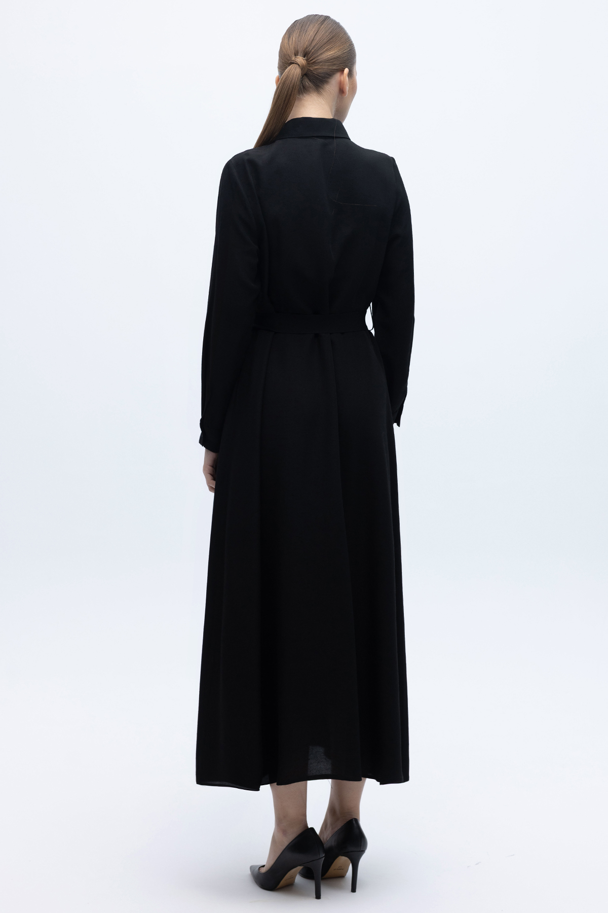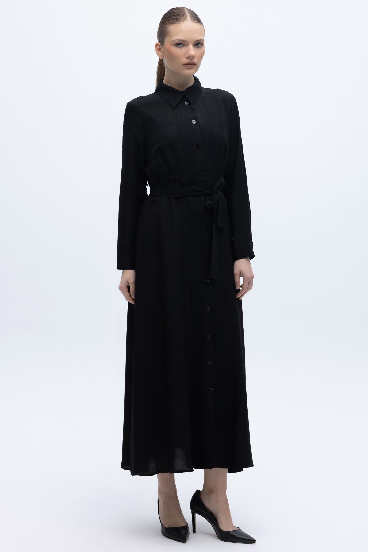 Erkek Yaka İpek Keten Uzun Elbise Siyah