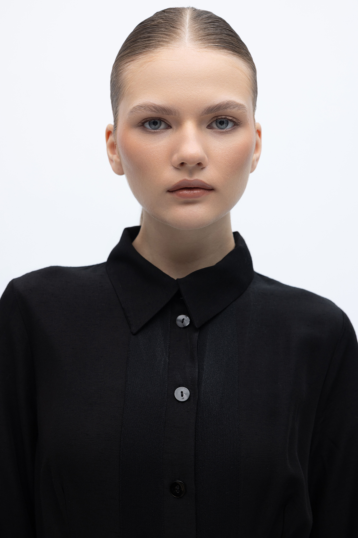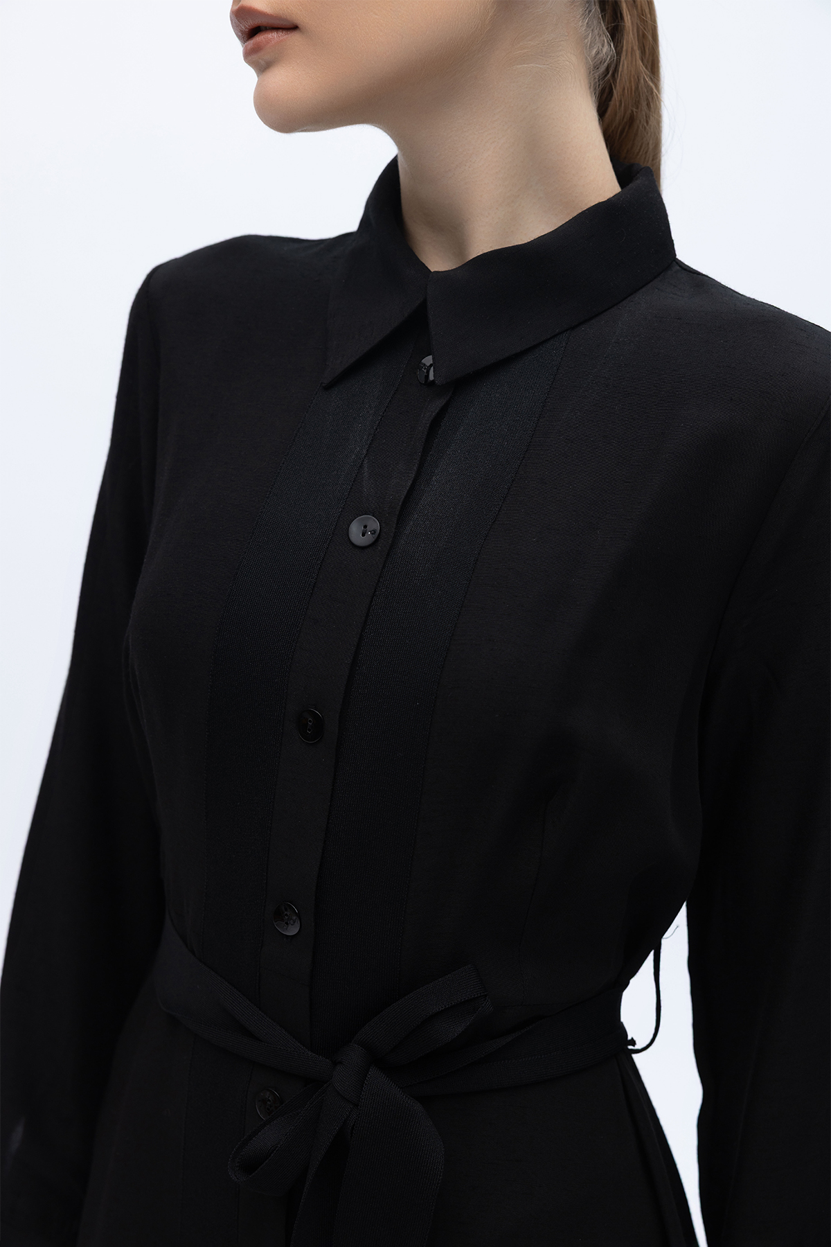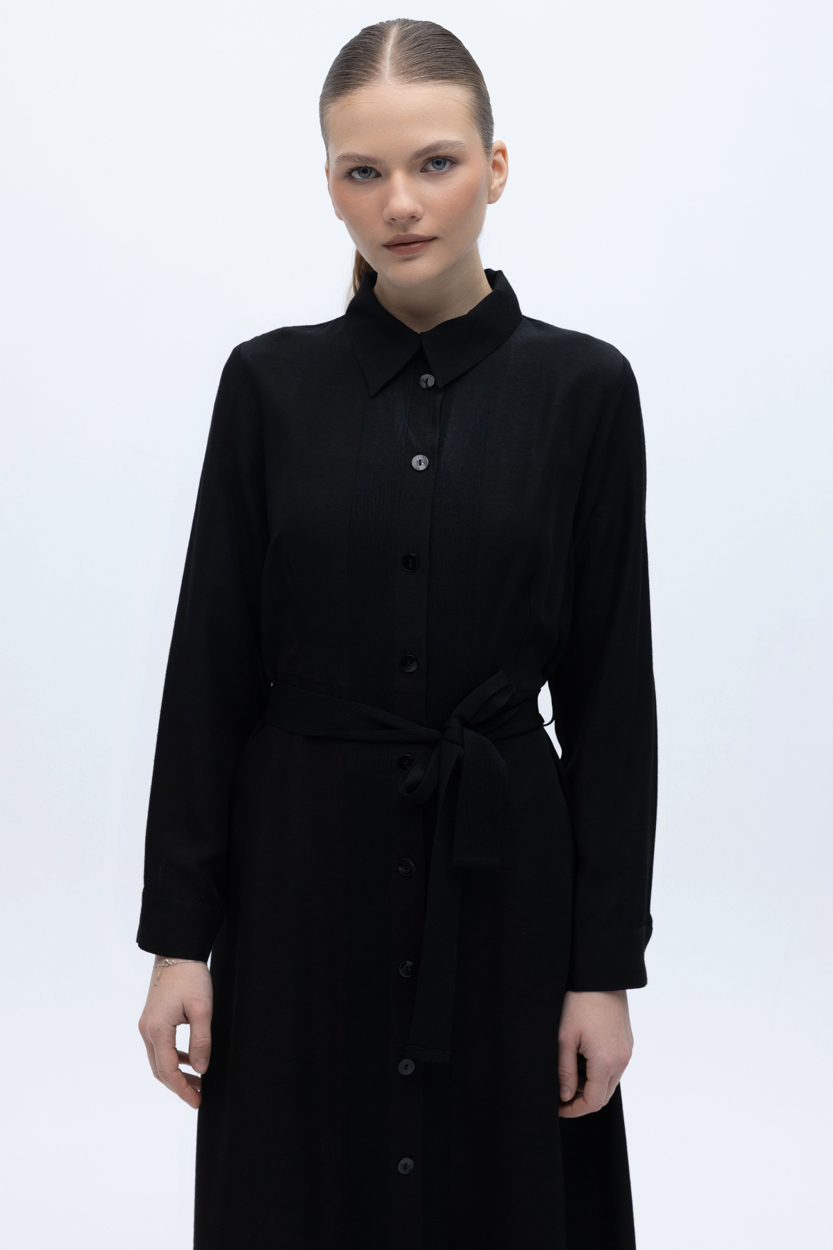 Erkek Yaka İpek Keten Uzun Elbise Siyah