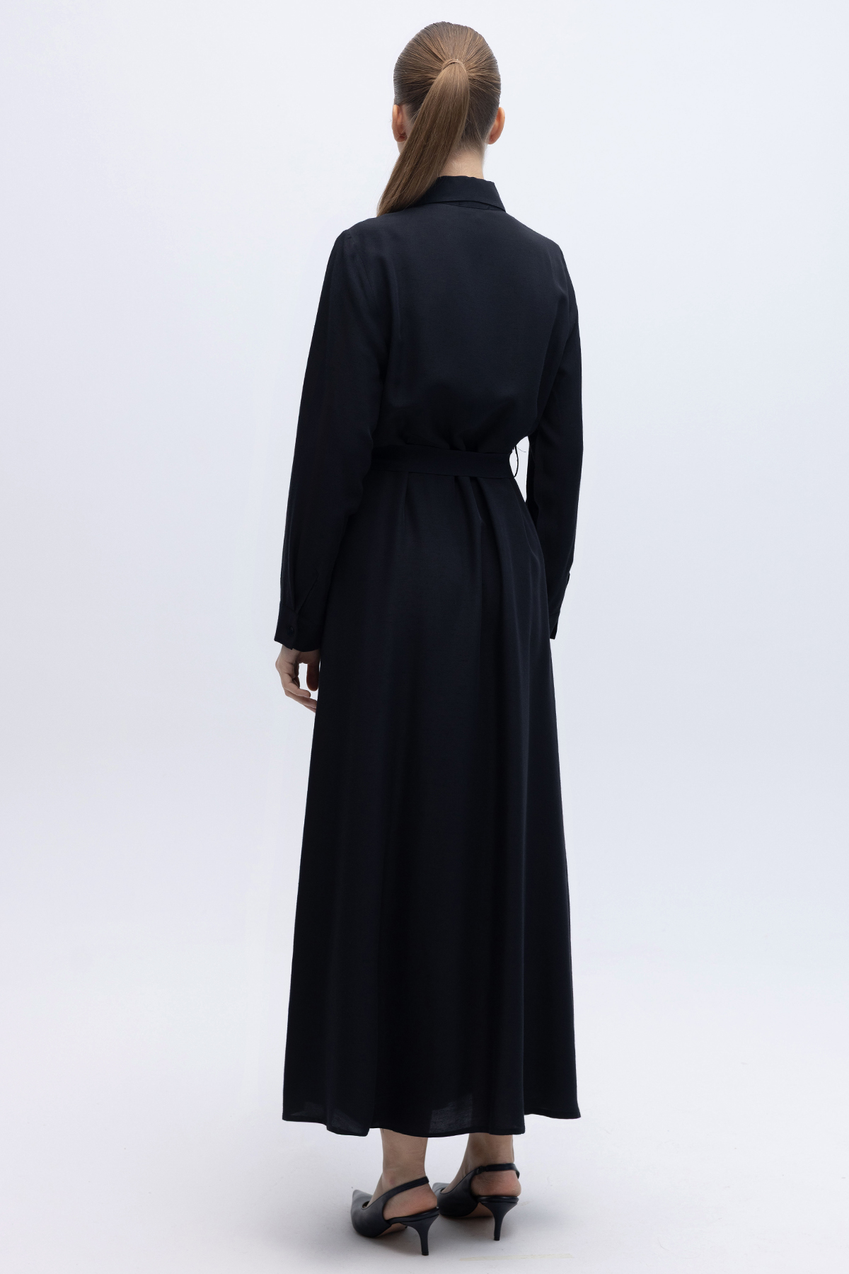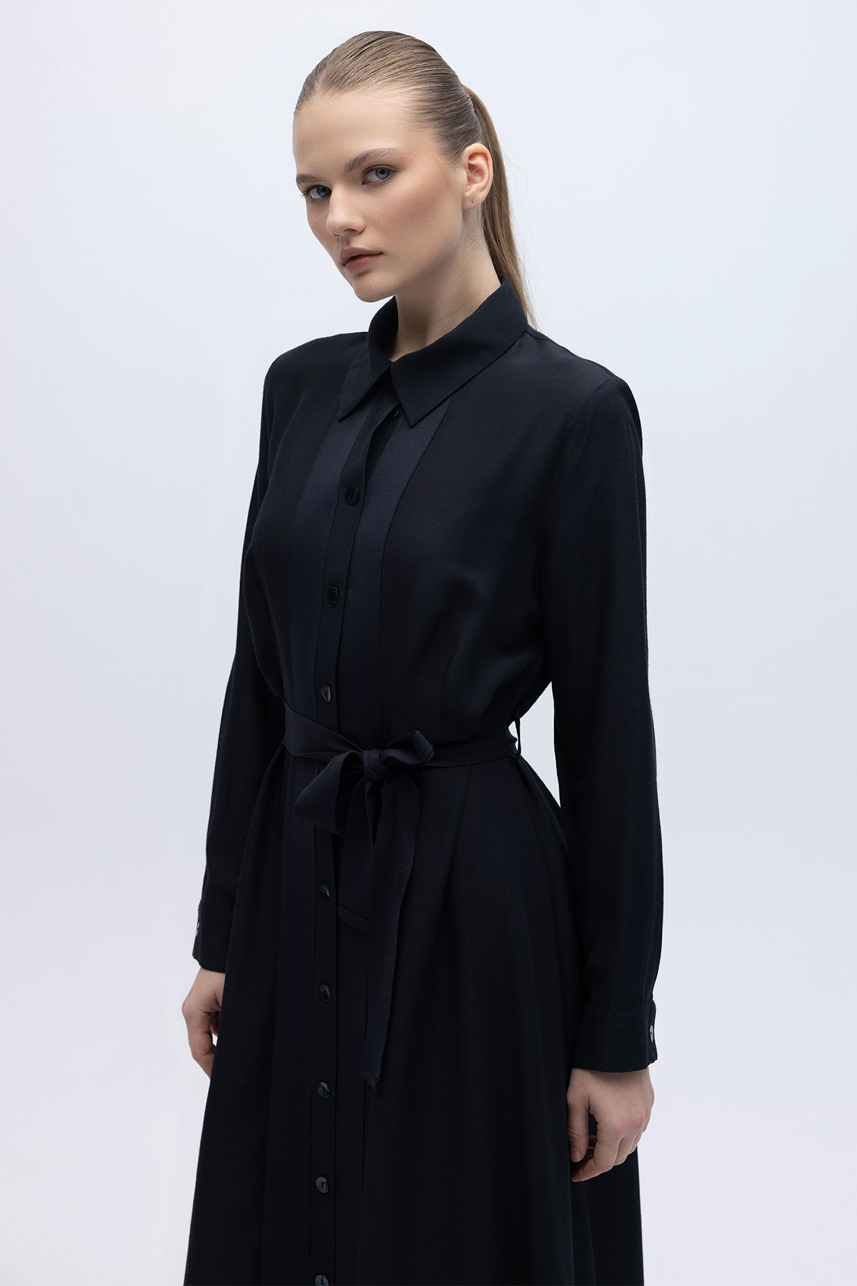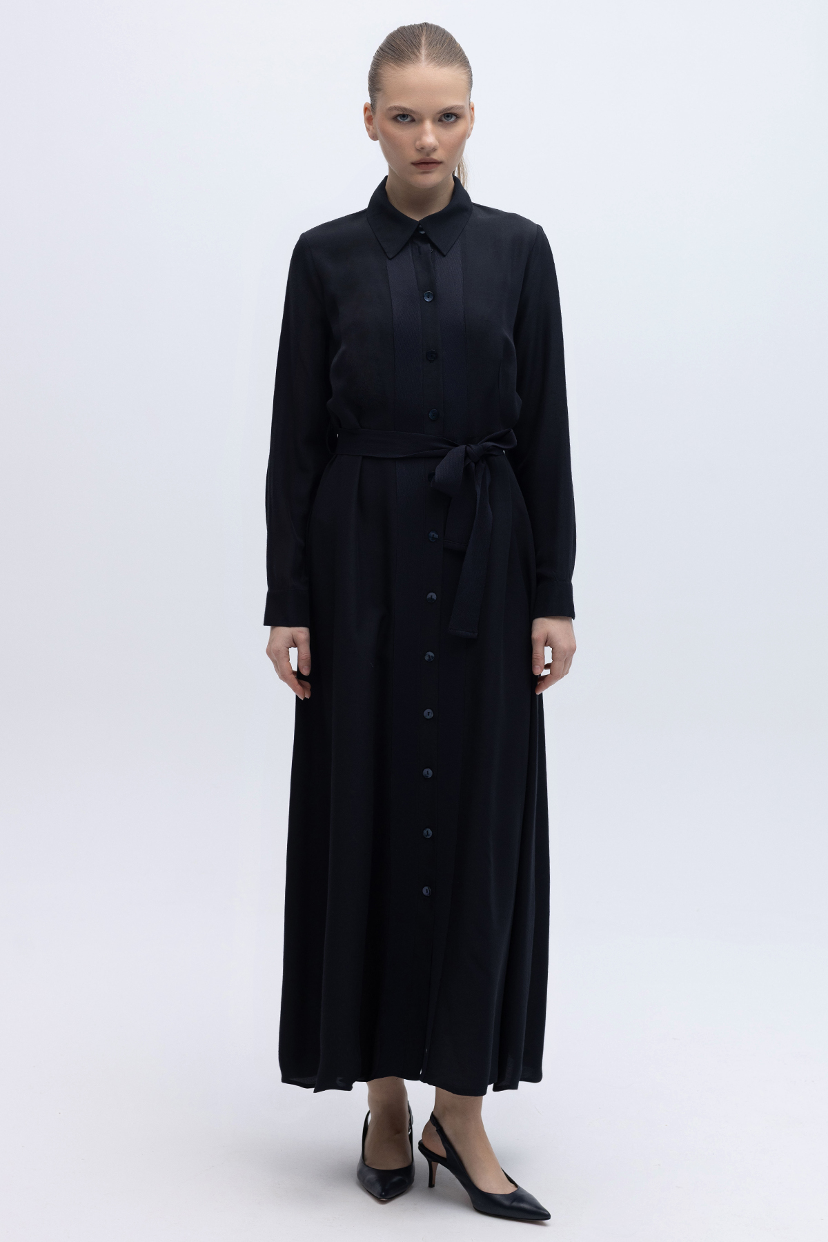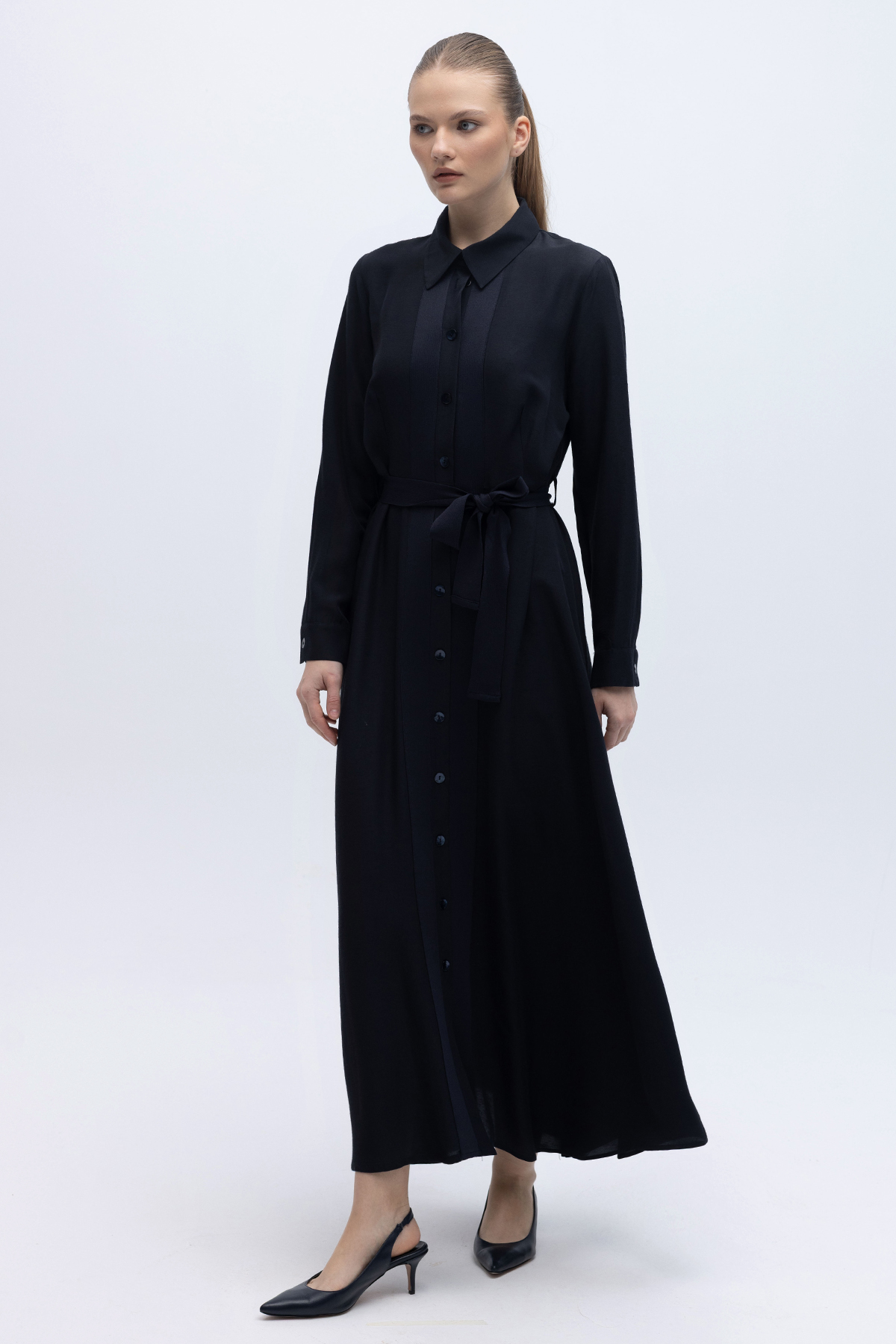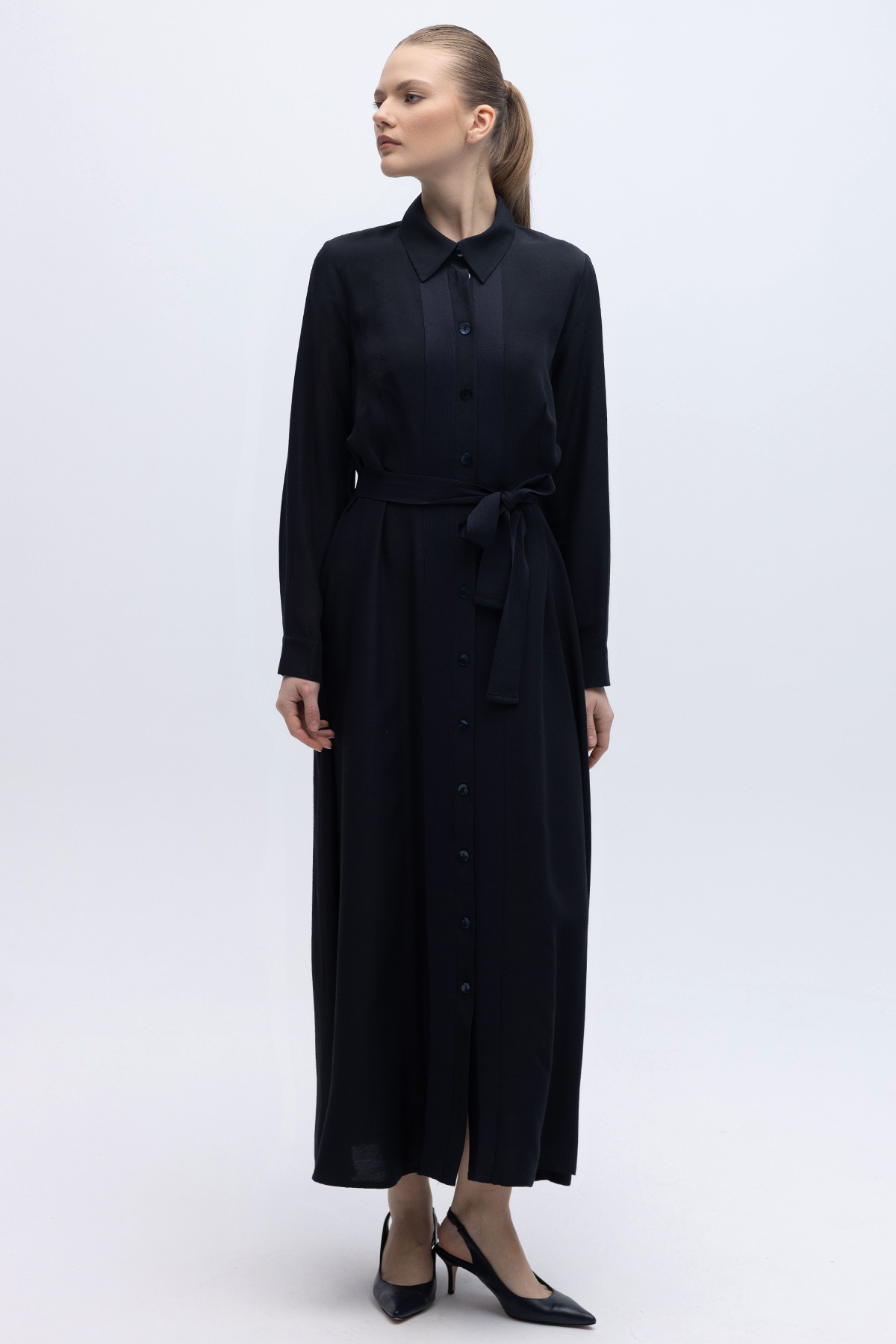 Belden Oturmalı Uzun Kollu Poplin Elbise Lacivert
