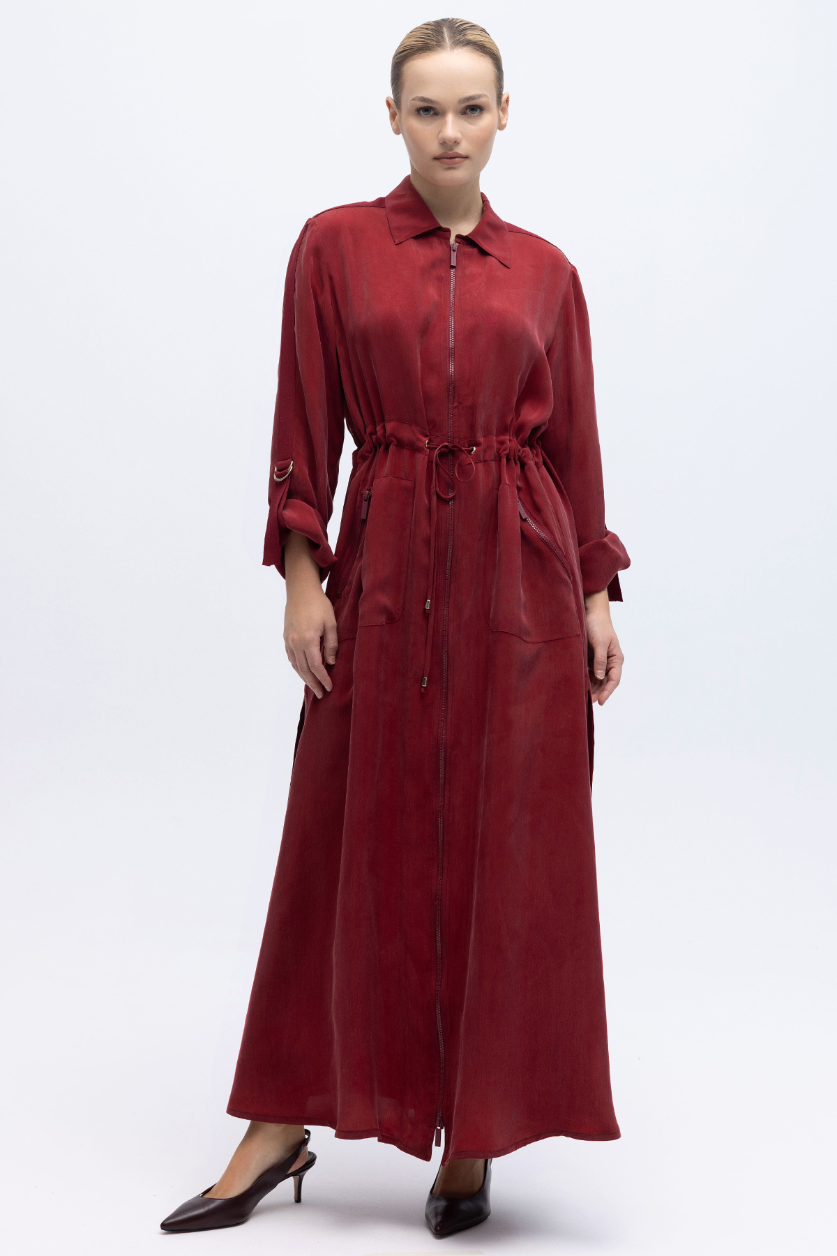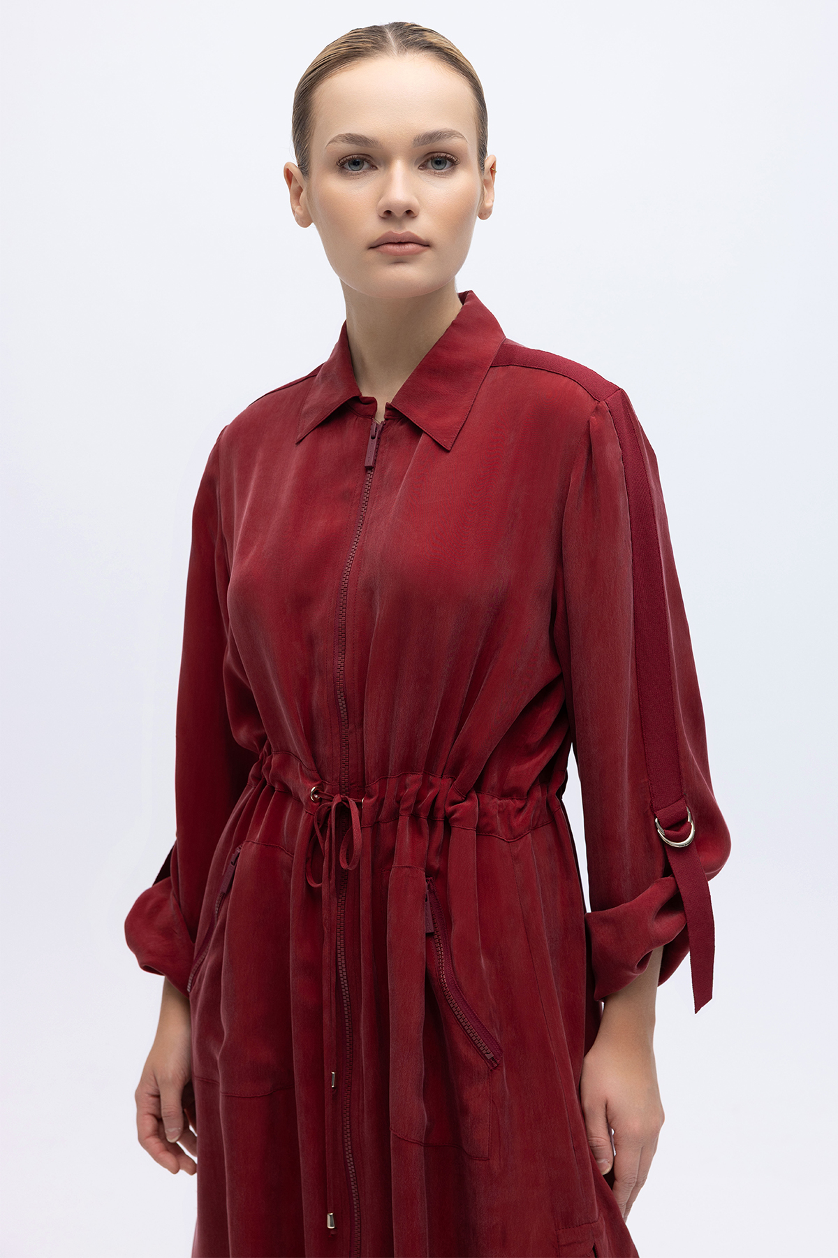 Fermuarlı Beli Büzgülü Cupro Ceket Cherry