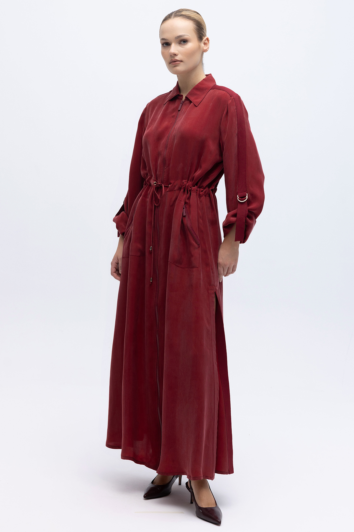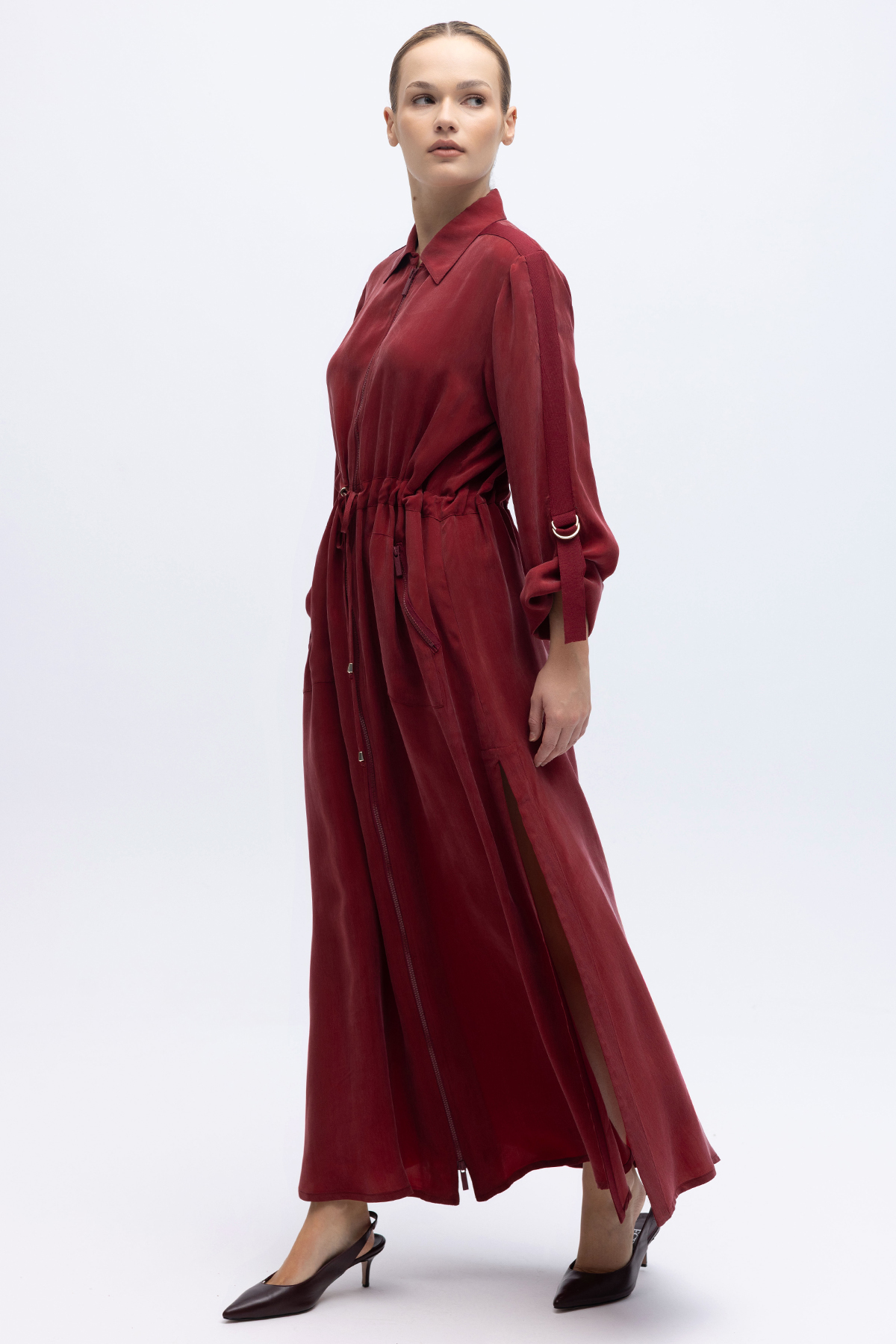 Gömlek Yaka İpek Keten Uzun Elbise Kırmızı