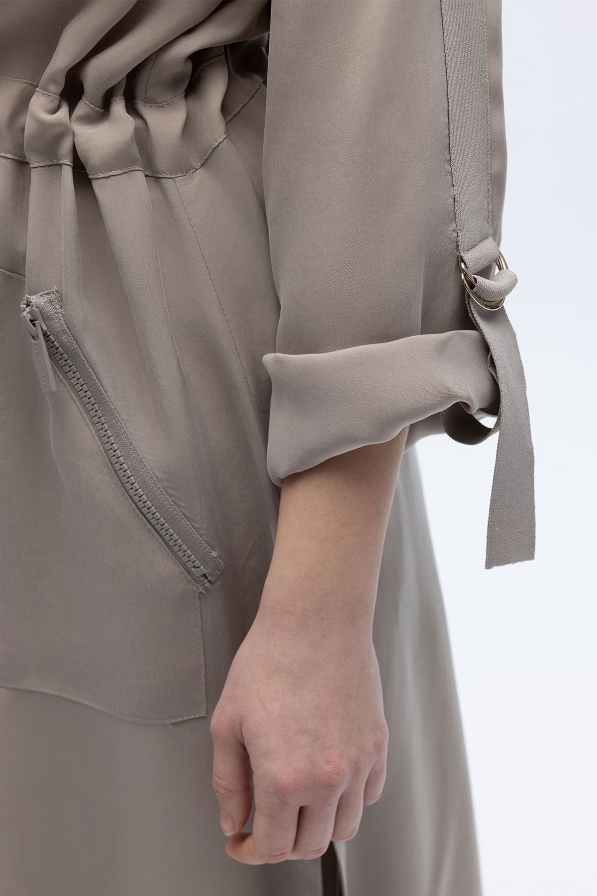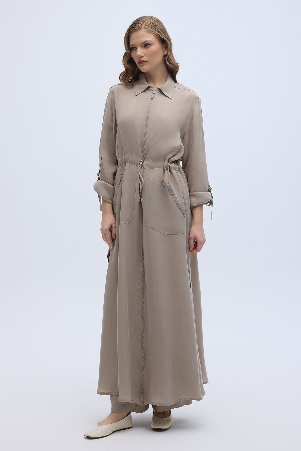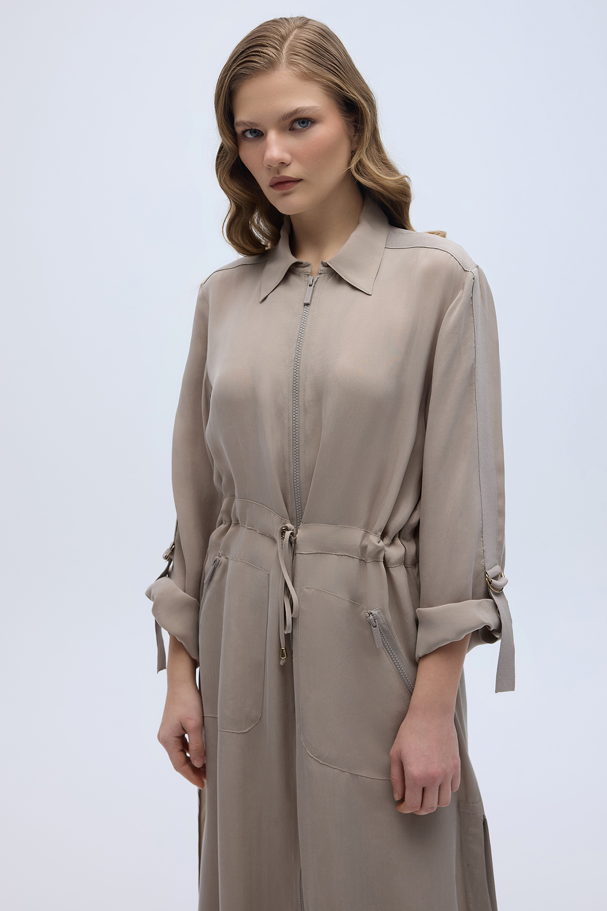 Fermuarlı Beli Büzgülü Cupro Ceket Stone