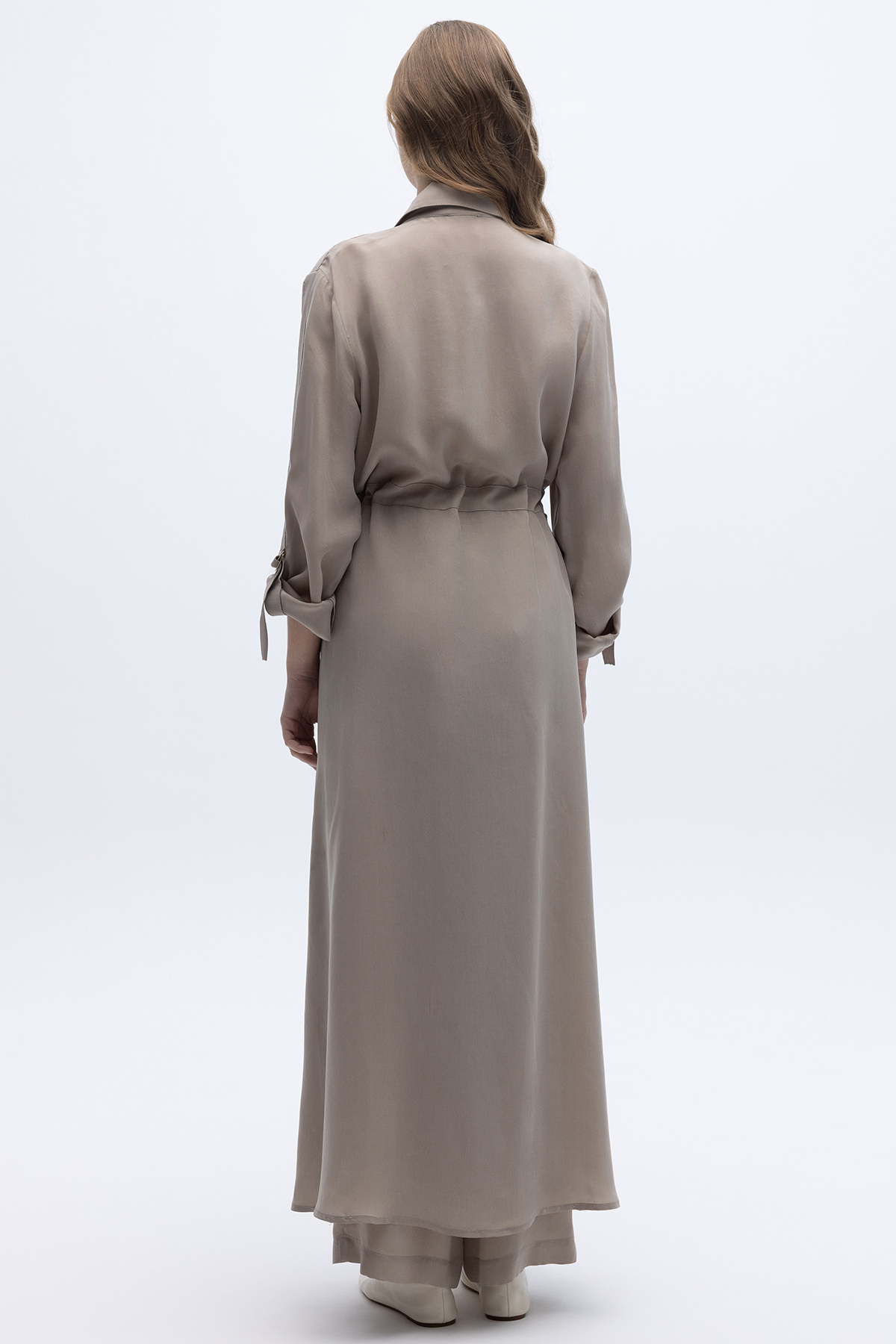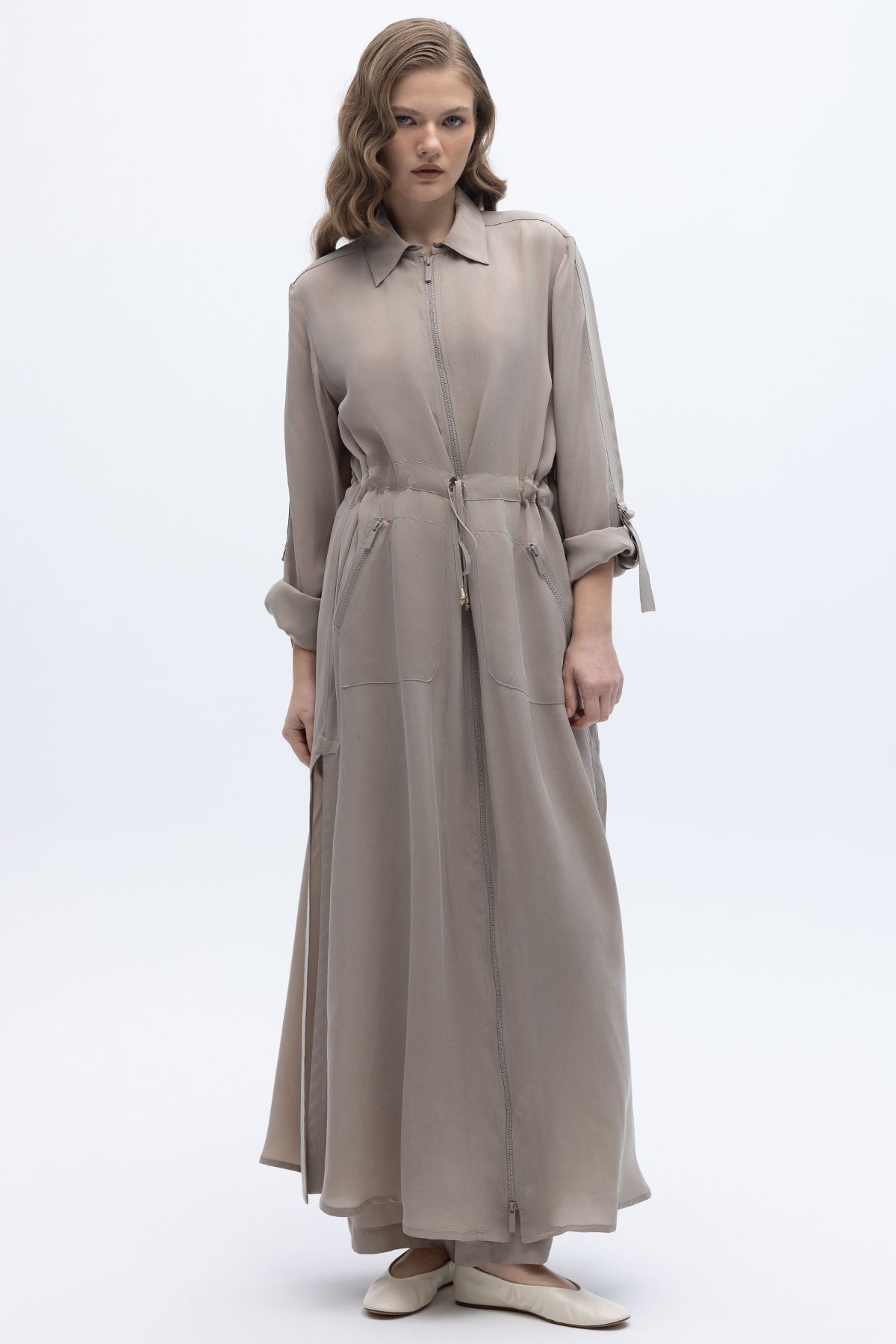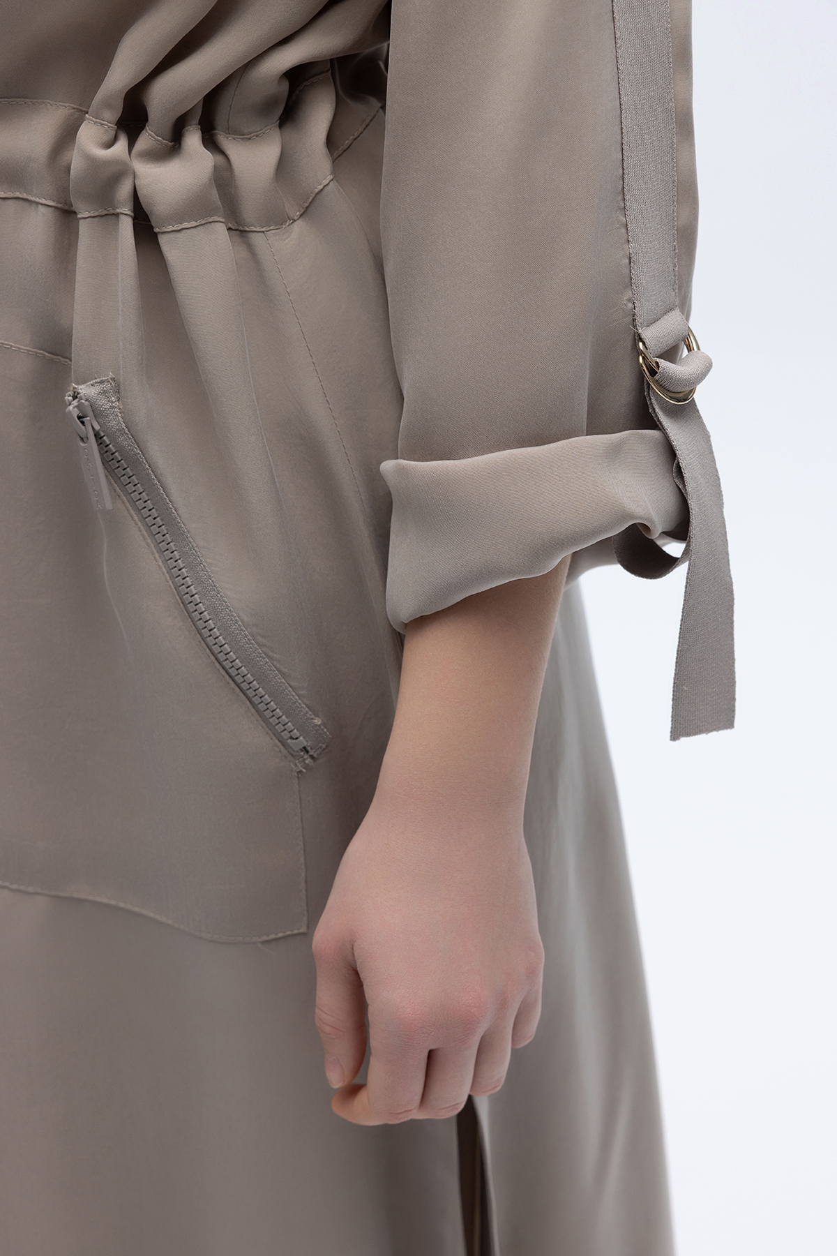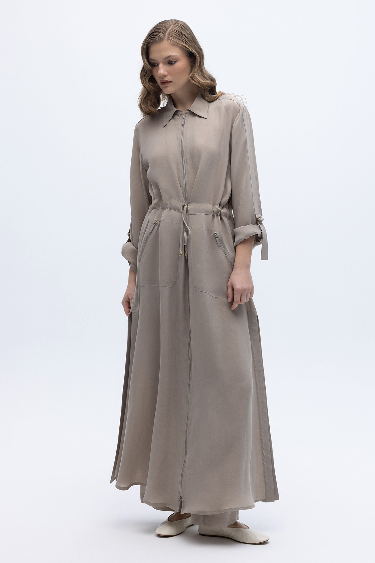 Fermuarlı Beli Büzgülü Cupro Ceket Stone