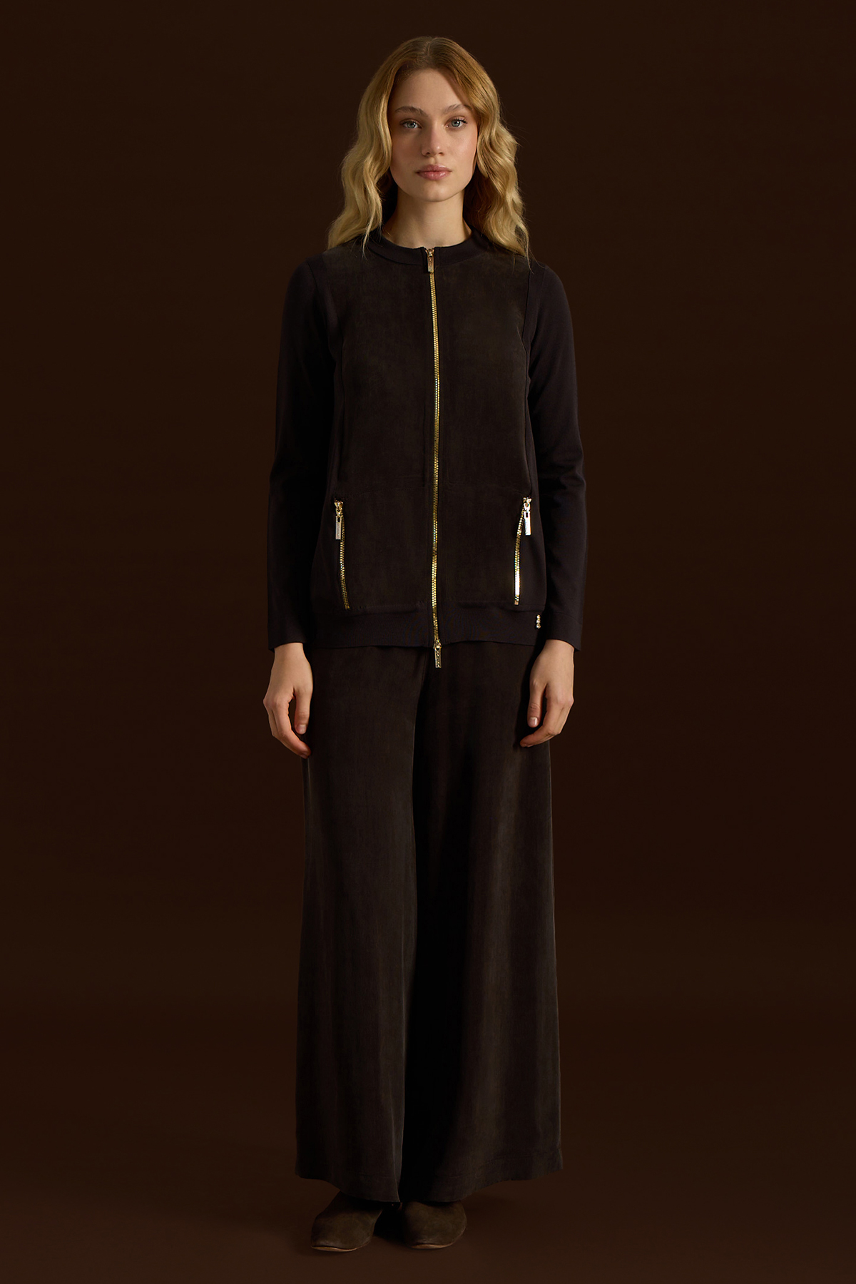 Fermuarlı Cupro Detaylı Triko Ceket Kahverengi