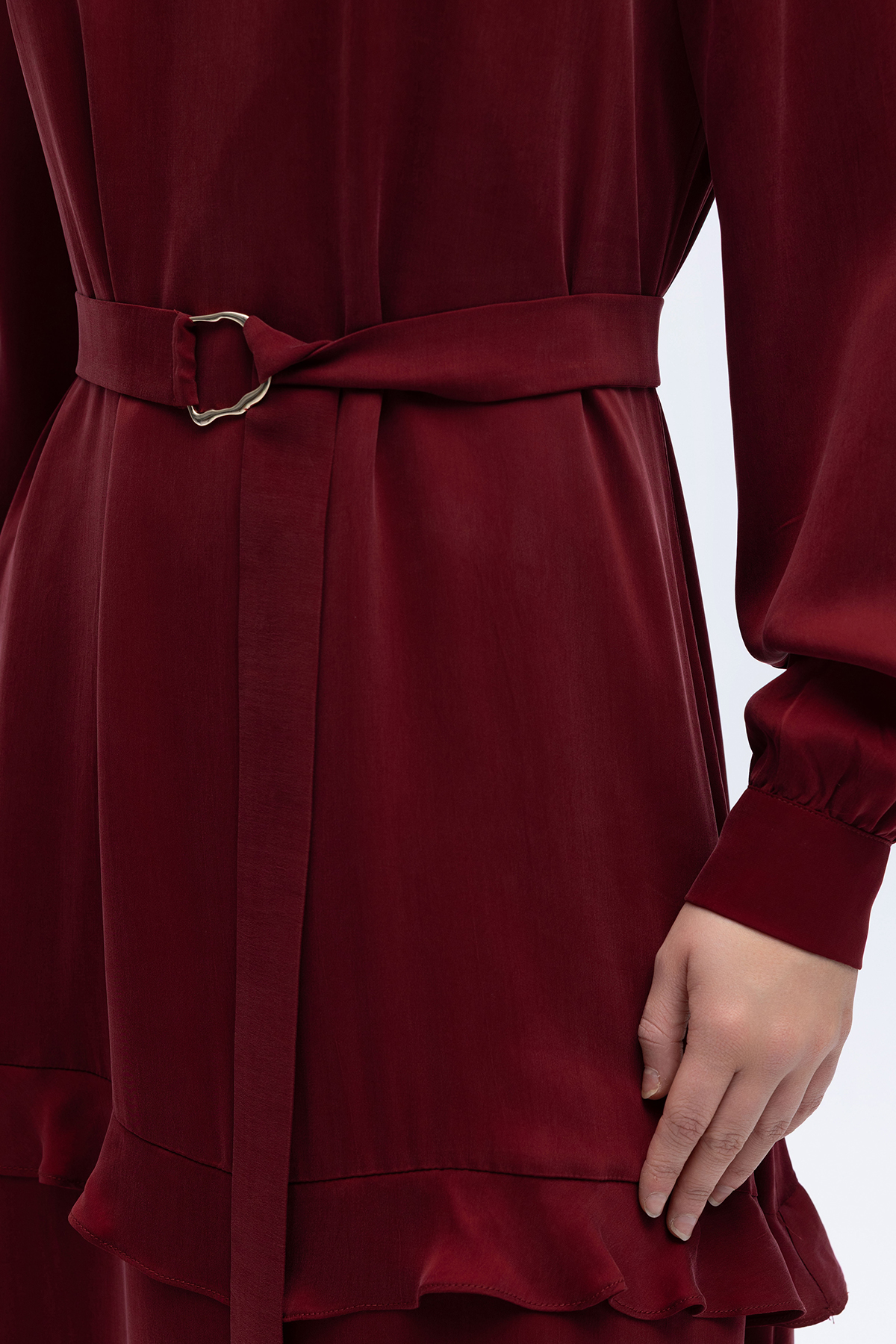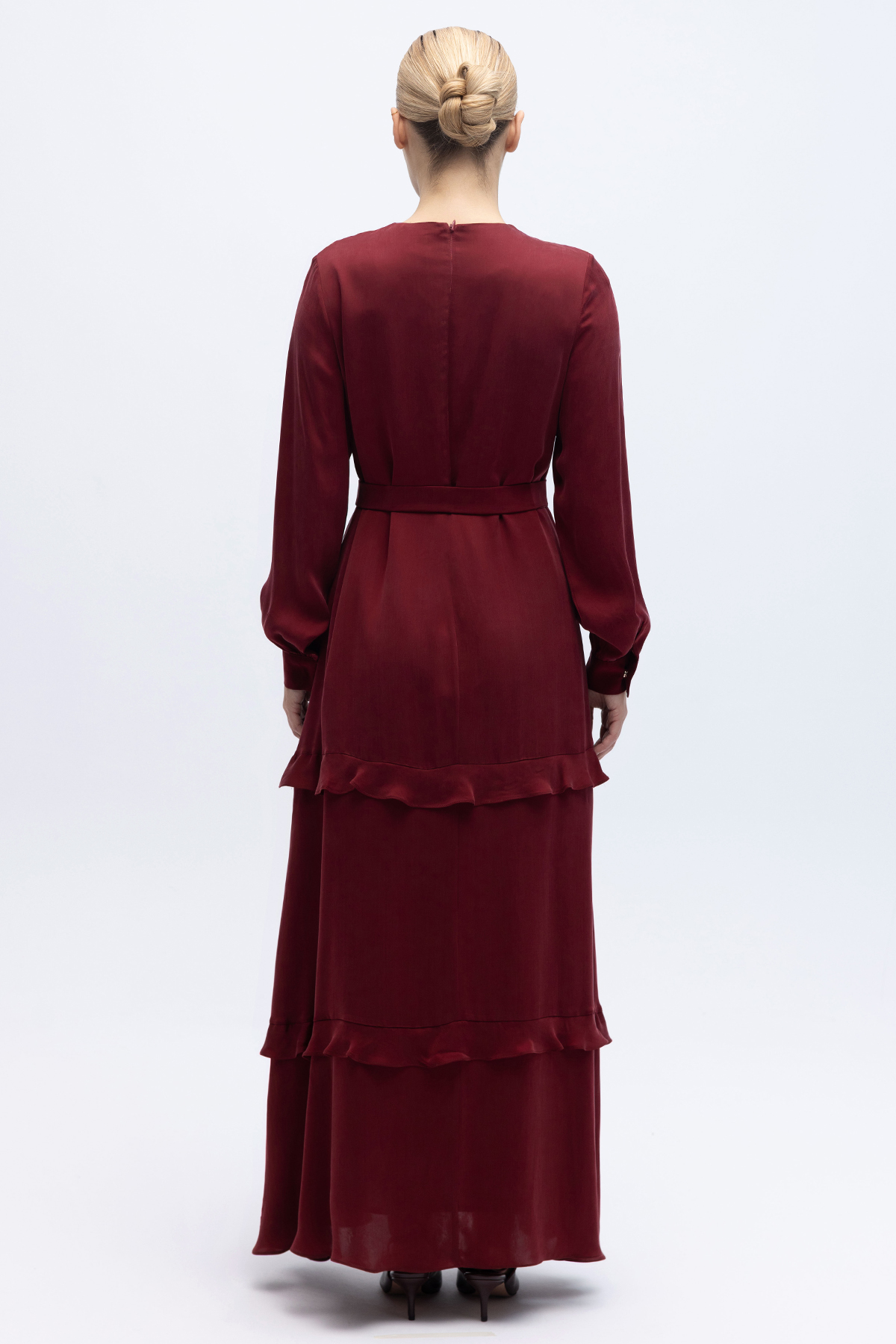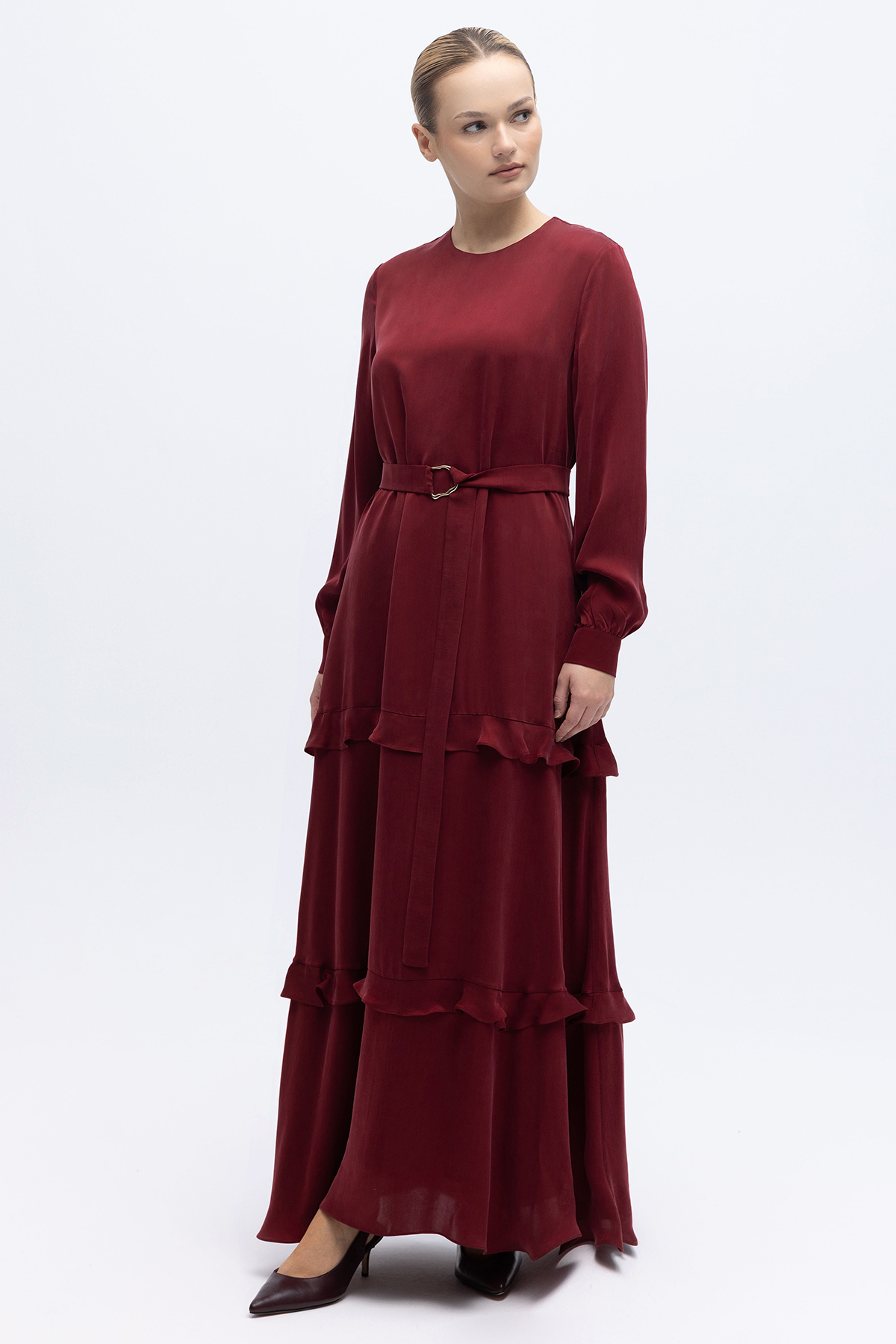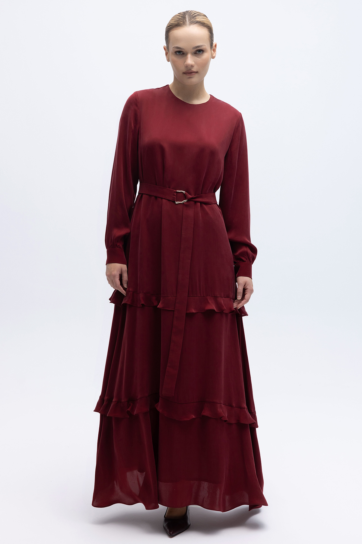 Fırfır Detaylı Uzun Cupro Elbise Cherry