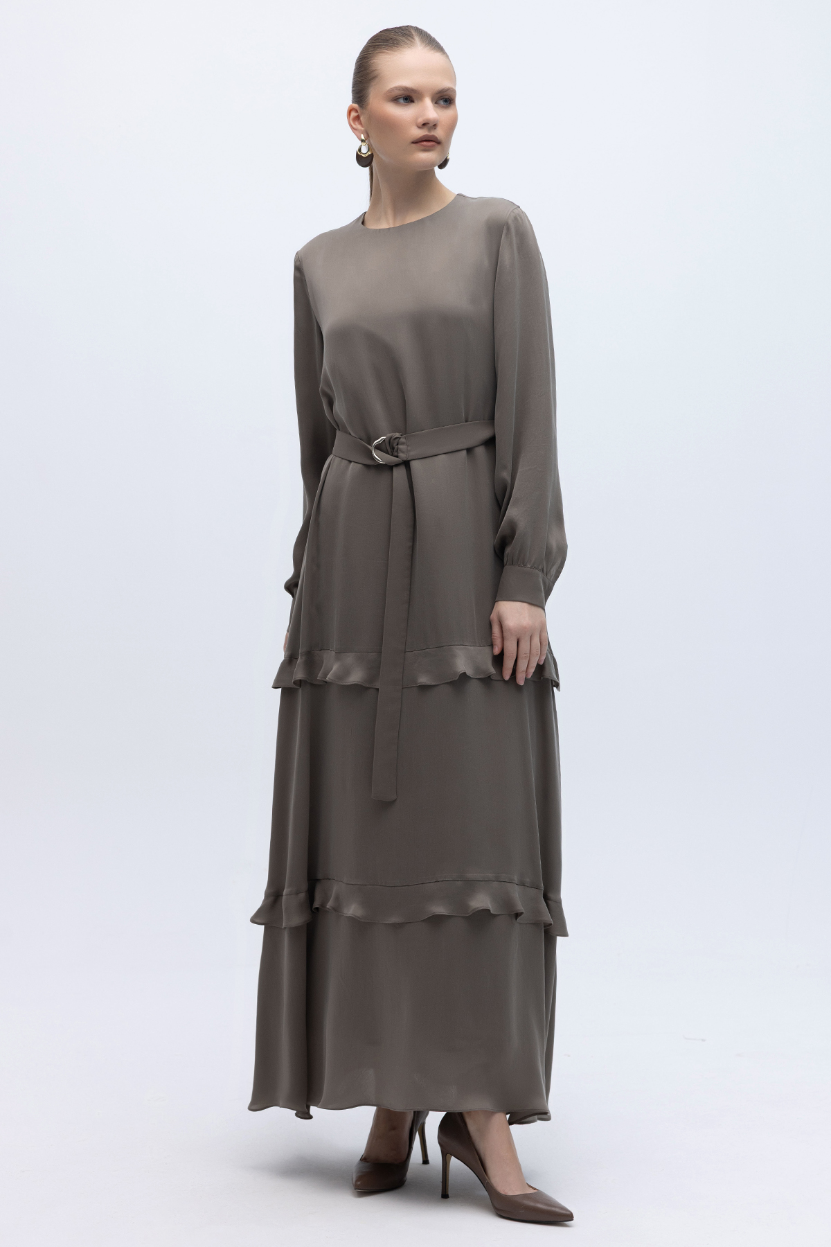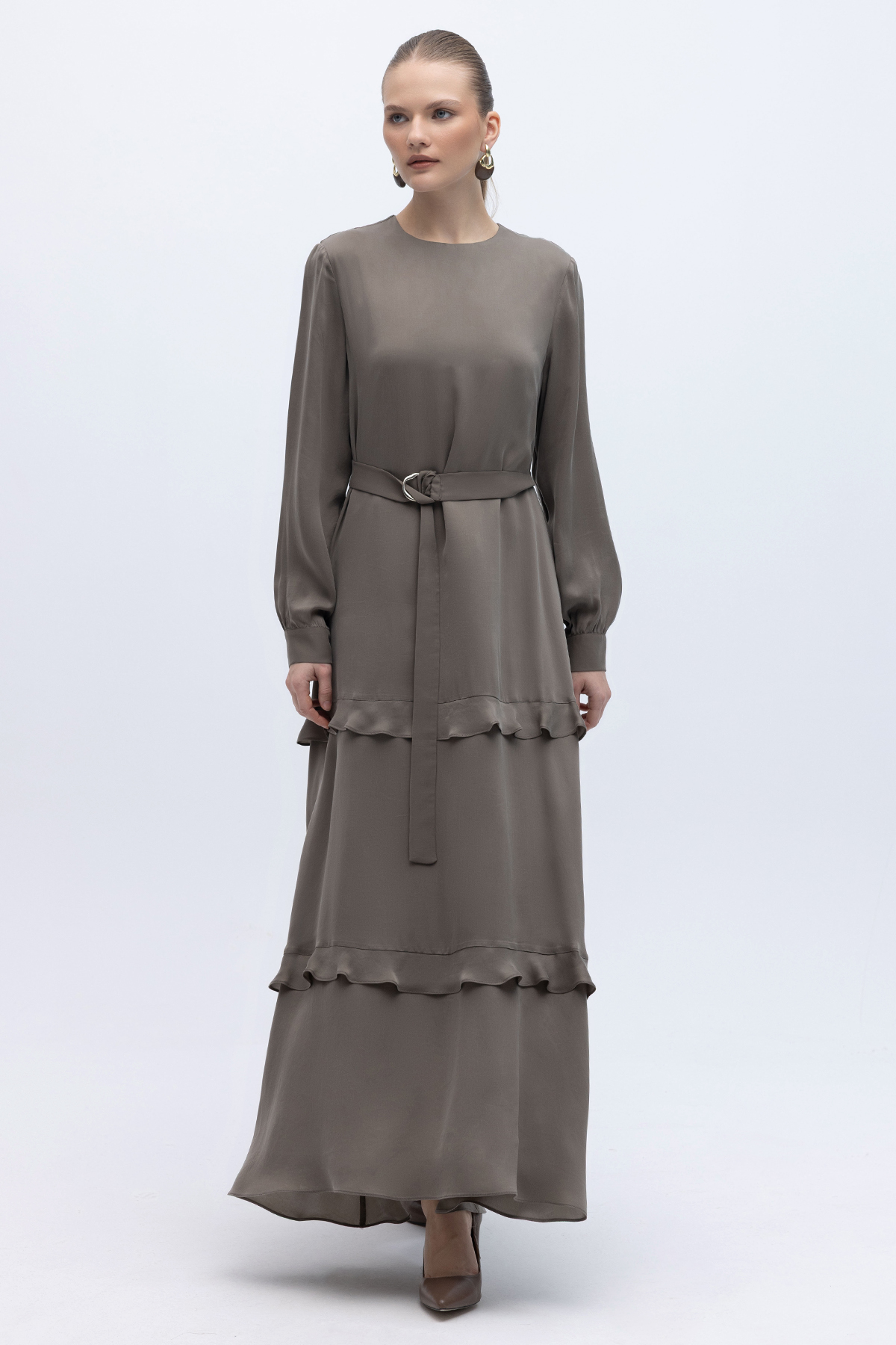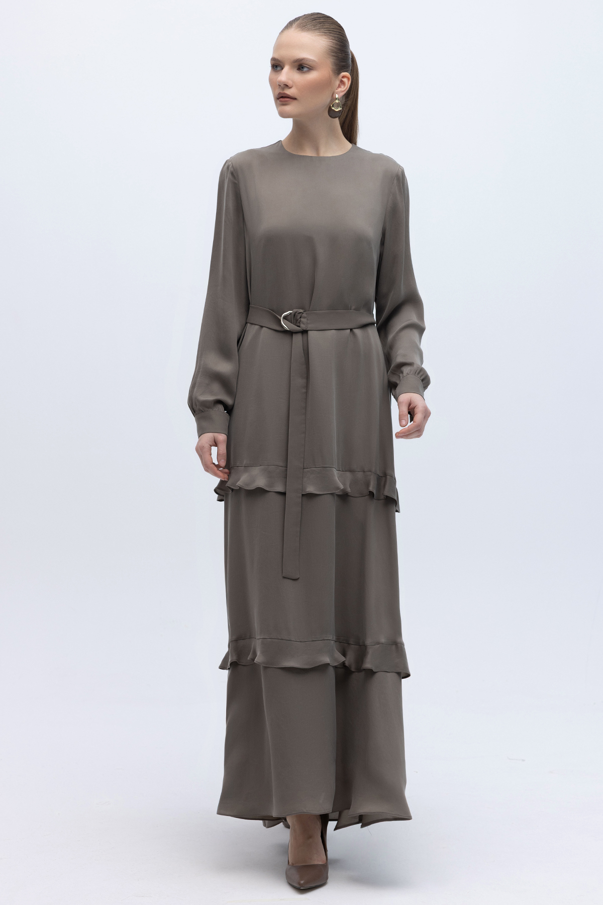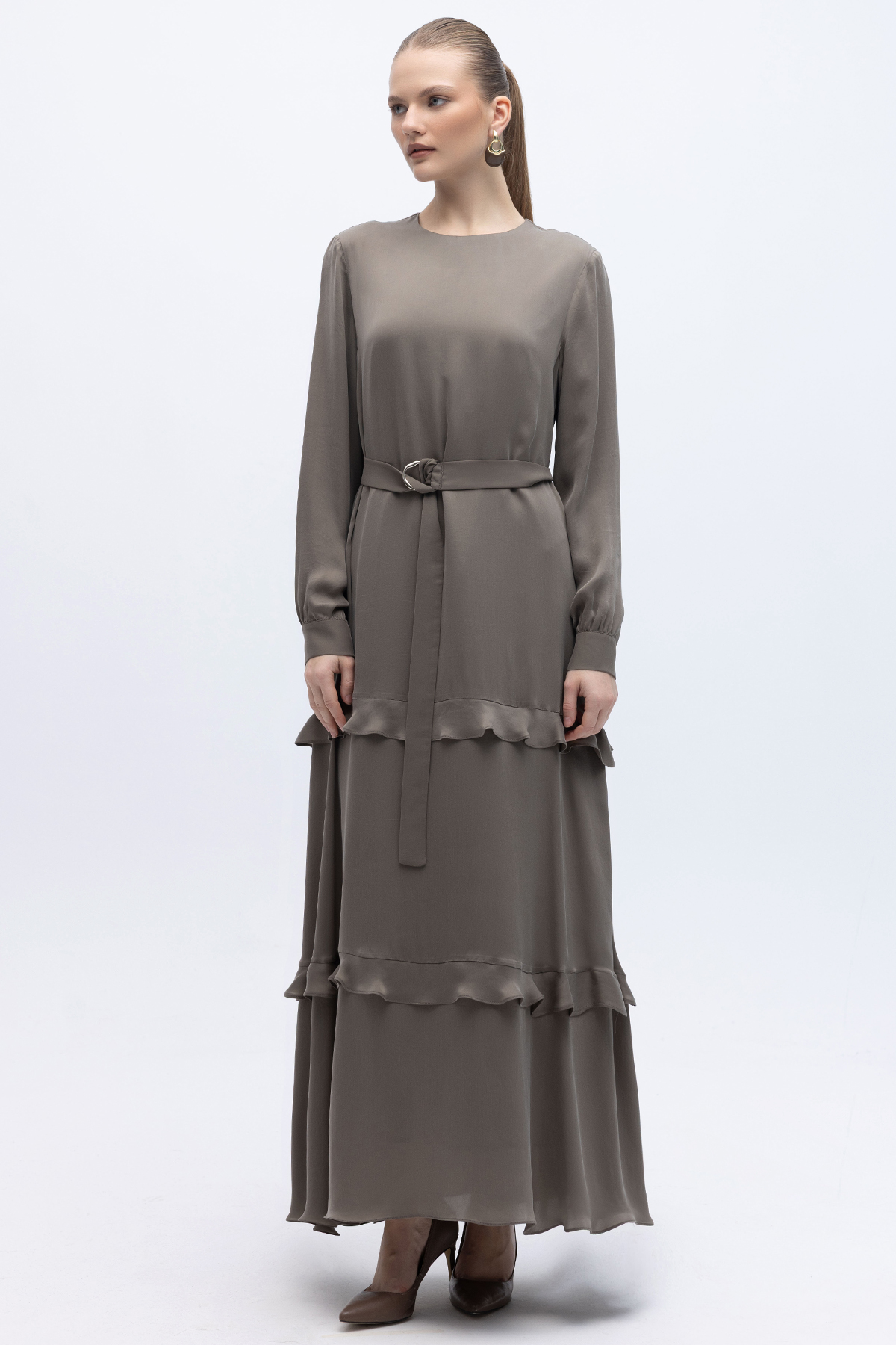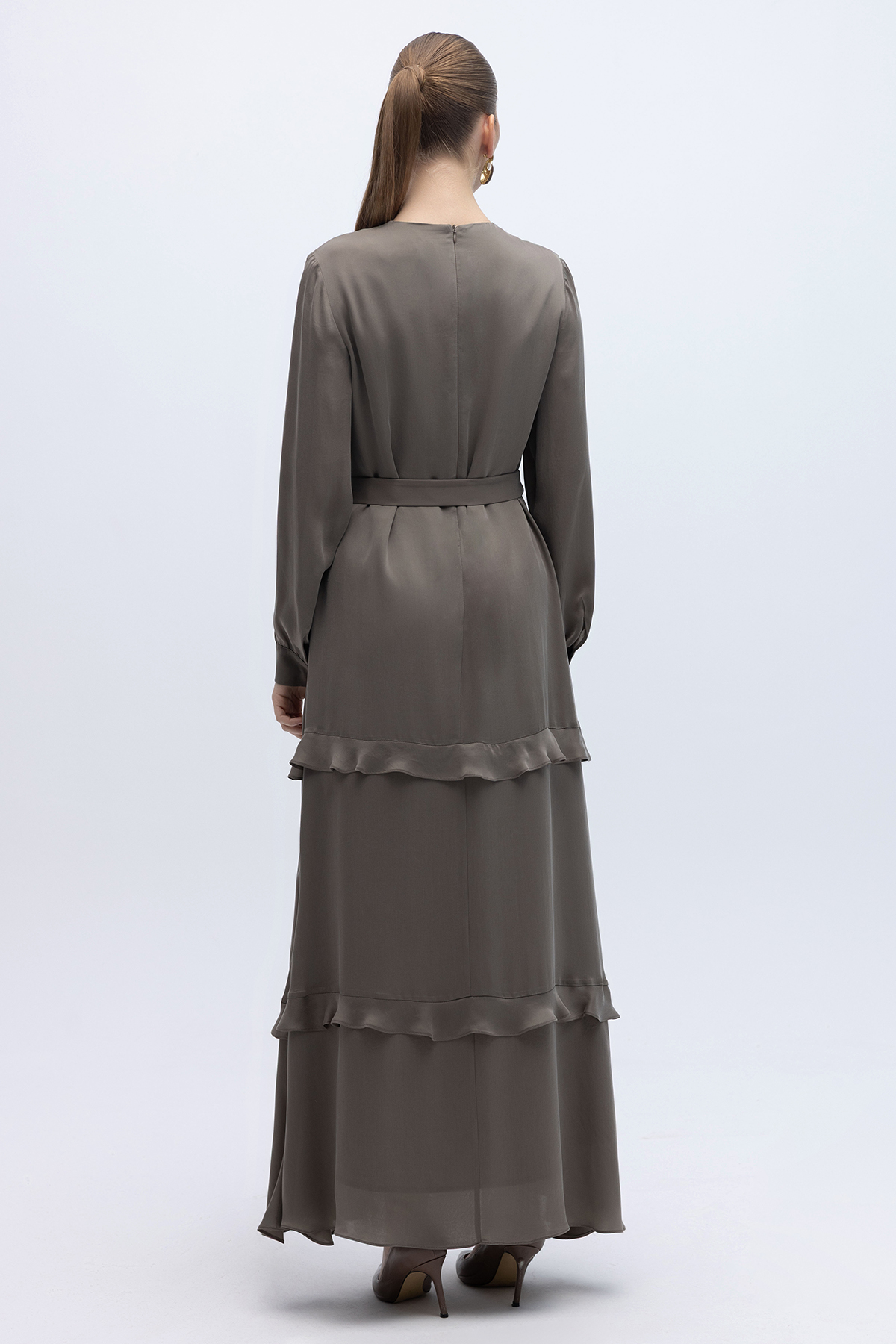 Fırfır Detaylı Uzun Cupro Elbise Mink