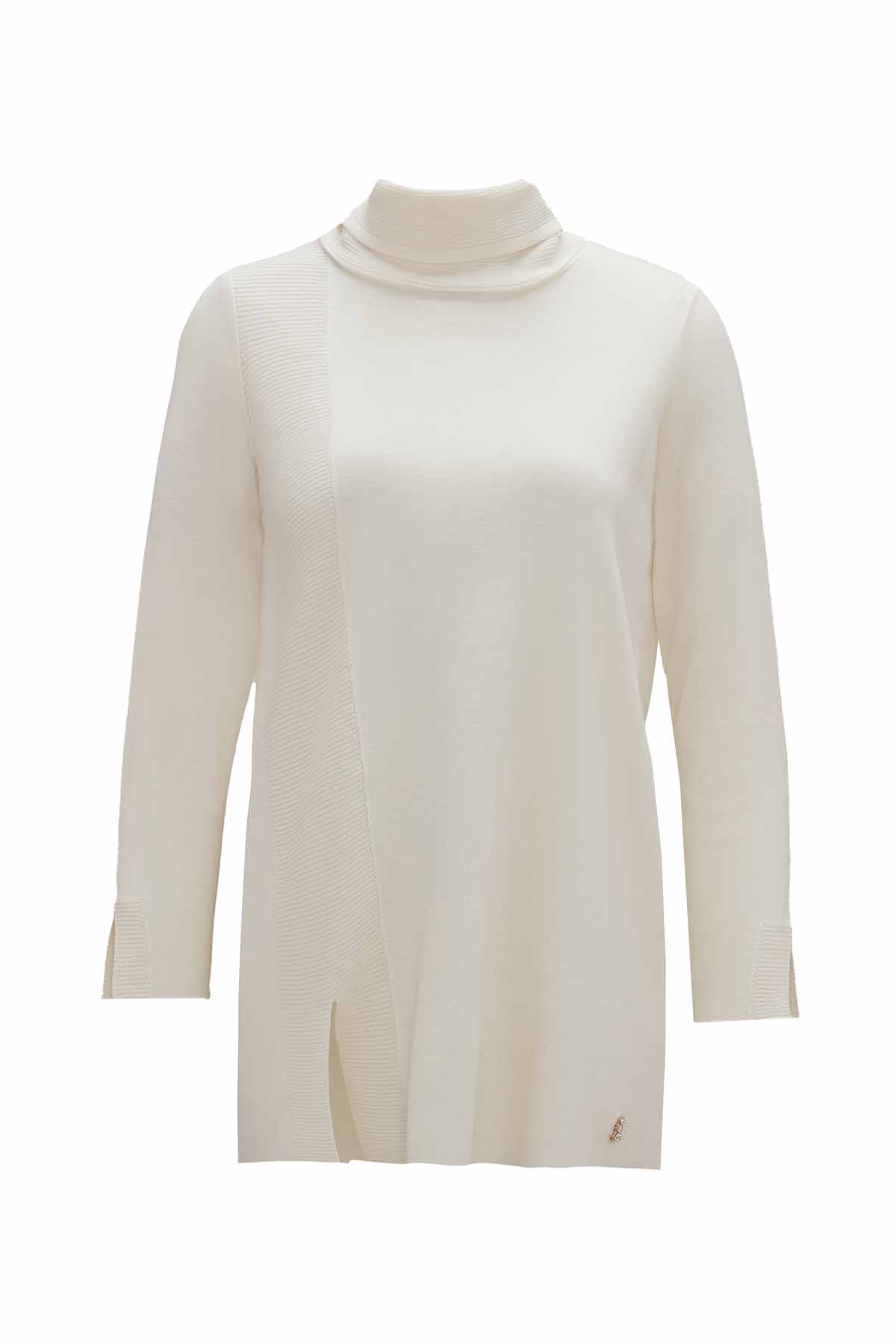 The ribbed knit turtleneck ecru tunic offers a soft and elegant look, perfect for layering or wearing on its own. Its minimal tone and cozy texture bring timeless sophistication to any outfit, designed by Miss Dalida for modern comfort.