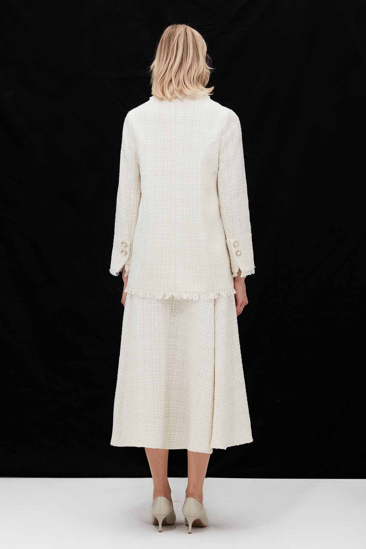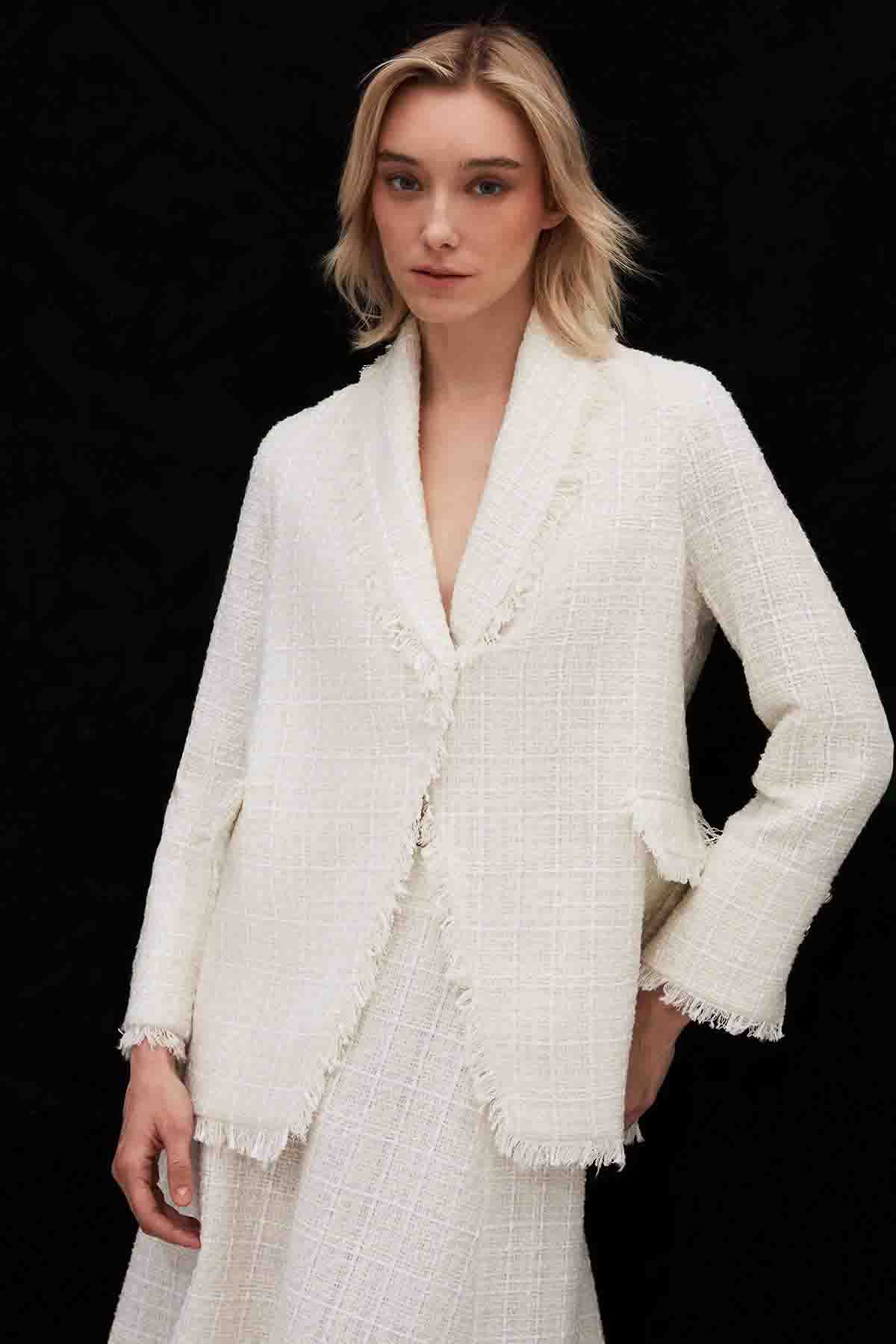 The Fringed Tweed Ecru Jacket blends timeless elegance with a modern twist. Its refined ecru color and delicate fringe details make it an ideal choice for a polished and feminine look from day to night.