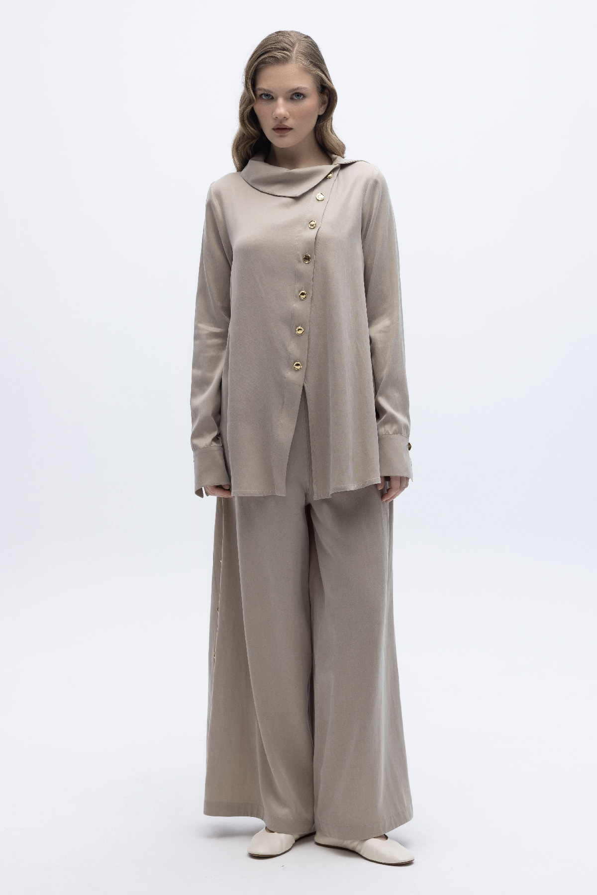 Geniş Paça İpek Keten Pantolon Bej
