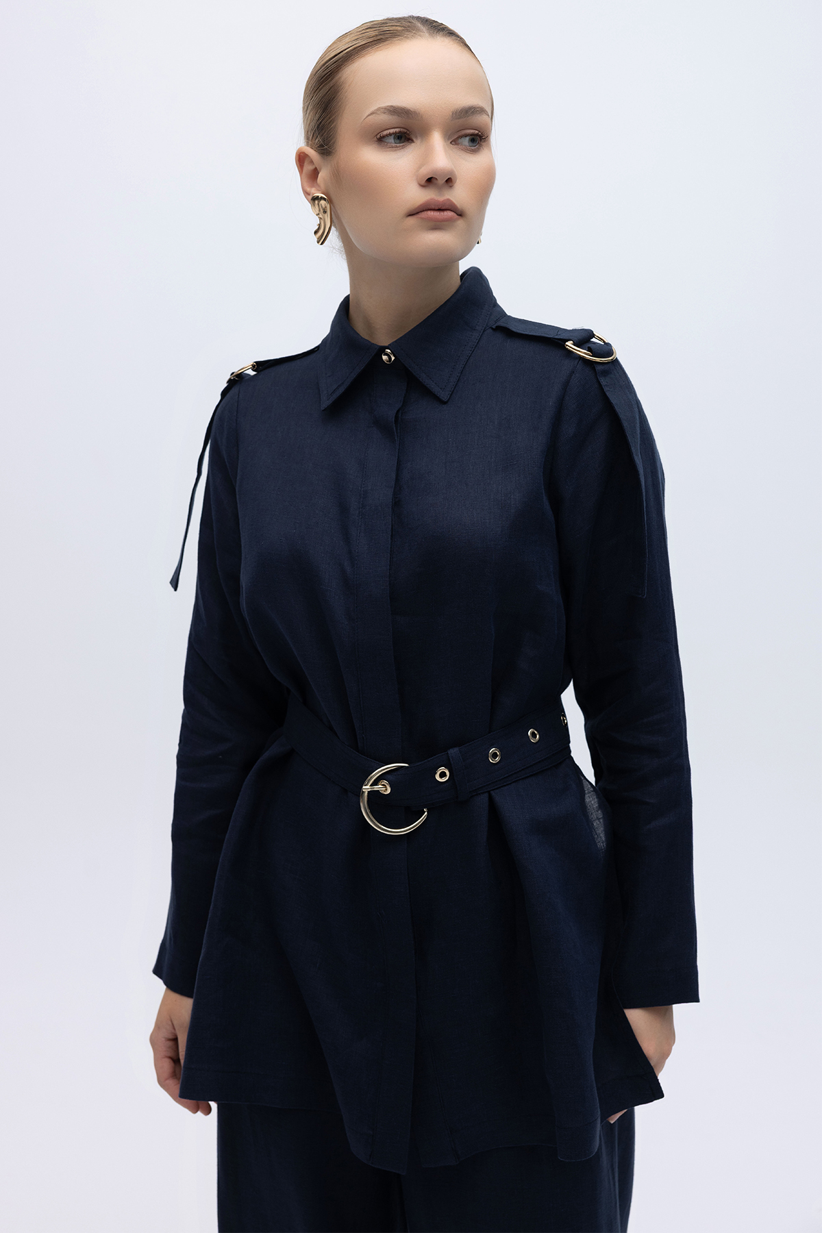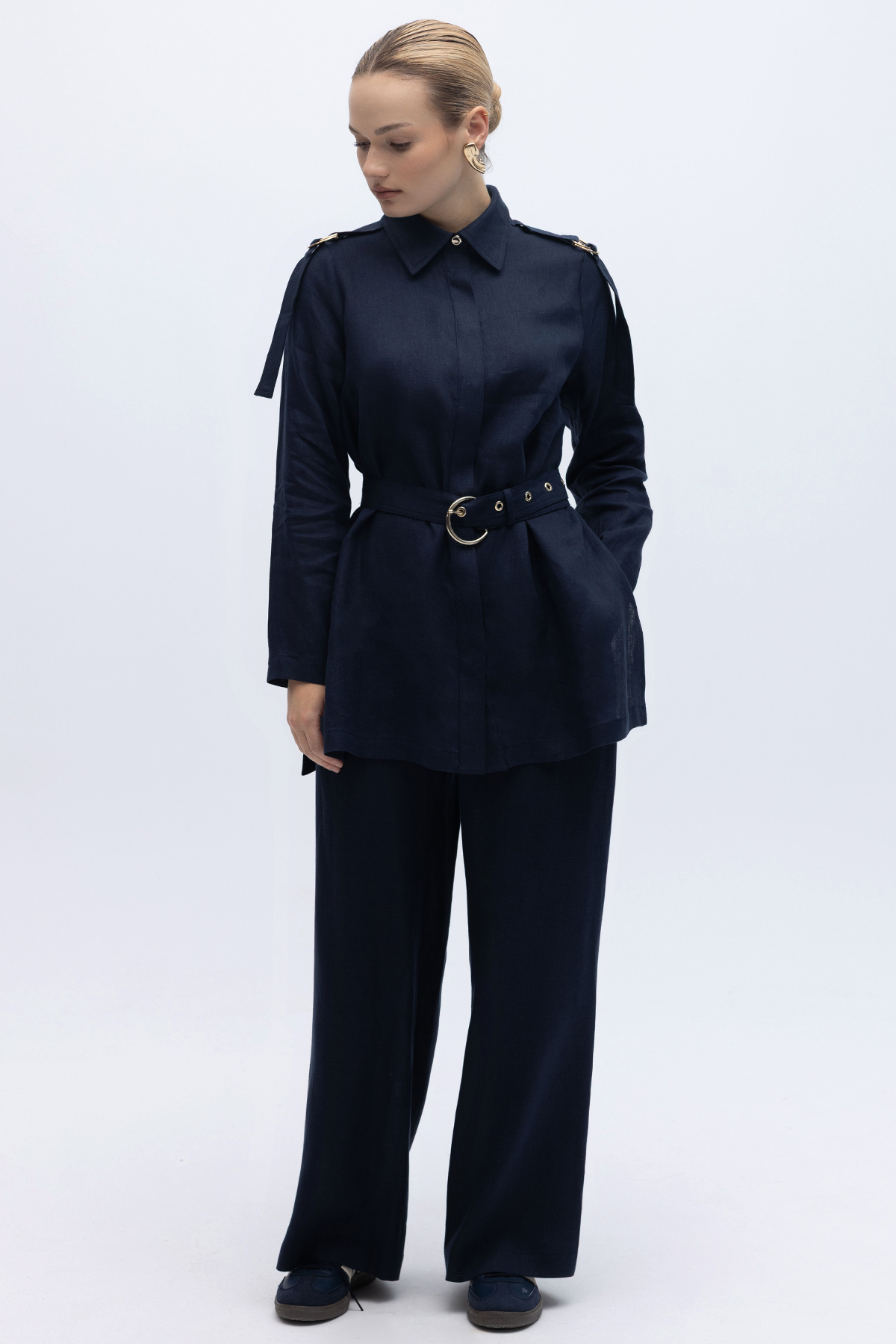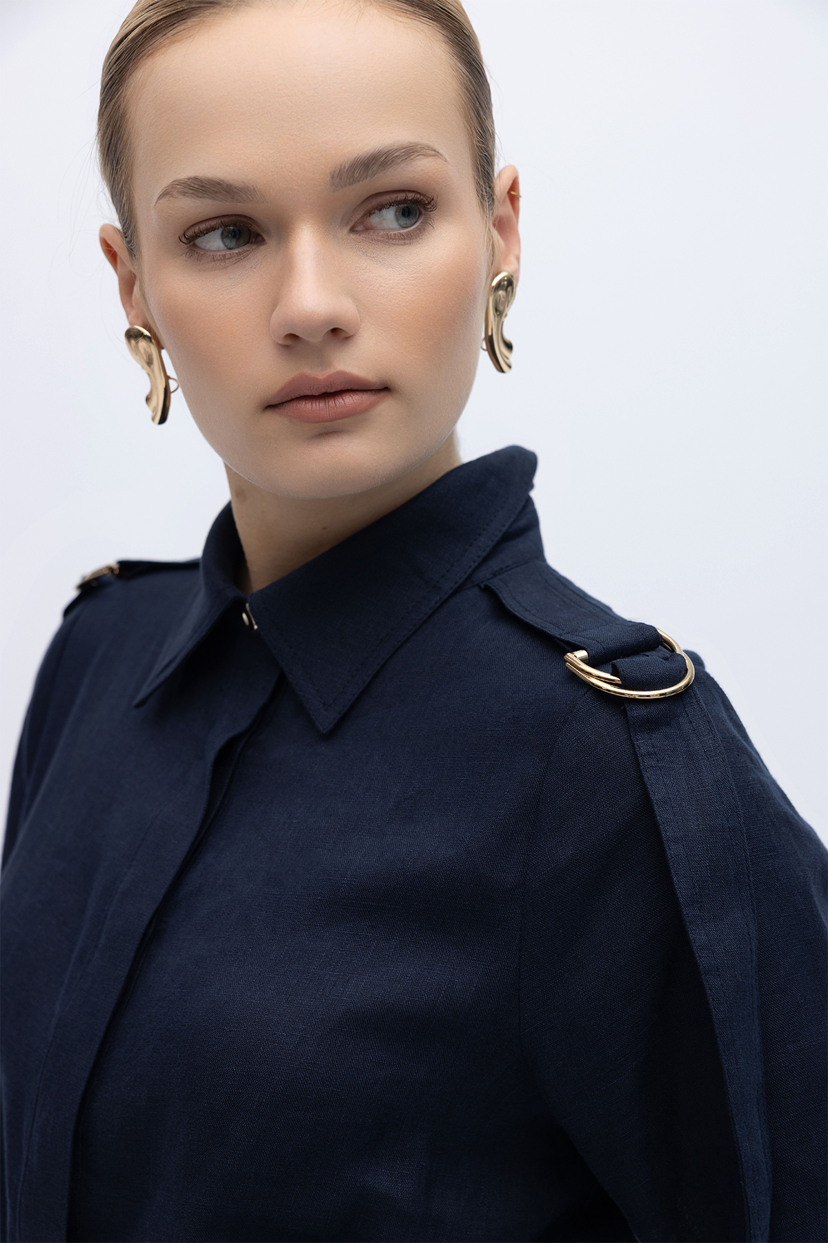 Gizli Patlı Omuz Detaylı Keten Gömlek Lacivert