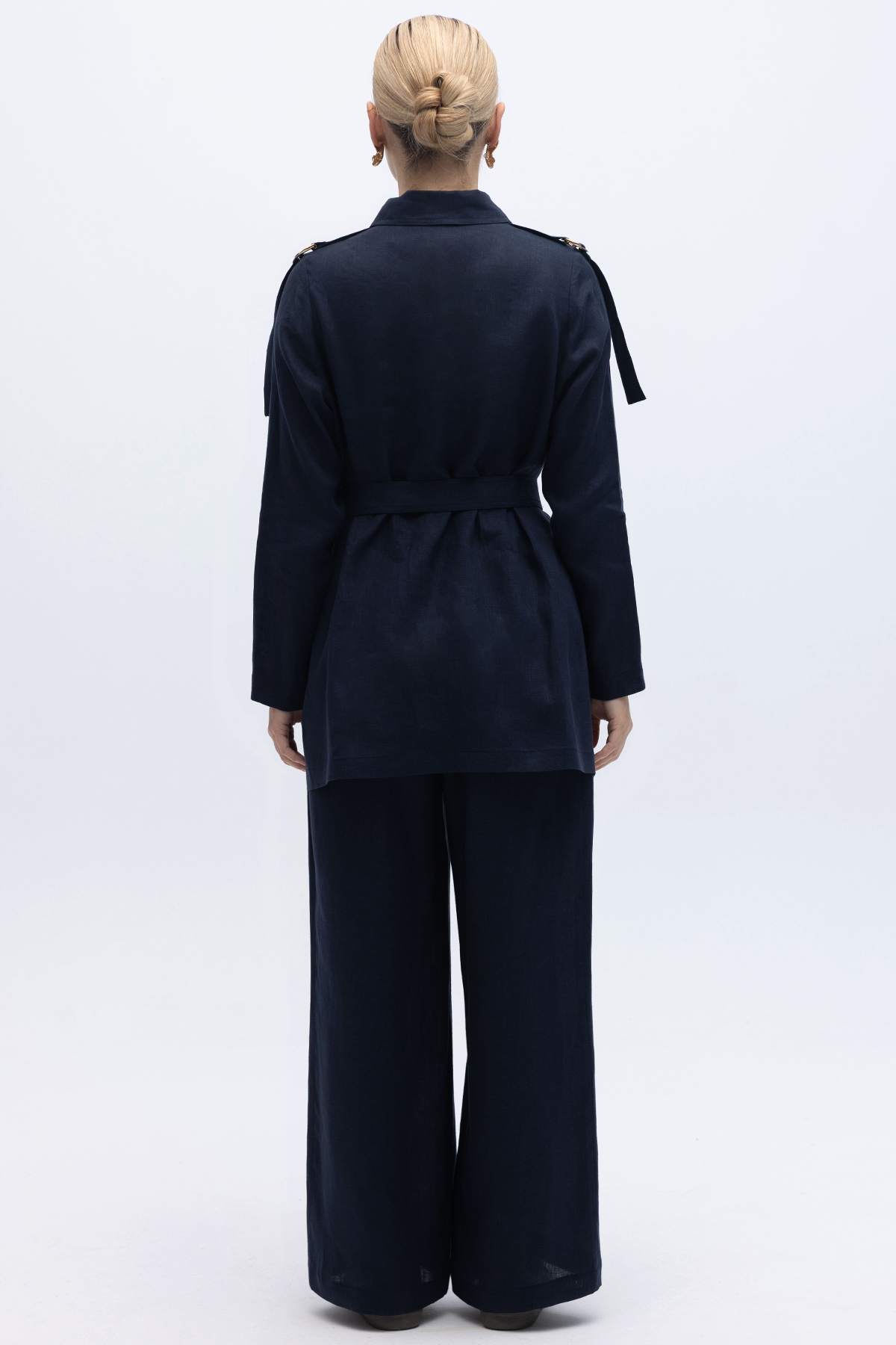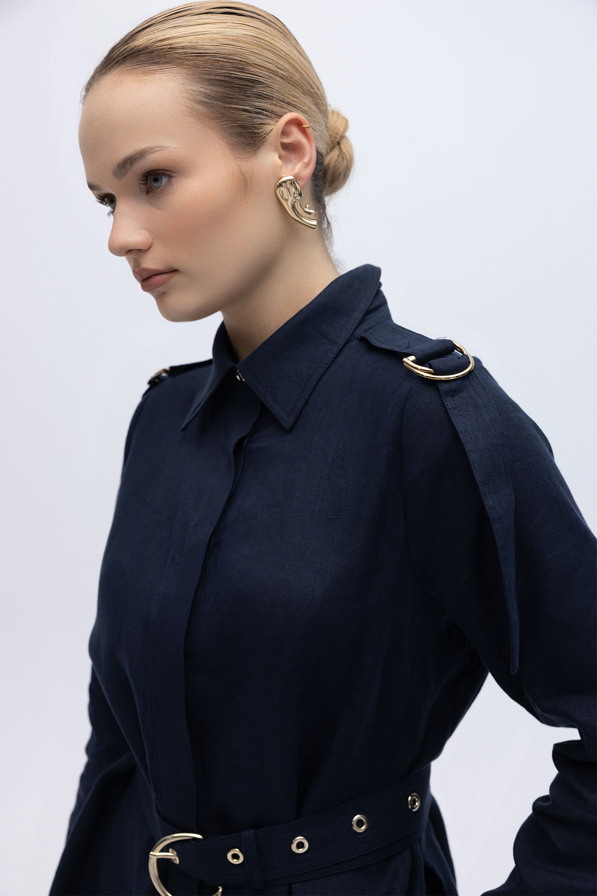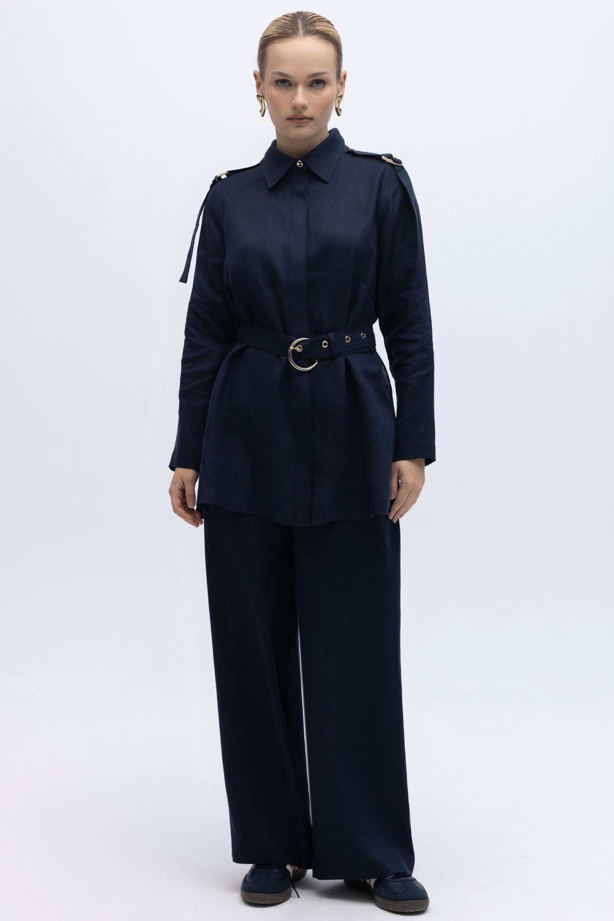 Gizli Patlı Omuz Detaylı Keten Gömlek Lacivert