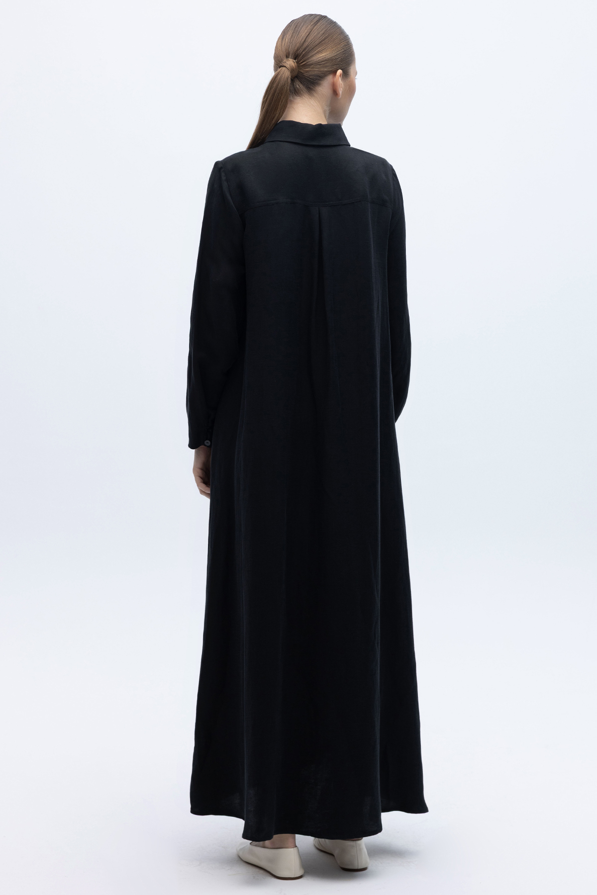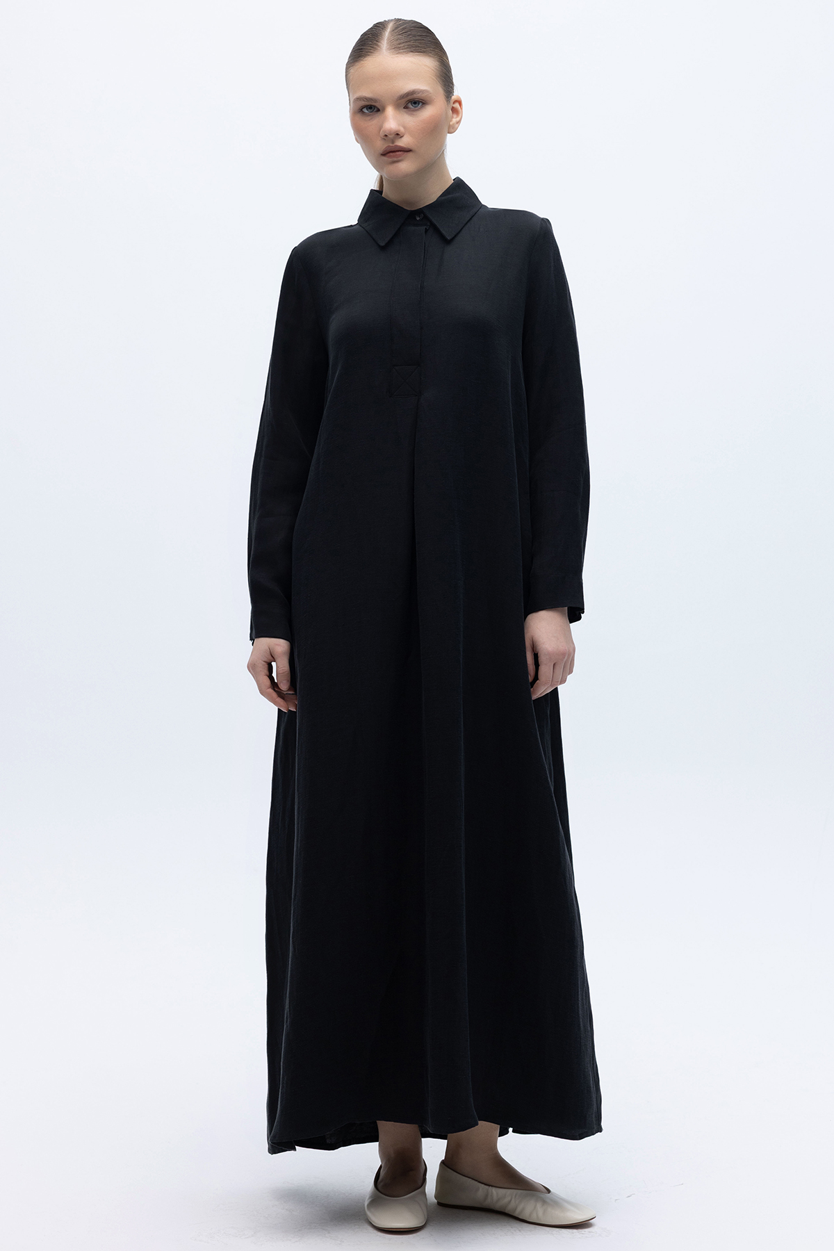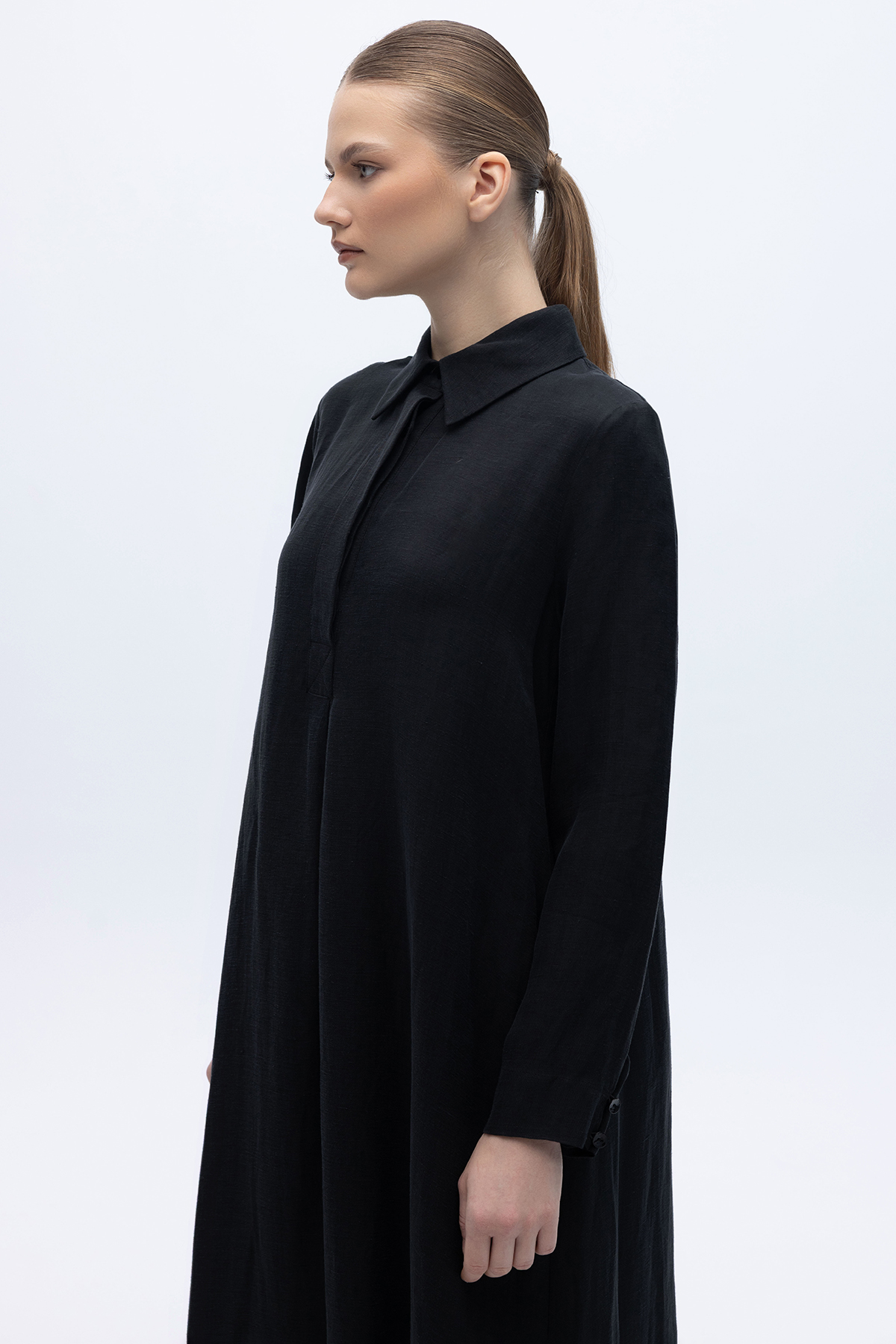 Gömlek Yaka İpek Keten Uzun Elbise Siyah