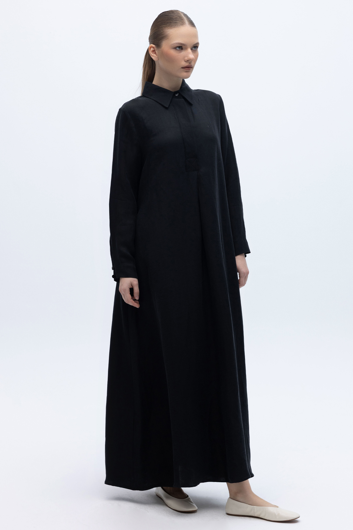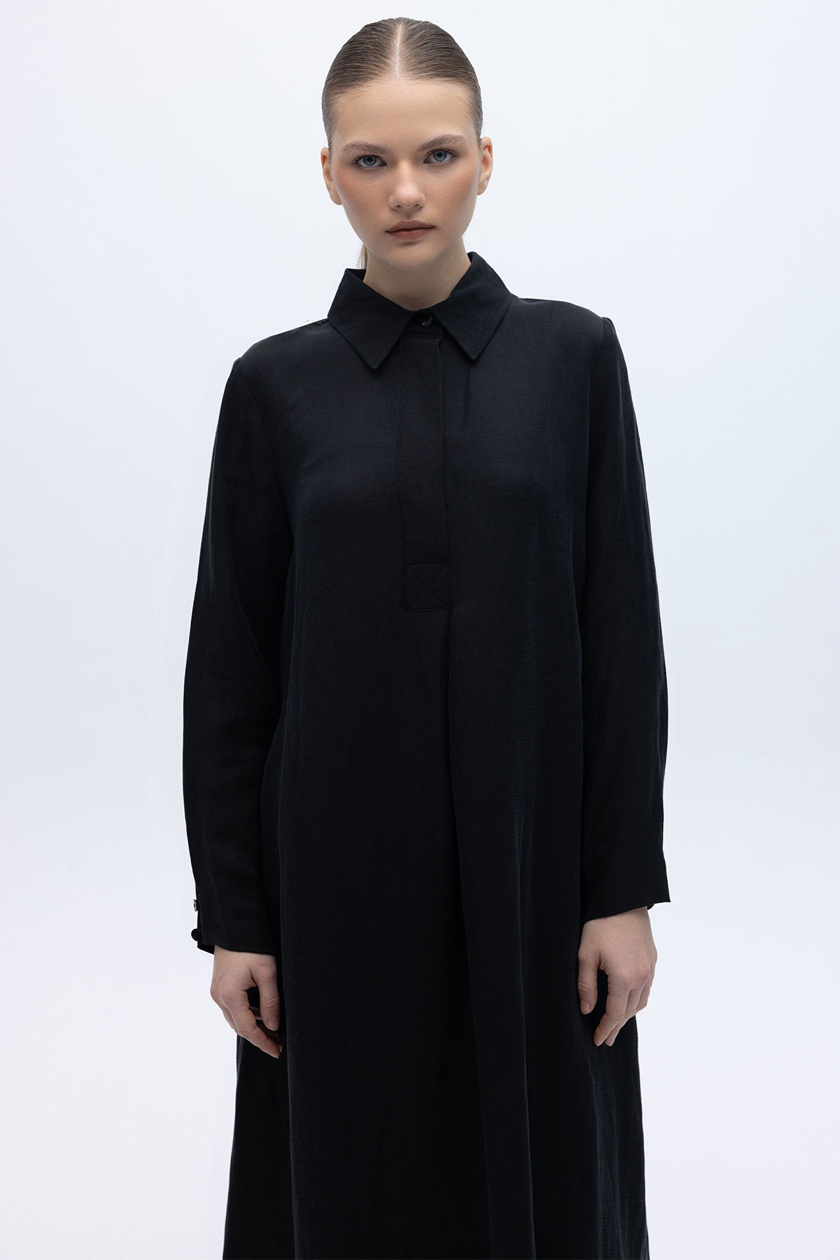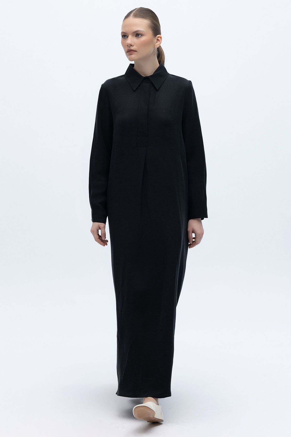 Gömlek Yaka İpek Keten Uzun Elbise Siyah