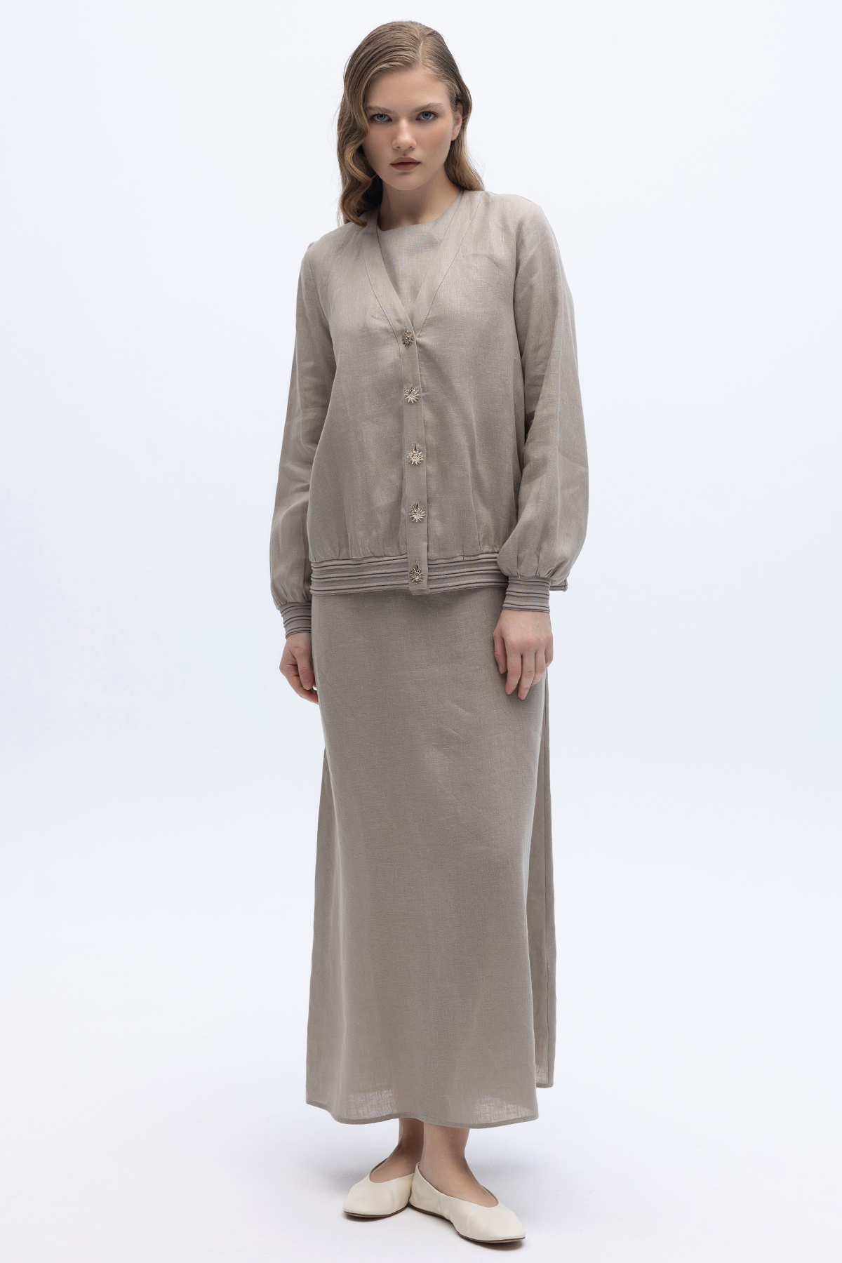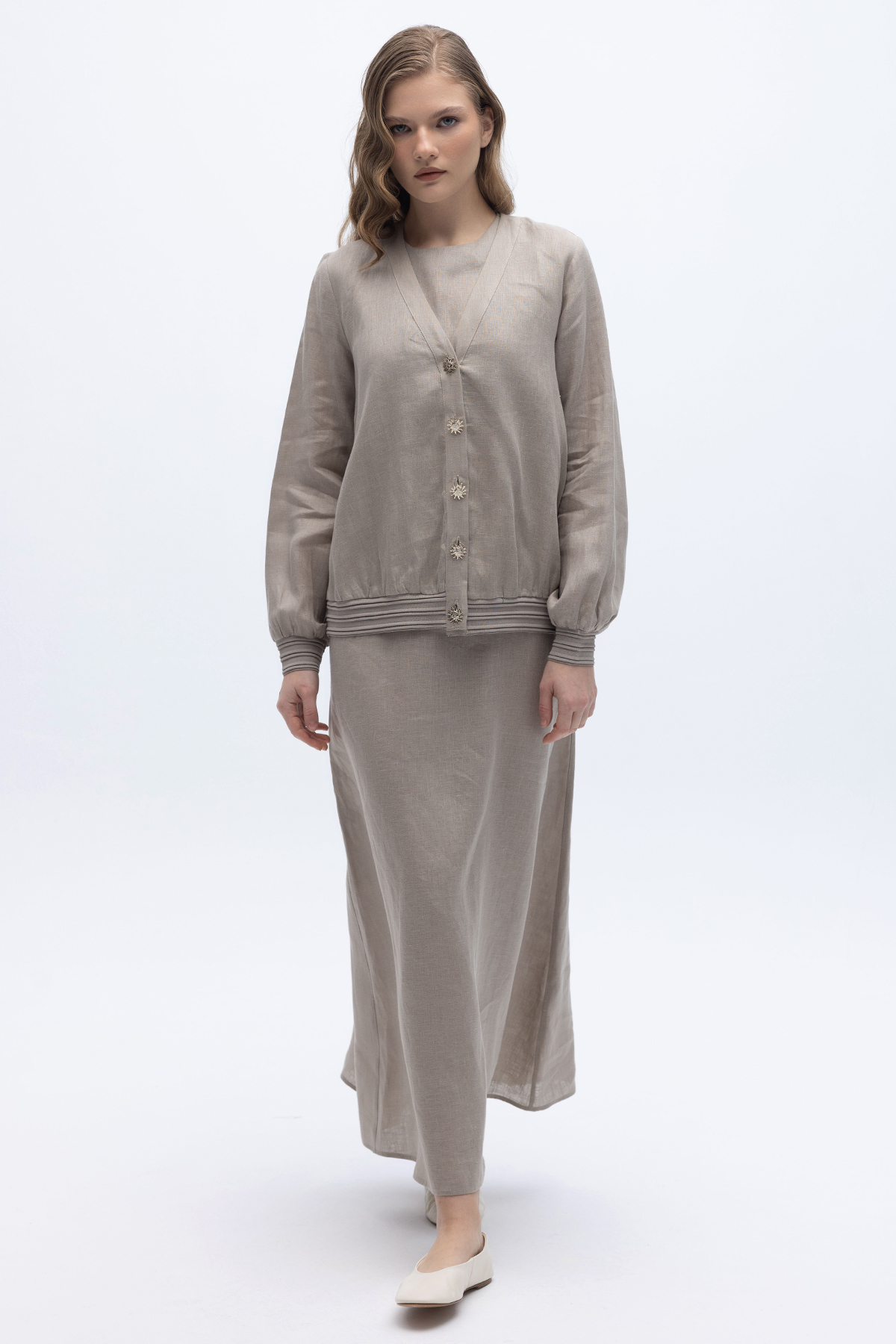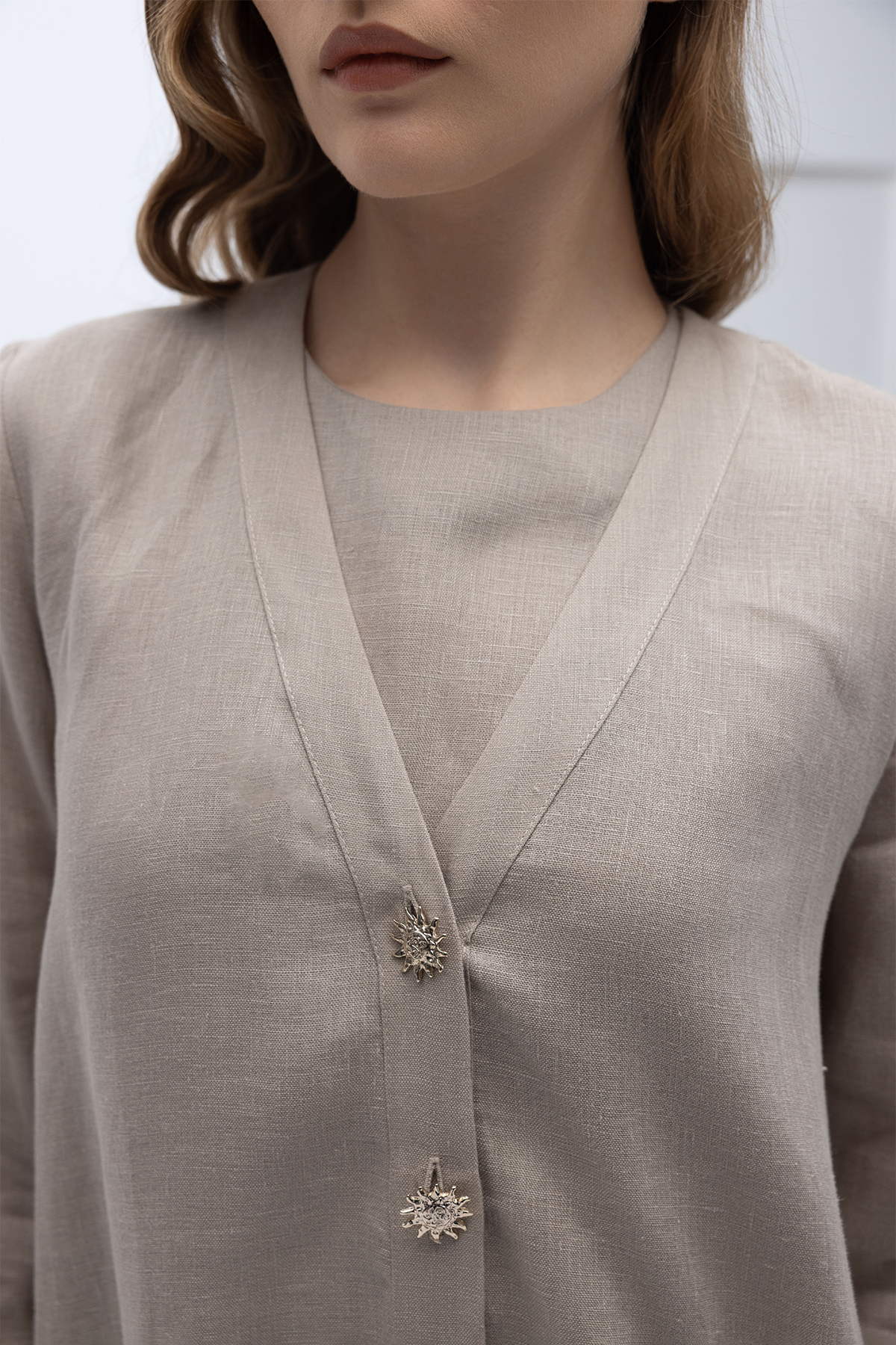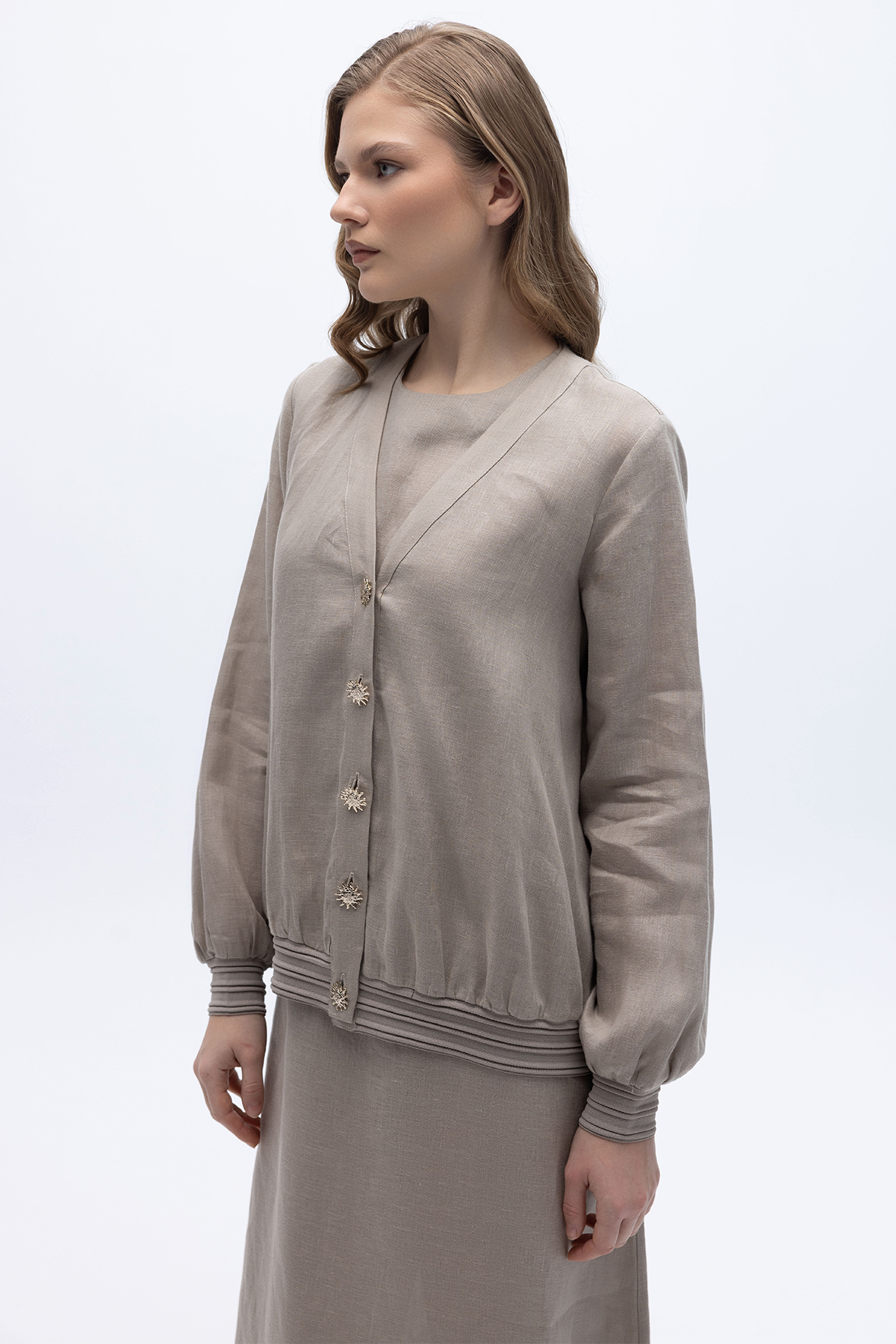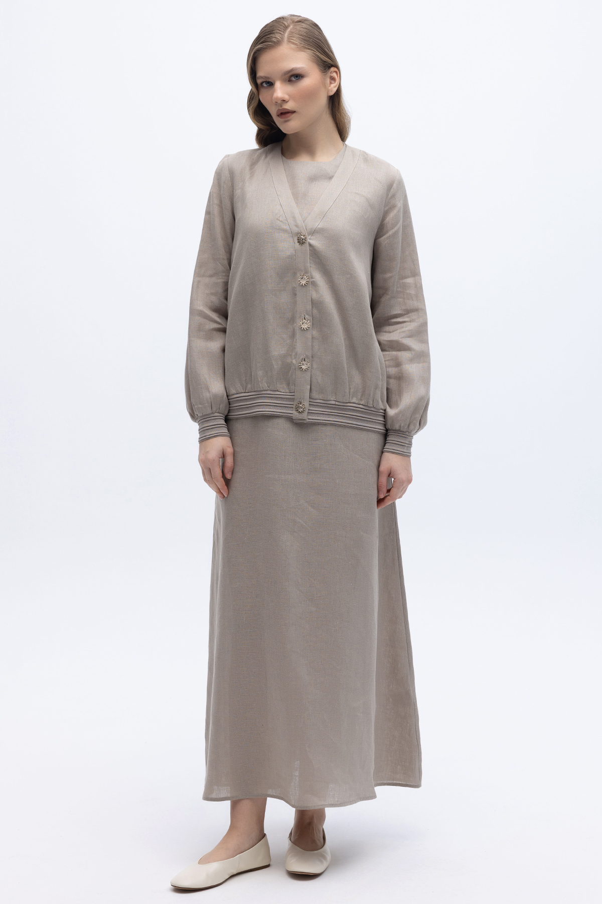 Güneş Düğmeli Elbise Ceket Keten Takım Stone