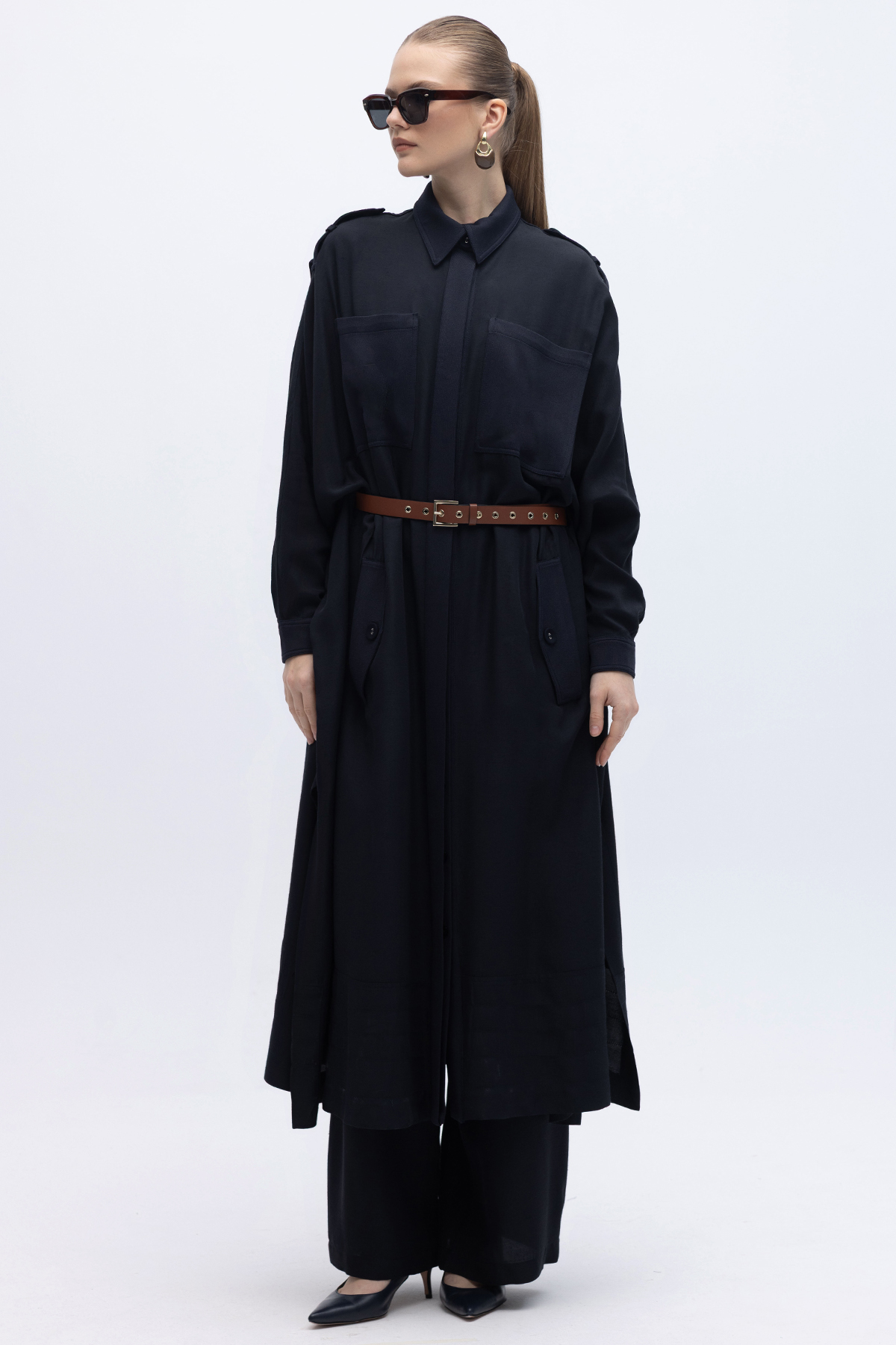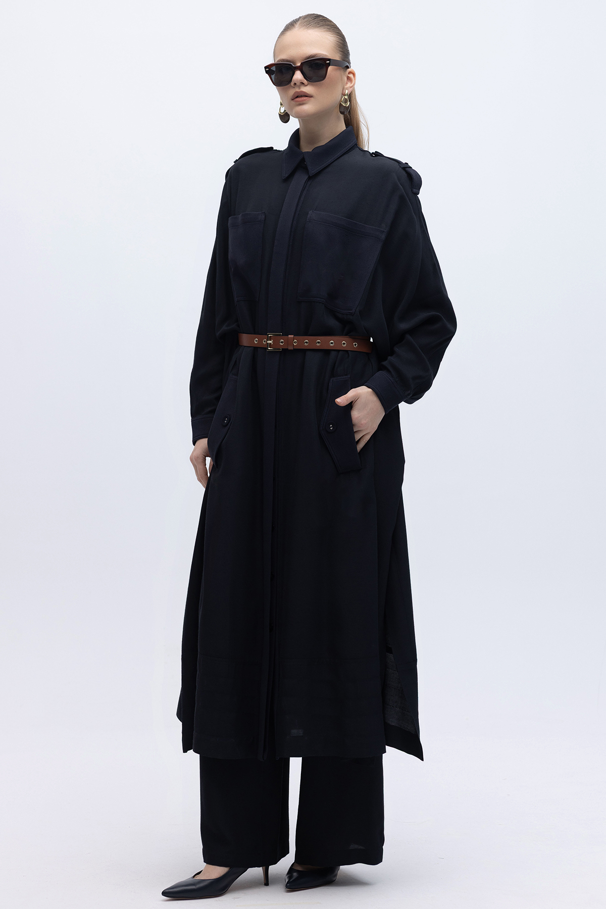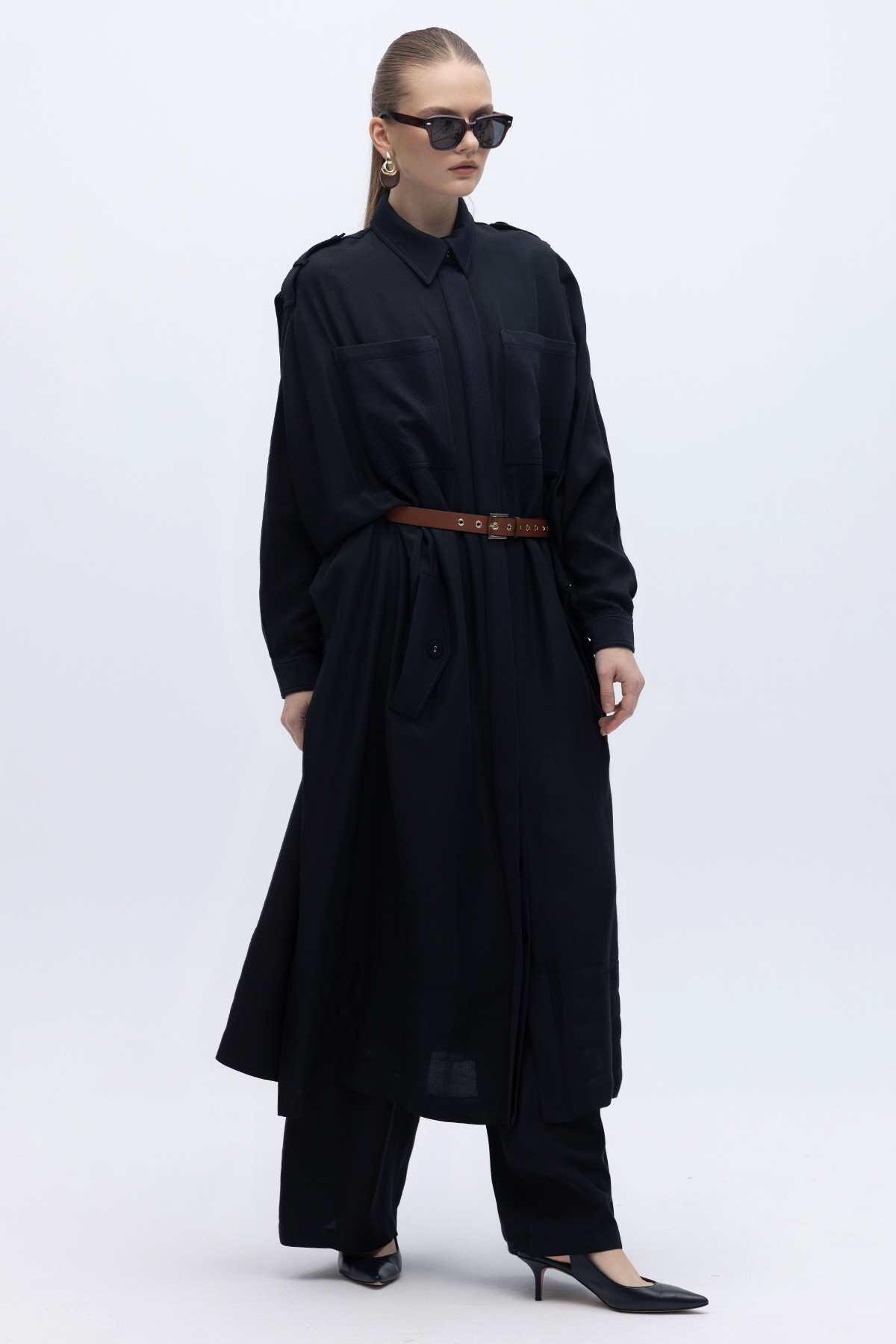 İpek Keten Cepli Uzun Panço Siyah