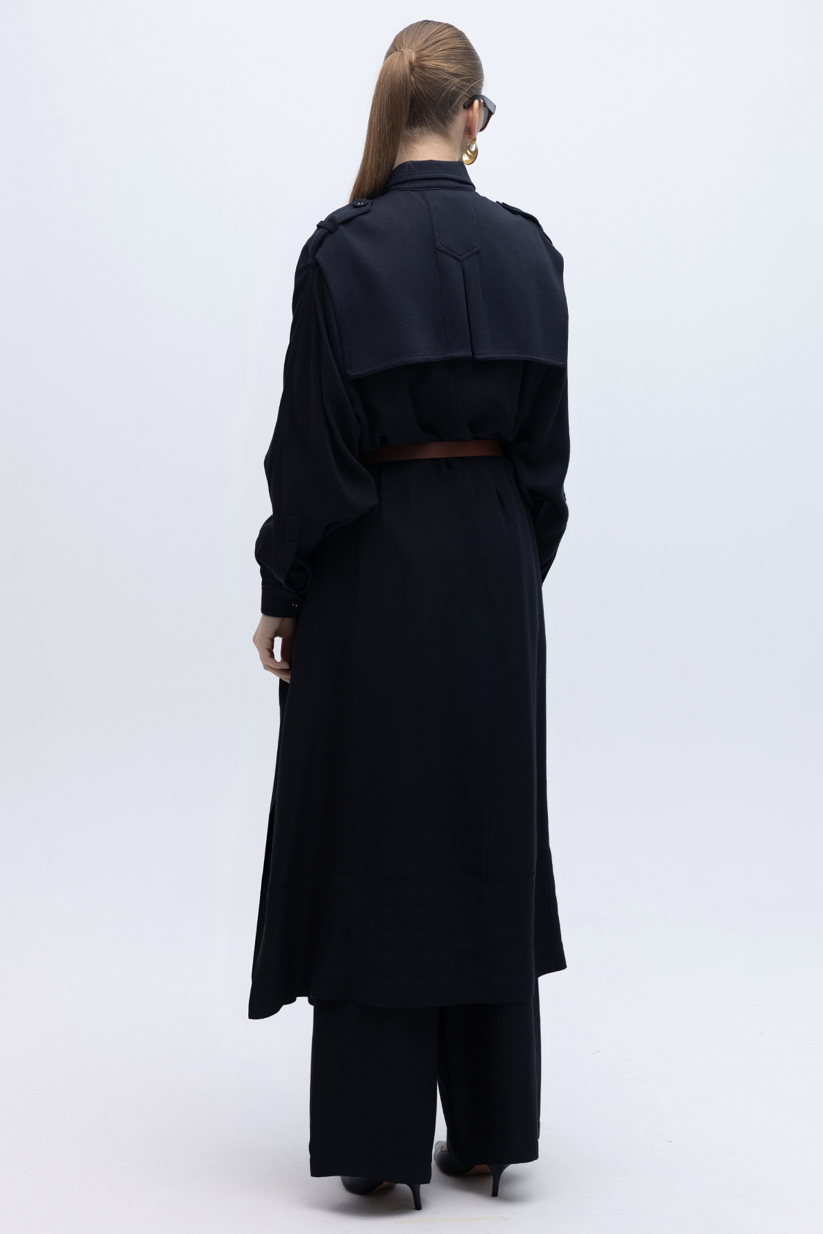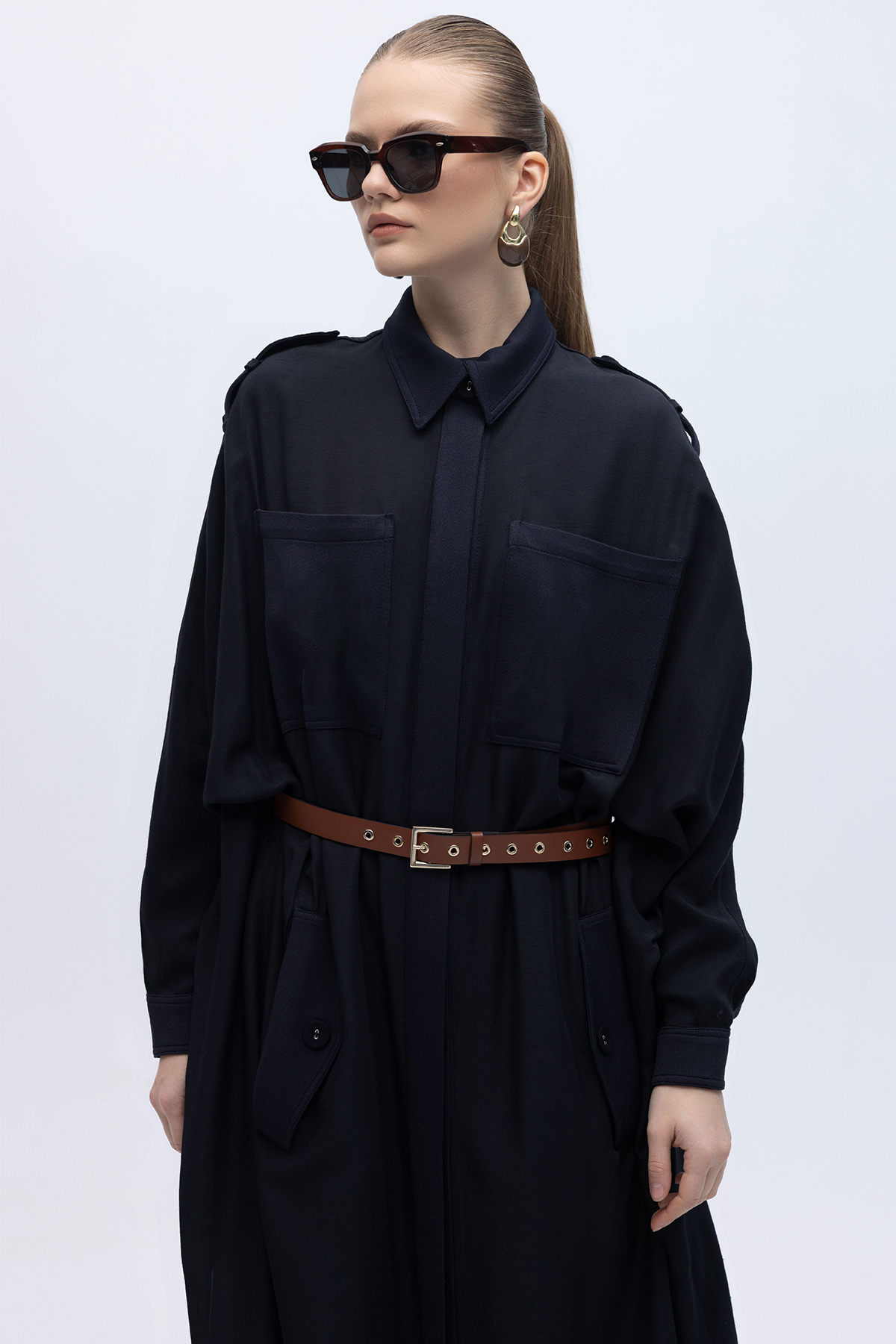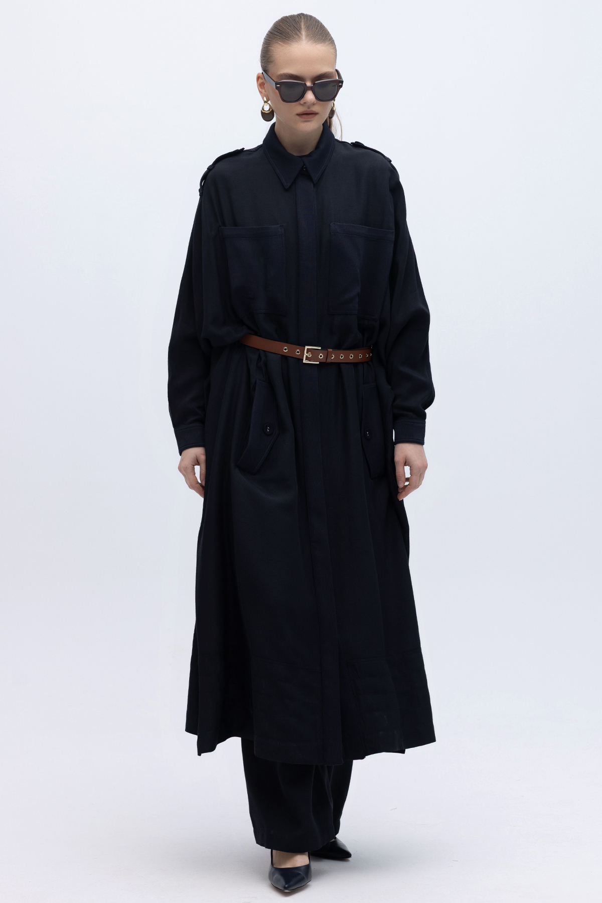 İpek Keten Cepli Uzun Panço Siyah