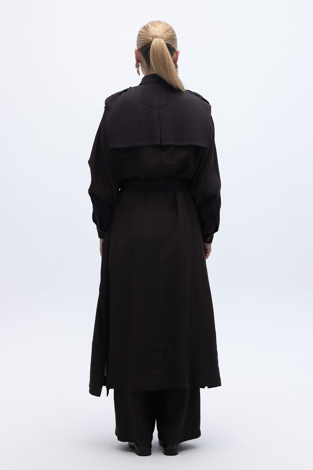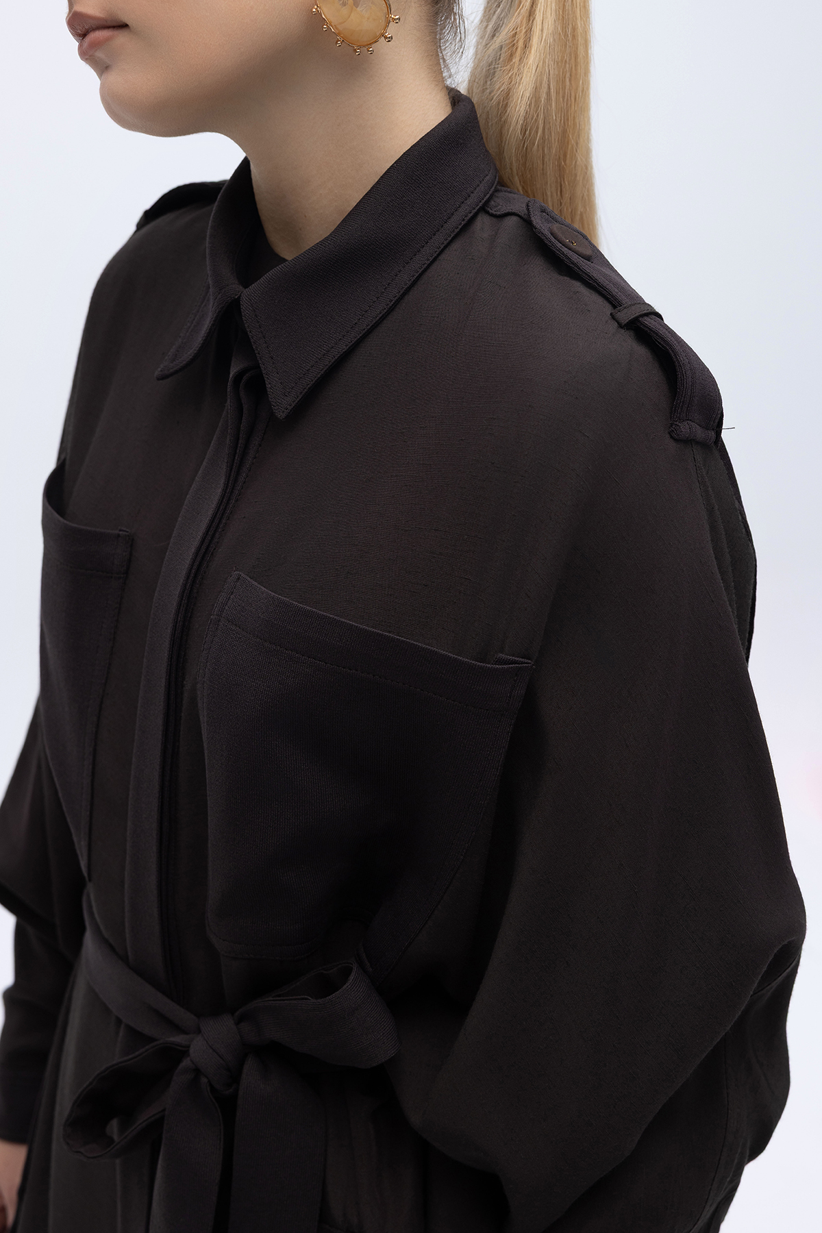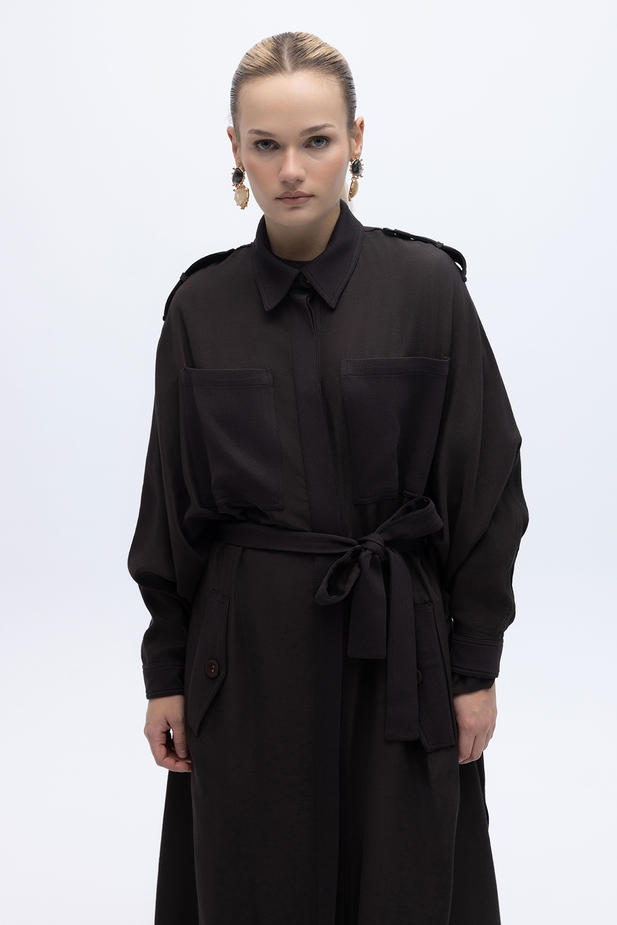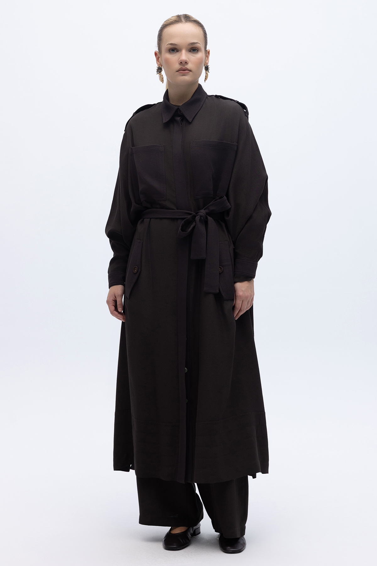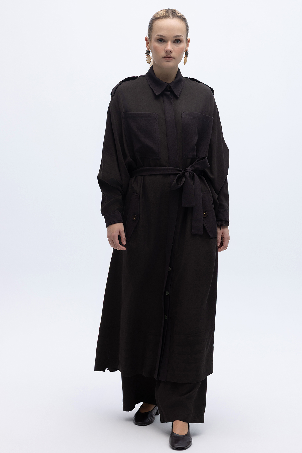 İpek Keten Cepli Uzun Panço Kahverengi
