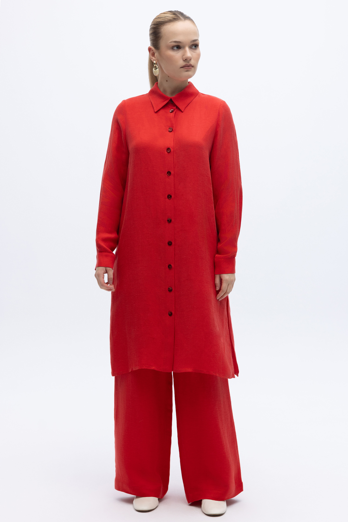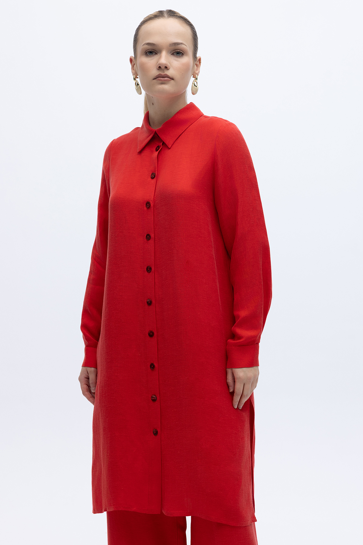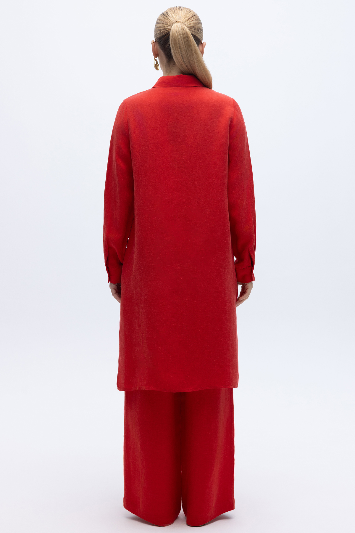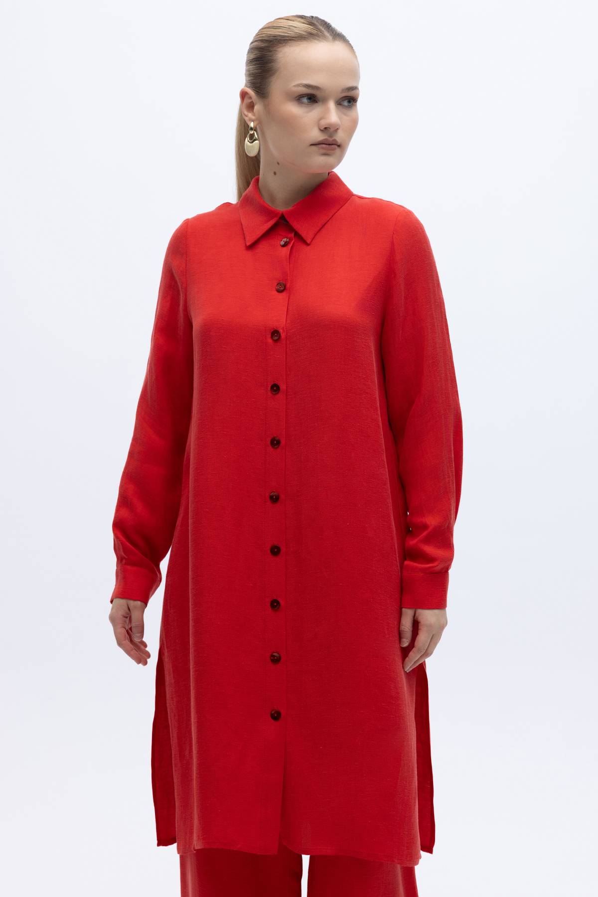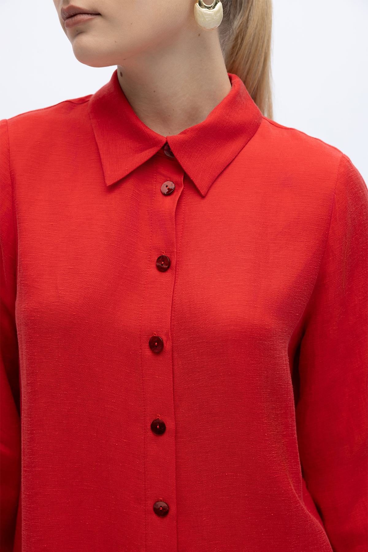 İpek Keten Uzun Gömlek Kırmızı