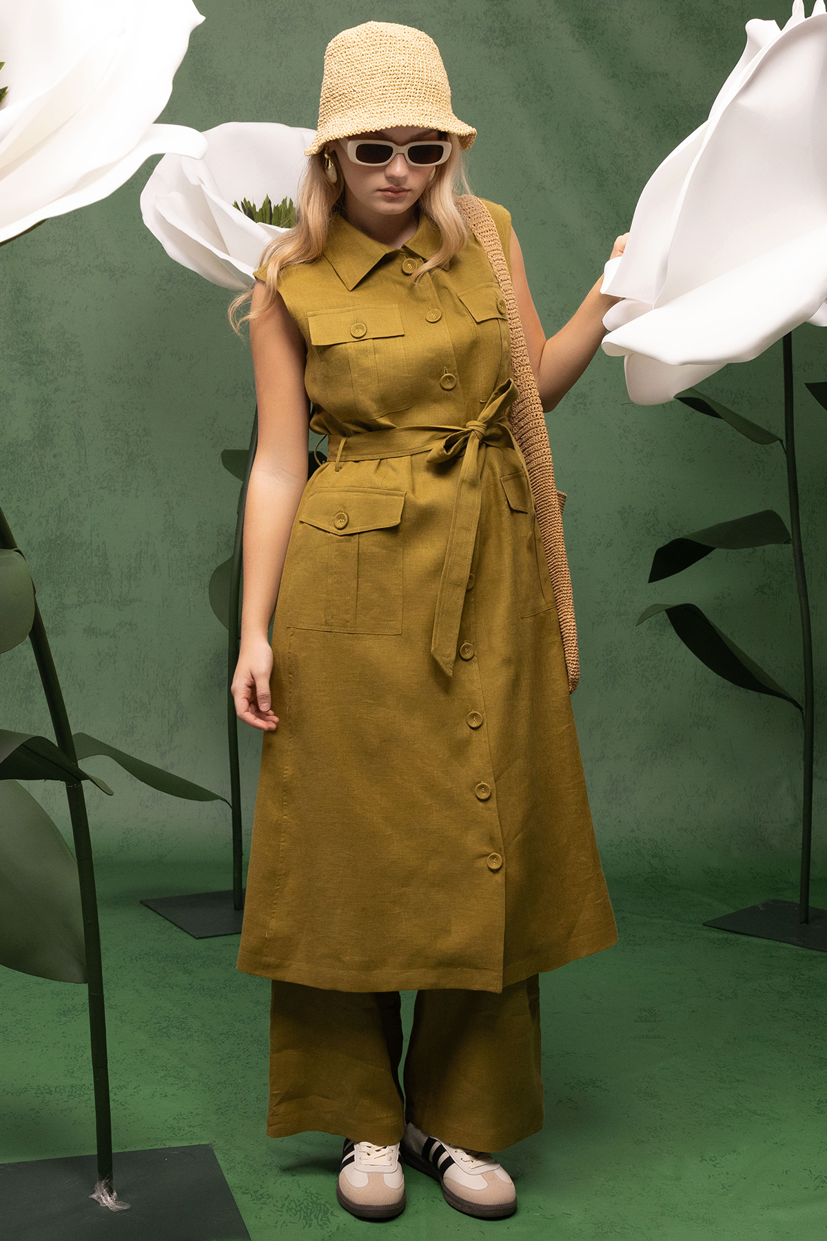 Beli Kuşaklı Bol Paça Pantolon Haki